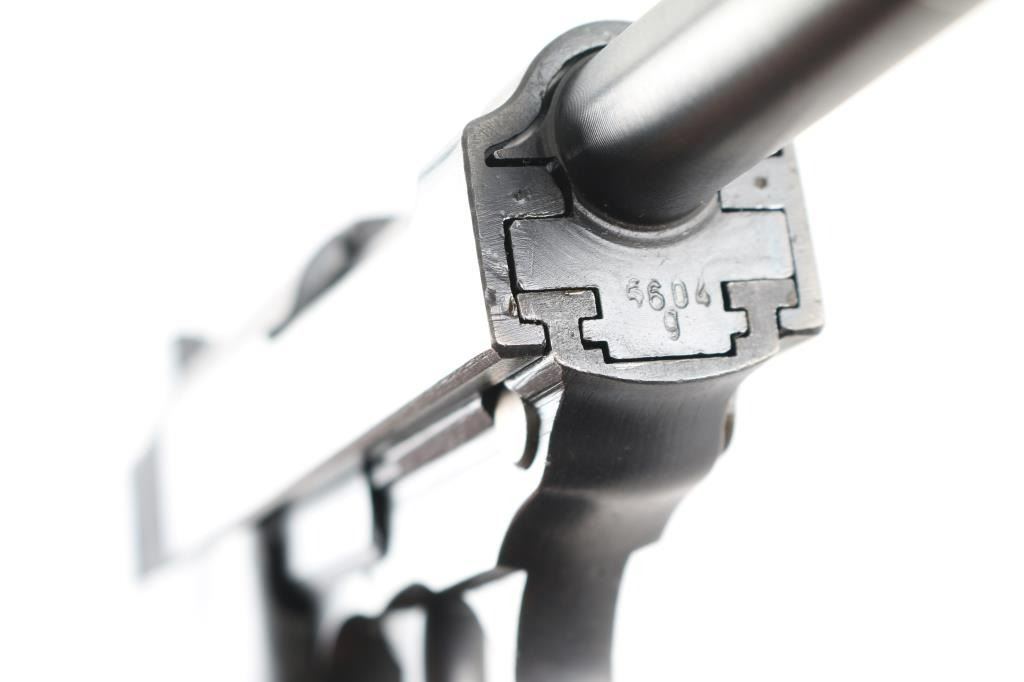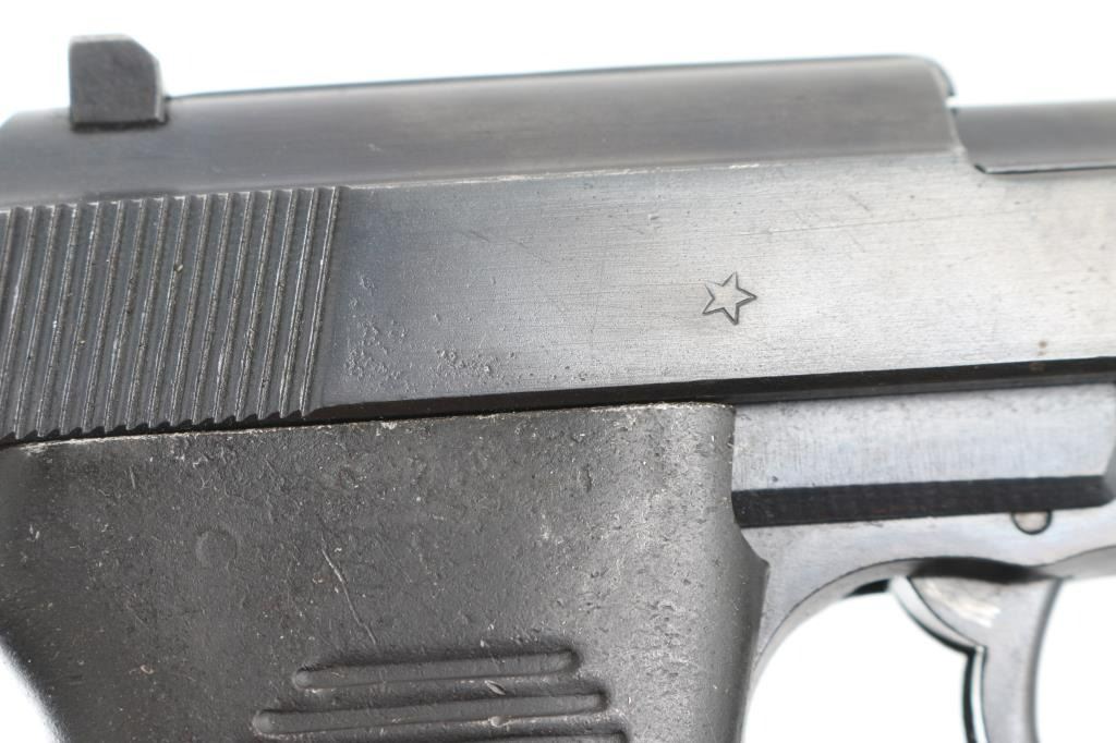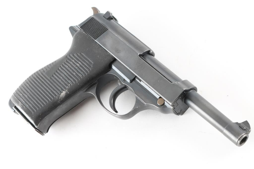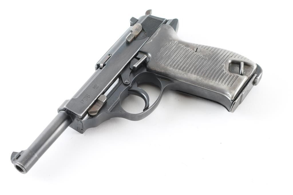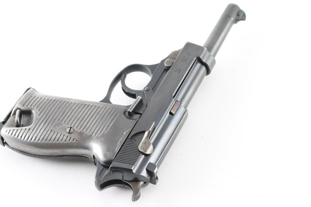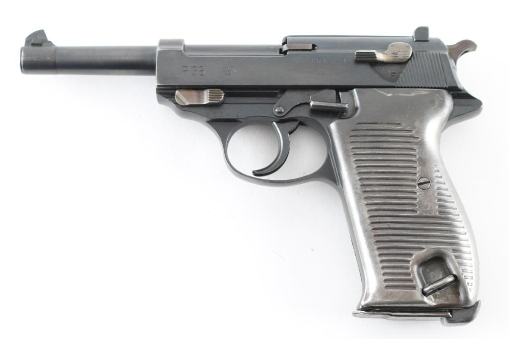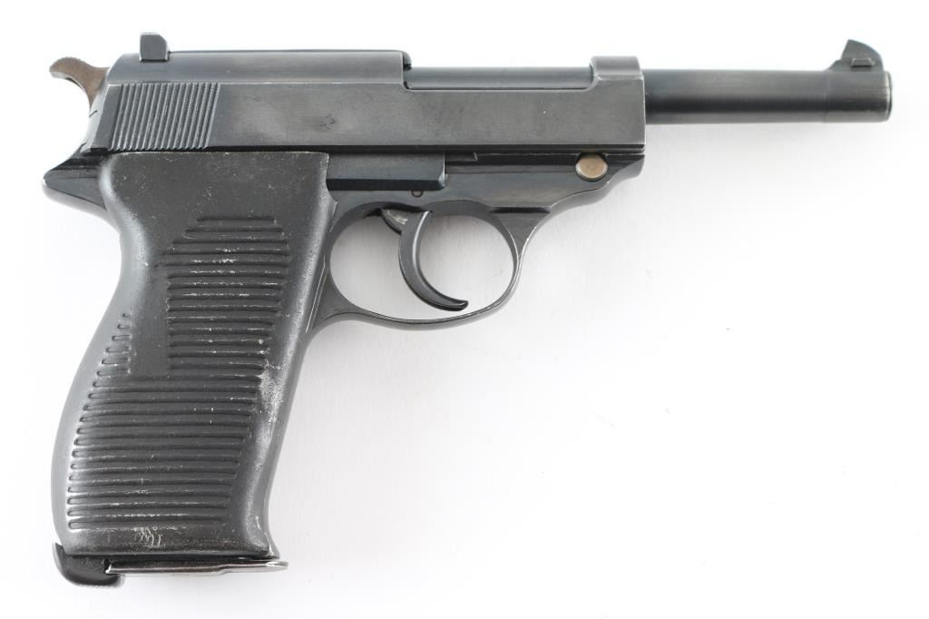 Pistol. Semi-Automatic. 8-rd magazine. Third Reich era Military issued sidearm. 4.9" barrel. Short recoil hinged locking piece assisted breechblock. Matched serial numbers, including locking block. Waffenamts. This pistol has seen use with the post-war French army as it has the five-pointed star stamp on the right slide. French assembled with Mauser parts (g after serial number) blue finish. Bore appears very good/bright, strong rifling. French metal "Gray Ghost" style grips are very good. Blue finish is about 97%, some minor scratches, and muzzle wear. Original magazine stamped P.38 v . A rare pistol. NRA Condition-Very Good. C&R Firearm.