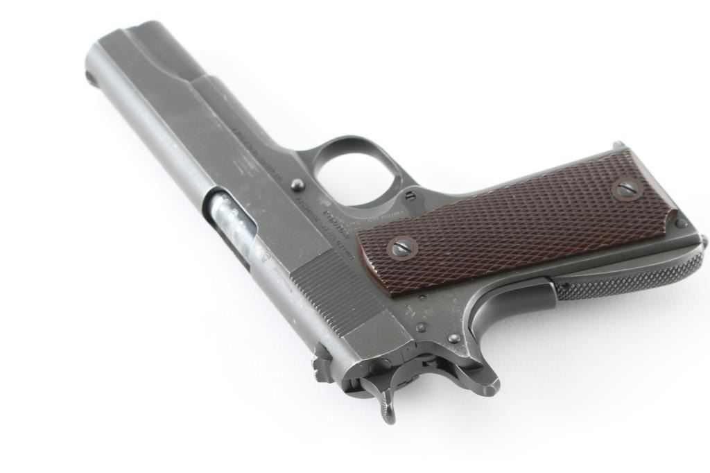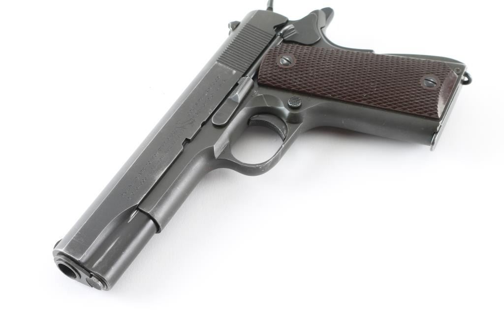 Pistol. Semi-Automatic. U.S. Military pistol manufactured in 1943. This pistol is a Lend-Lease, with British proof, and "NOTENGLISHMADE" stamped on the right slide (Faint) 3 British proofs stamped on the barrel, . Magazine fed, short recoil. 5" Barrel. Slide mounted front blade and U-notch rear sights. Parkerized "Wartime" metal finish. Grip safety. Lanyard ring. Right frame stamped, to the rear of the slide stop pin is "United States Property" with the serial number below it. "M1911A1 U.S. Army" is stamped to the front of pin. At the rear of the right frame is the crossed cannon Ordnance stamp (Faint), and British proofs. "Released British Govt, 1951" is stamped on the right frame under the serial number. Left side of frame is stamped with the 2-line patent dates, a "Rampant Colt", and Colts 2-line address. "P" is stamped in front of the rear sight, and below the magazine release button. Left triggerguard stamped with the proof triangle. "GHD inspectors stamp is present below the slide catch. (Col. Guy H. Drewry) Brown checkered plastic are reinforced , and appear original to the pistol. Checkered main spring housings. Bore is excellent/bright. Slide action is smooth/tight. Metal finish is about 90% with minor edge wear, and minor scratches, and some friction wear to the barrel, grips are excellent. NRA Condition-Very Good. C&R Firearm.