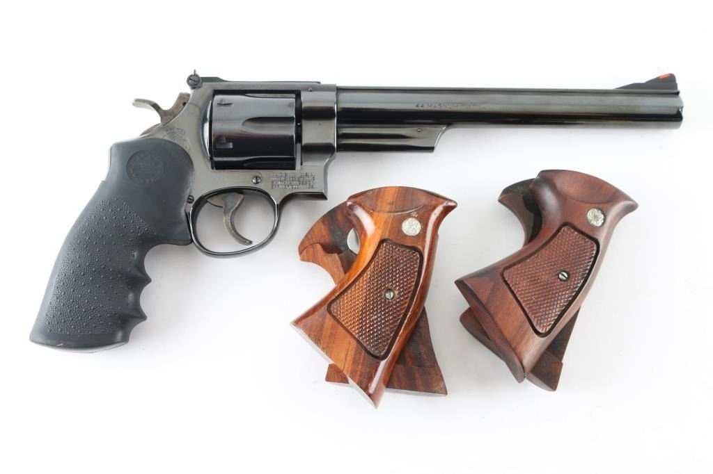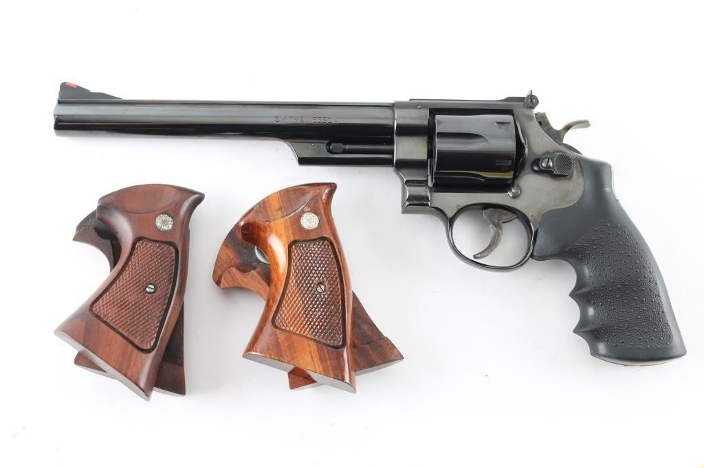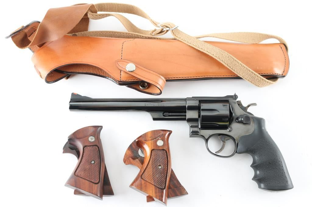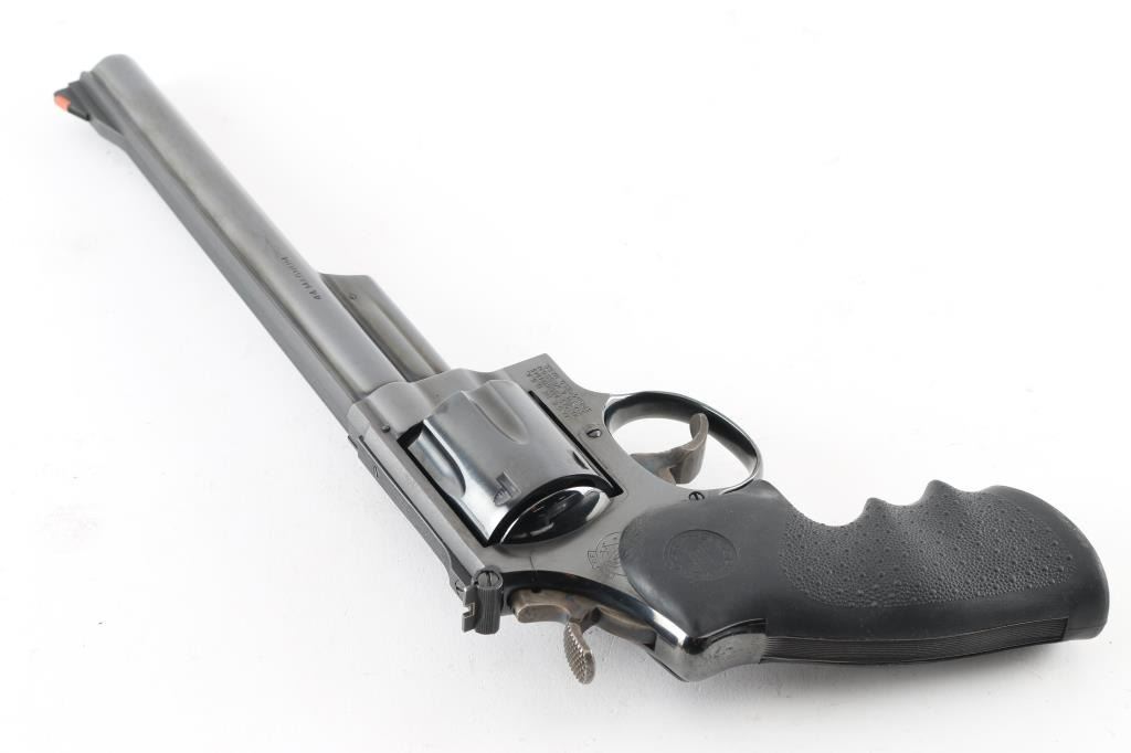 Made in the U.S.A. this revolver is "The".44 Magnum you've always wanted. With an 8.25" blued barrel, six shot fluted cylinder and frame to match this is a beautiful firearm. It sports a raised ramp front with orange insert and adjustable rear sight with white outline. Case colored trigger and hammer. Trigger is serrated and hammer spur is knurled. It currently sports a Hogue Monogrip but comes with two sets of Smith & Wesson wood grips as well and a Bianchi shoulder holster. The metal finish looks great as do all three sets of grips. The bore looks very good but needs cleaned. Condition is NRA Excellent *Modern Firearm*