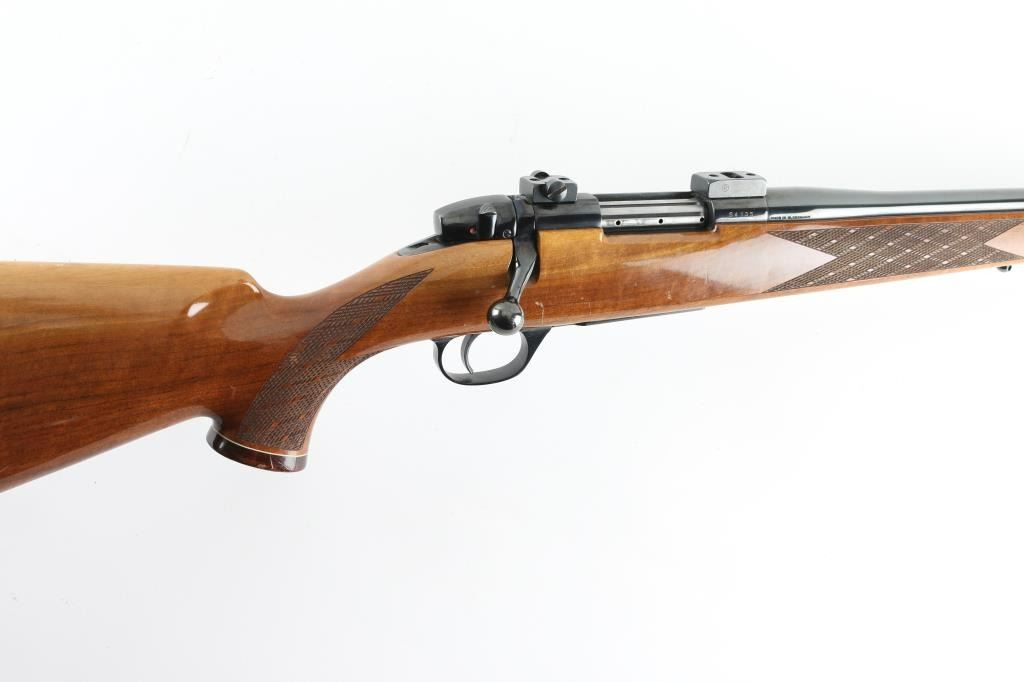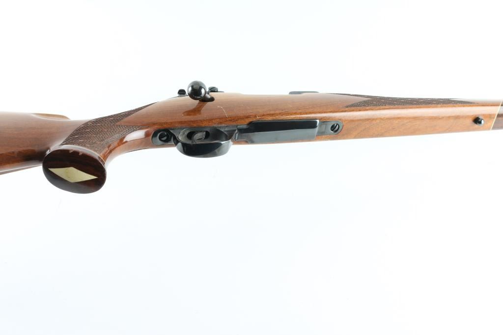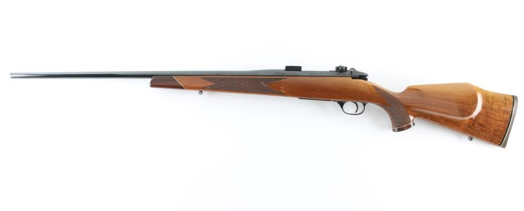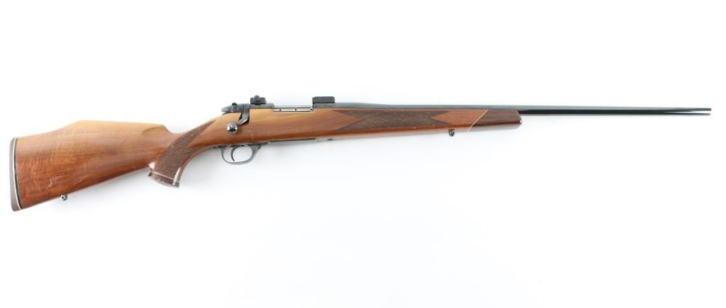 SN: S4135 Bolt action rifle made in West Germany. Built using a smaller sized action for smaller, varmint hunting cartridges. (1963-1994) Features blued finish, fancy figured walnut stock, 24" barrel, no provisions for sights, two piece Redfield scope bases (no scope provided), manual safety on bolt shroud, sling studs, thin flat rubber butt pad. Stock is Monte Carlo styled with contrasting grip cap & forend tip, white diamond inset on grip cap, curved grip, high combed right hand cheek piece, checkered panels at wrist & forend. Bore appears dark/dirty, may improve with cleaning. Retains 99% blue Stock is good with some scratches/rubs. NRA condition-Good+ Modern firearm.
