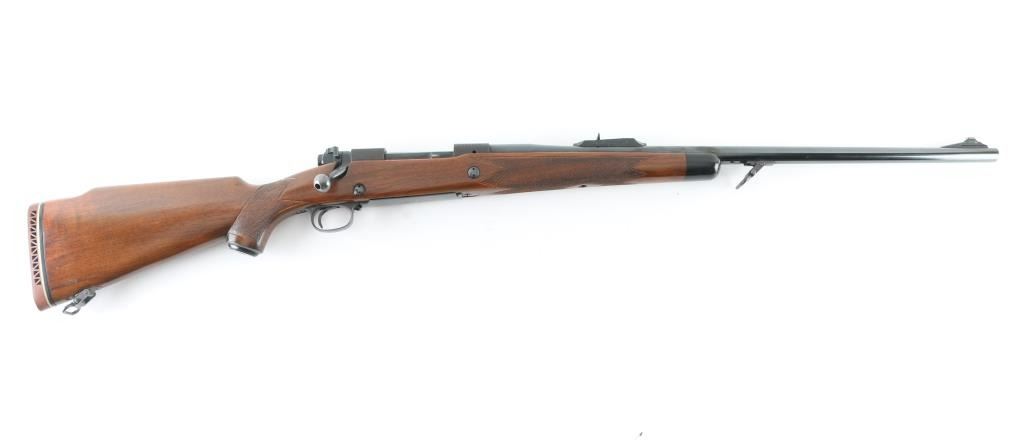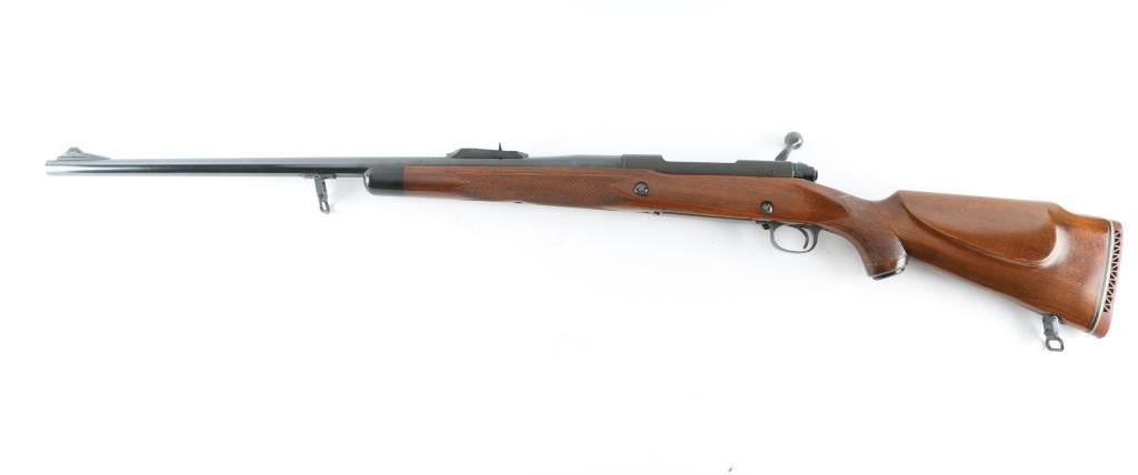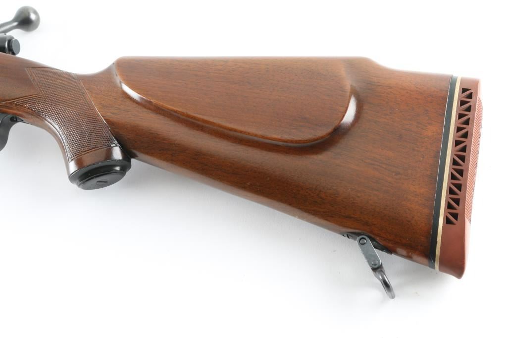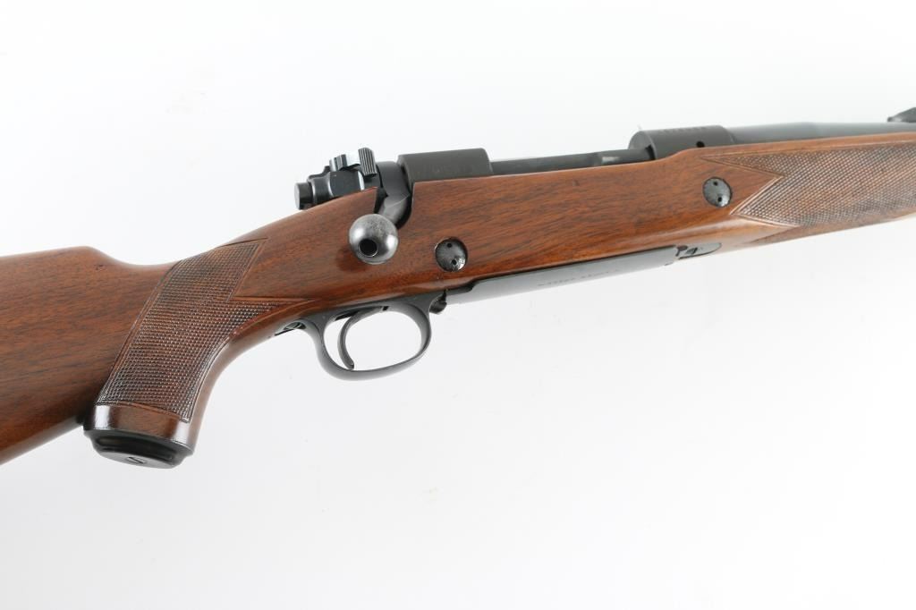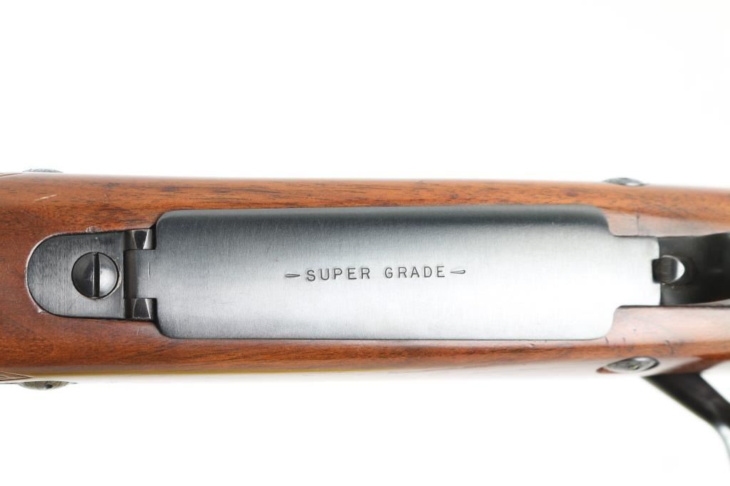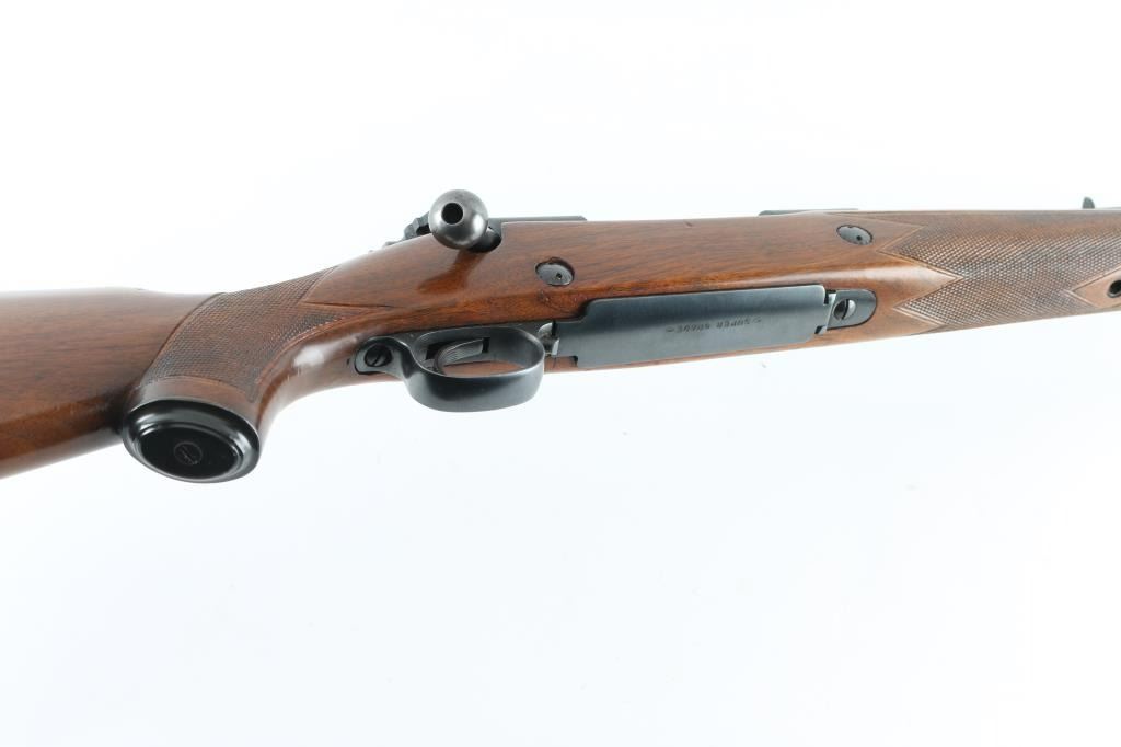 'Super Grade' Classic American bolt action hunting rifle. Features blued finish, checkered walnut stock, 25" heavy profile barrel, blade front sight mounted in a ramped base, adjustable rear sight, Winchester marked ventilated red recoil pad, black forend tip, hinged floorplate, controlled round feed bolt with claw extractor & 3 position side-swing safety, sling swivels (forward stud mounted to barrel), right hand cheek piece, two recoil lugs in stock. Bore is very good. Retains 95% finish with handling marks & edge losses. Wood is very good condition with scrapes and scratches to finish. Condition is NRA Very Good++ *** Modern Firearm ***