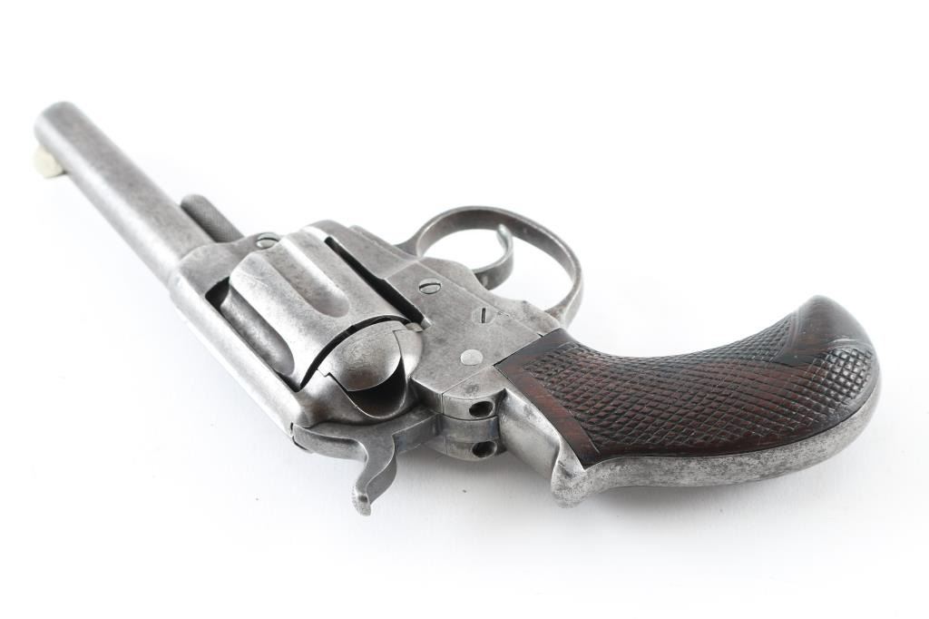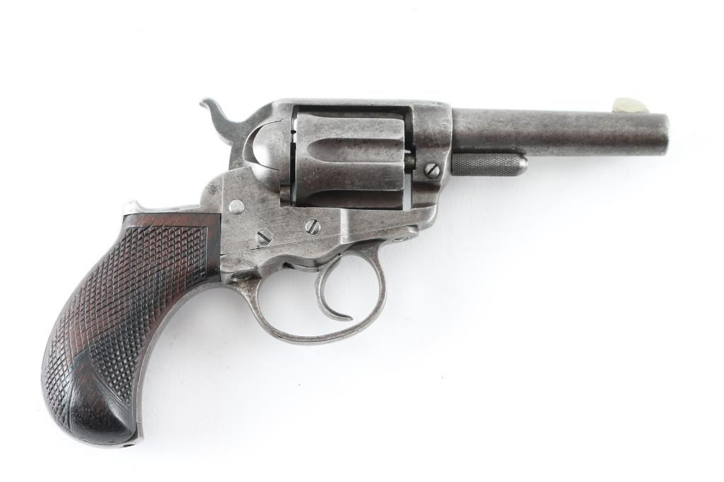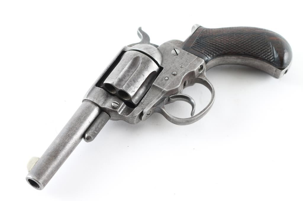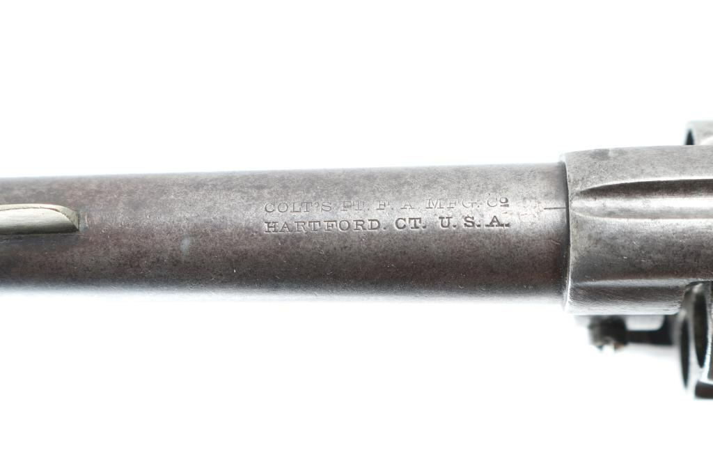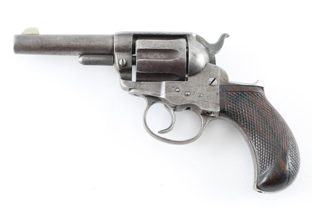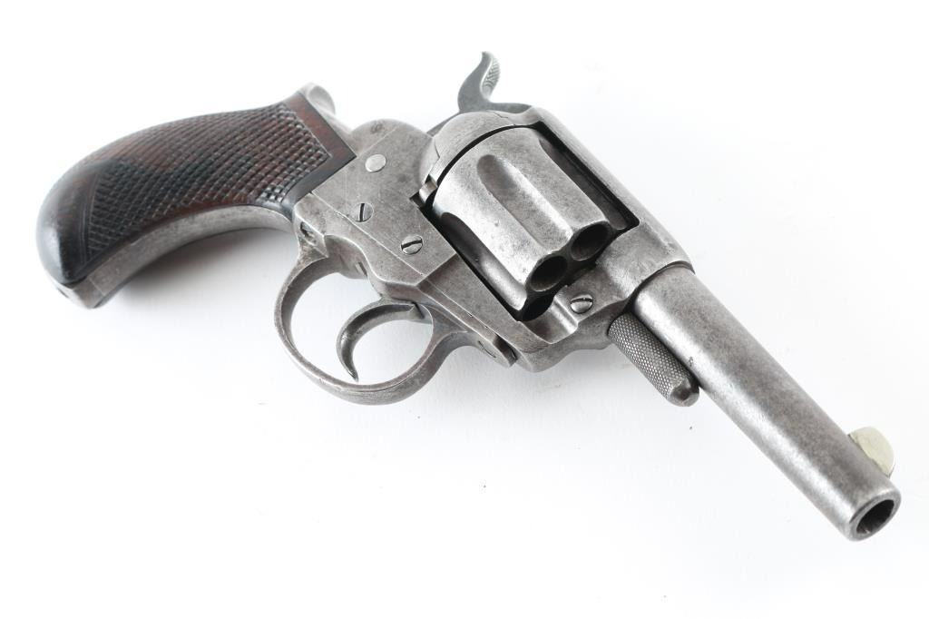 The 1877 is Colt's first double action revolver and this is one from the first year of production according to the Colt web site. It is chambered for the .38 Colt cartridge and sports a 3.5" barrel, 6 shot fluted cylinder, fixed blade front sight (appears to have been replaced) and a machined in notch rear sight, serrated hammer spur and checkered rosewood grips. The metal finish is in the white and while it does show some use and age overall it looks good. The grips show some wear but look great. The bore is dirty and needs cleaned. Action operates properly, has tight lock-up when trigger held to rear. Condition is NRA Good as an Antique. *Antique Firearm*