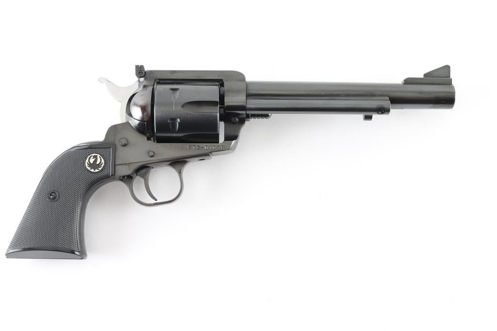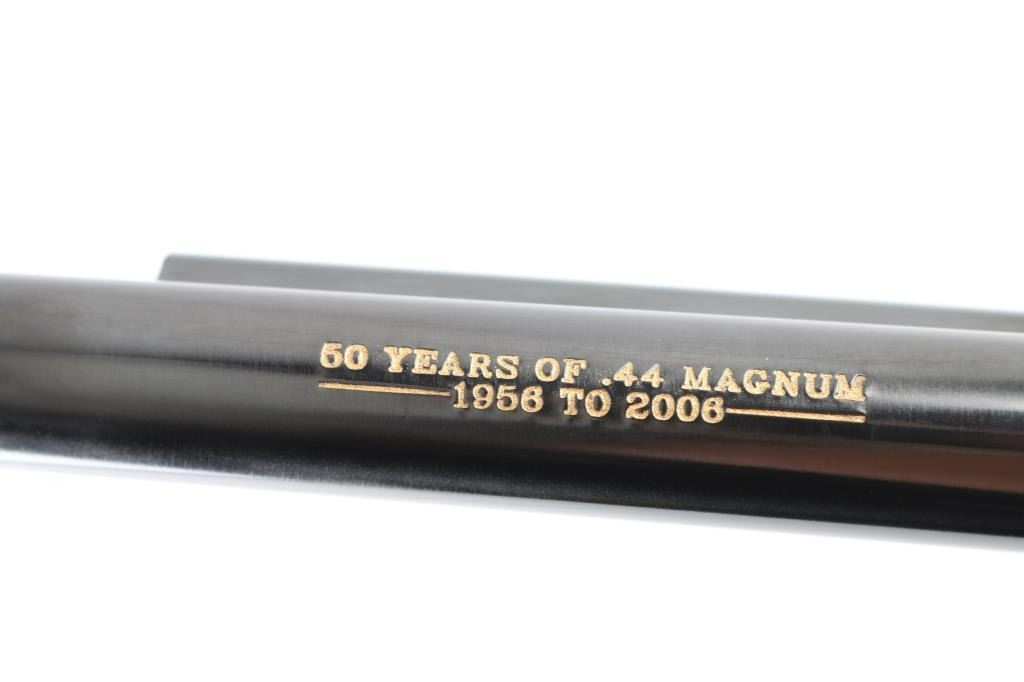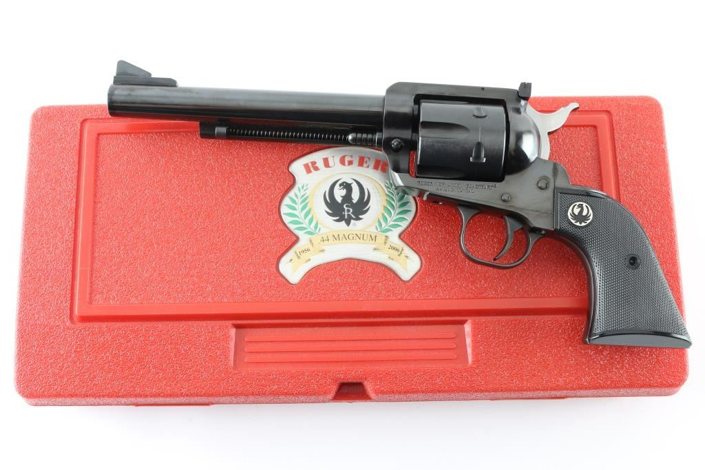 '50th Anniversary 44 Magnum' Single action revolver features blued finish, checkered black plastic grips with Ruger medallions, 6.5" barrel, adjustable sights, locking system (remove grips to lock or unlock). Top of barrel is engraved "50 Years of 44 Magnum / 1956-2006". Bore & charge holes are in very good condition. Retains 98% blue with minor handling marks, drag line. Grips are pristine. Smooth action, tight lock up. Includes factory red plastic box with manual & locking system keys. Box & manual have special markings for this edition. Condition is NRA Excellent *** Modern Firearm ***