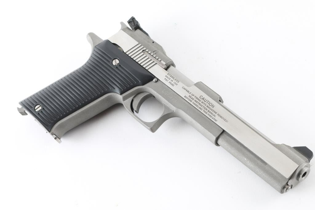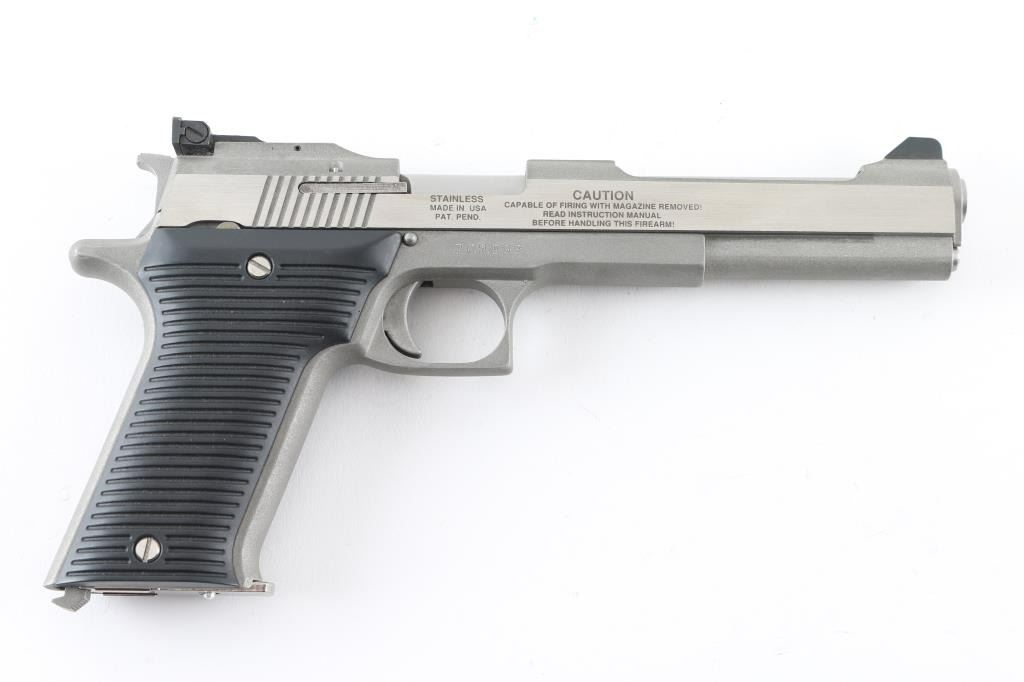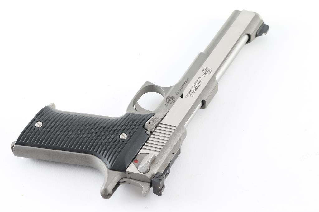Stainless steel single action semi-automatic pistol chambered in .22 Magnum, manufactured by Arcadia Machine & Tool in Irwindale, CA circa 1987-1998. Features a matte & brushed finish, 6" barrel, full-length steel guide rod, ramp front sight with white accent, fully-adjustable Millett rear sight with white dot outlined square notch, smooth trigger, serrated hammer spur, manual safety on the left side of the slide, heel magazine release, 10 round magazine, two-piece grooved black synthetic grips. Pistol exhibits avery good finish. Action is crisp, the bore is very good and the synthetic grips are very good. Condition is NRA Very Good. Modern Firearm.