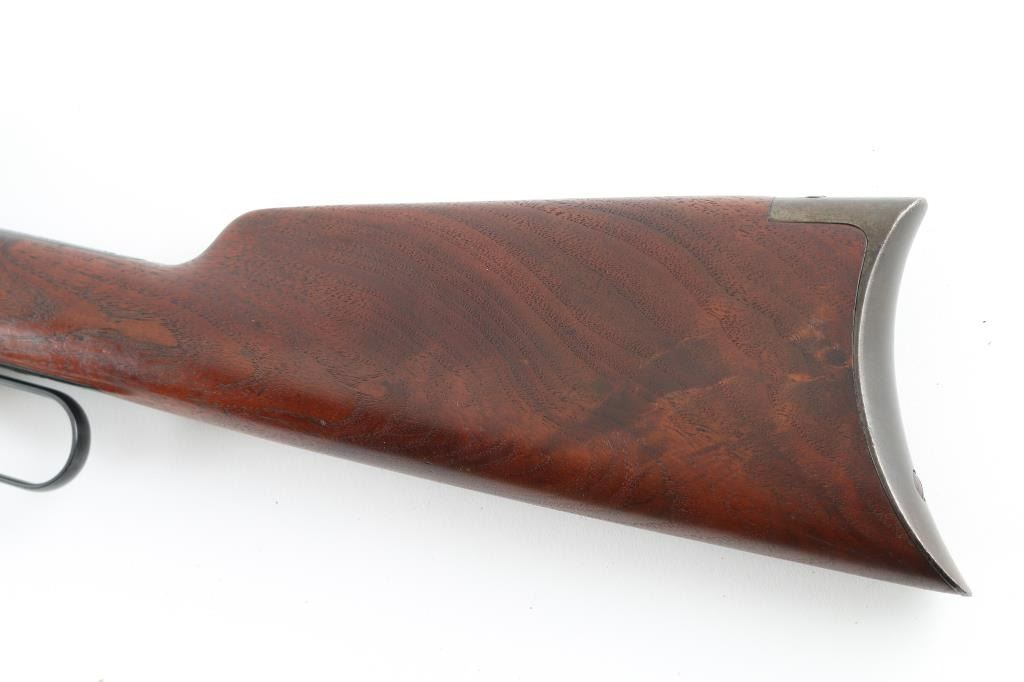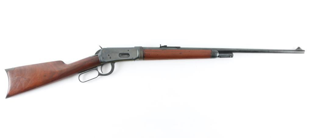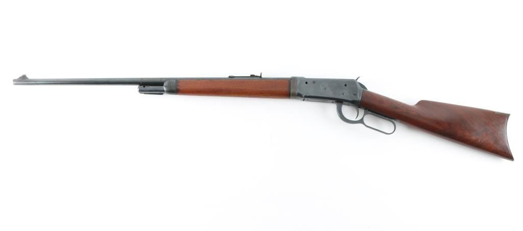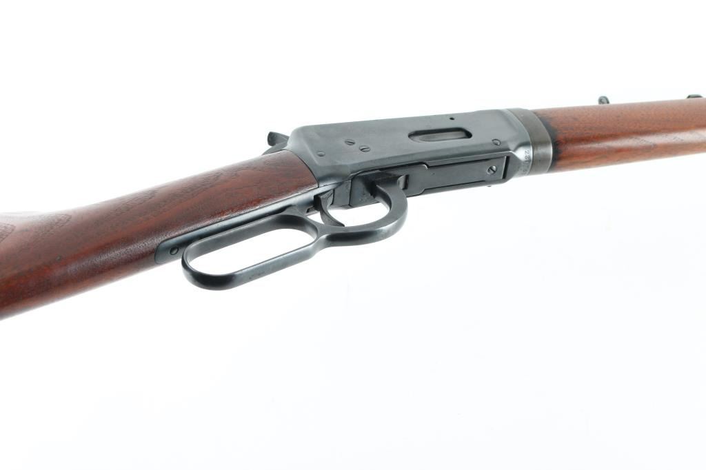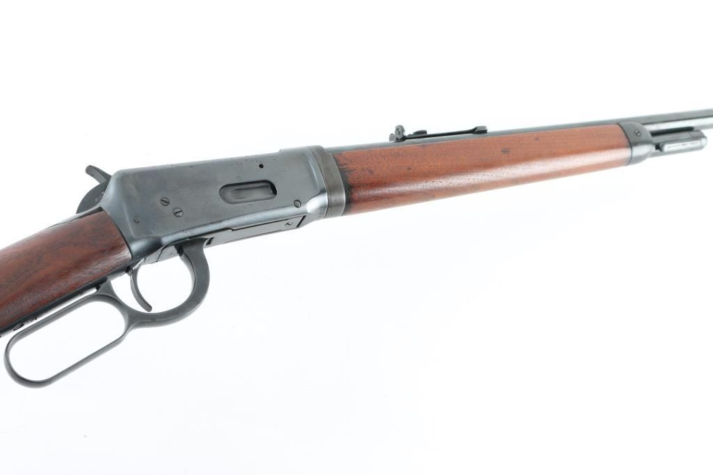 Vintage take-down lever action repeating rifle chambered in .30 W.C.F. Winchester, manufactured circa 1958. Features a fully blued finish, 24" take-down barrel, 2/3 length tube magazine, having the magazine cap function as a take-down mechanism. "Blade" front sight with , flat-top adjustable rear sporting sight, smooth trigger, knurled hammer spur, smooth walnut forearm and straight grip shoulder stock with crescent steel buttplate. Rifle retains approximately 90% of its re-blued finish. Areas of pitting can be seen under the re-blue on the receiver, and lever. Action is smooth, the bore is fair with minor pitting, markings are legible and wood stocks are very good as re-finished. NRA Condition good/re-finished. C&R firearm
