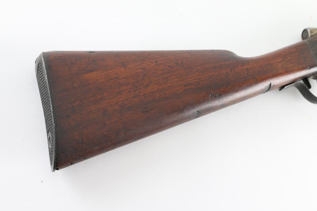 The rifle shows an older sporterization with barrel reduced to 24 inches and turned to reduce the weight and also the forend shaped to commercial style Also the sights are added in same era. Brown patina with good wood and NRA good to very good overall. It was a 45.70 but bored out to smooth. The bore has been bored out to smooth and measures .510" at muzzle. Antique Firearm NRA Condition - Fair