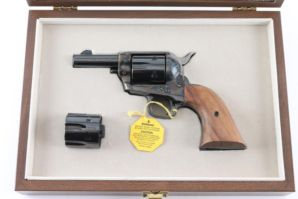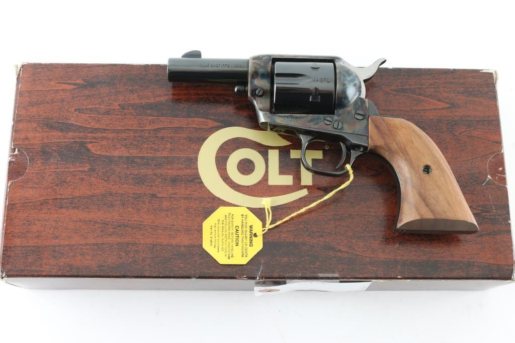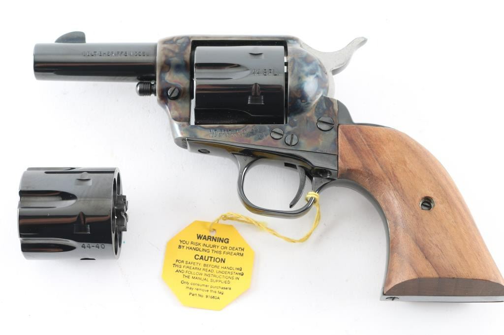 'Sheriff's Model' revolver manufactured circa 1980. Features royal blue finish with smooth walnut two piece grips, fixed sights, 3" barrel, no ejector rod. Includes two cylinders (44 Special is installed, 44-40 provided in glass lidded display case). Retains 98% or better finish with no observed marks or blemishes, no indication of being fired. No cylinder drag line visible. Cylinder not turned for inspection. Includes matching Colt styrofoam box with wood grain cardboard sleeve. Condition is NRA Excellent - like new *** Modern Firearm ***