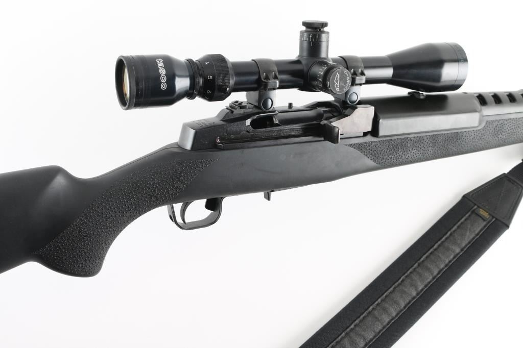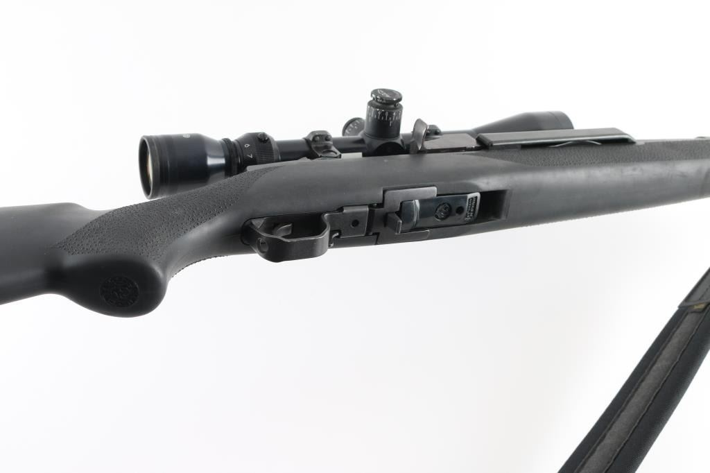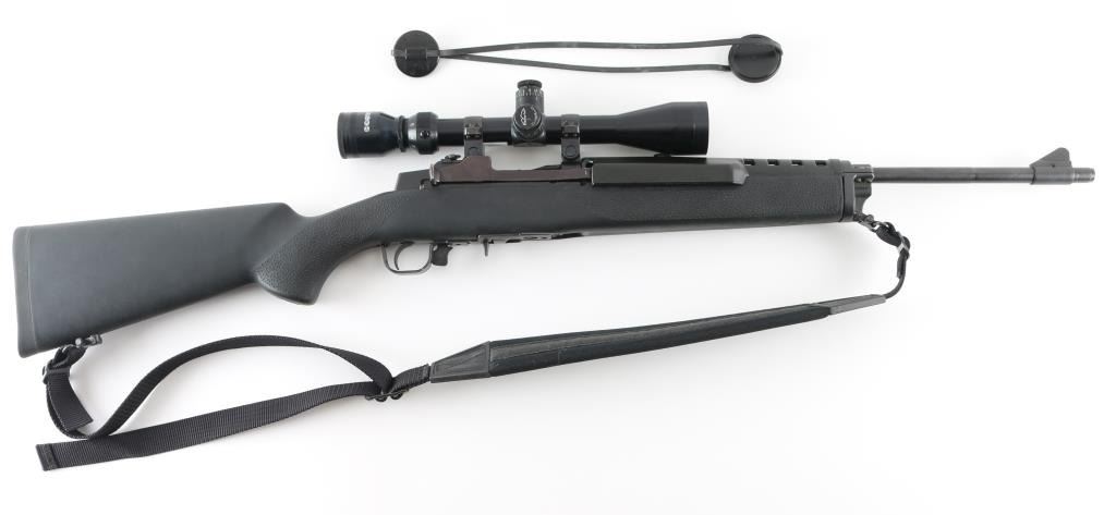 Semi-automatic modern sporting rifle built along the lines of a scaled down M-14, chambered in .223 Rem. Features a matte finish, 18 1/2" barrel with a front blade, and flip peep rear sights, receiver with integral scope bases, smooth trigger, manual safety, factory 5 round magazine, ventilated black steel handguard and Hogue pebbled black rubber over molded semi-pistol grip shoulder stock, rubber recoil pad. Rifle exhibits 99% finish with slight edge wear. Action is crisp, the bore is pristine and the rubber overmolded stock is fine. Mounted with a Japanese made Tasco 3-9X40 scope, clear optics. Padded black nylon sling attached. NRA Condition-Excellent. Modern Firearm