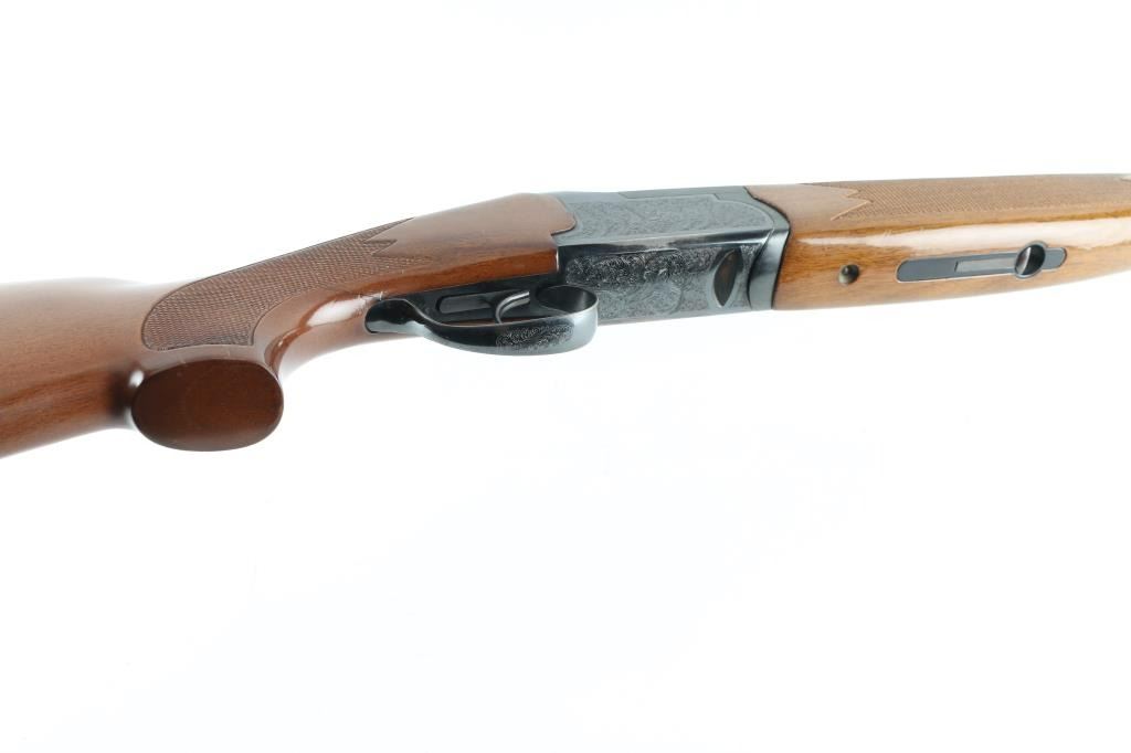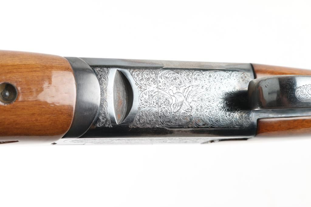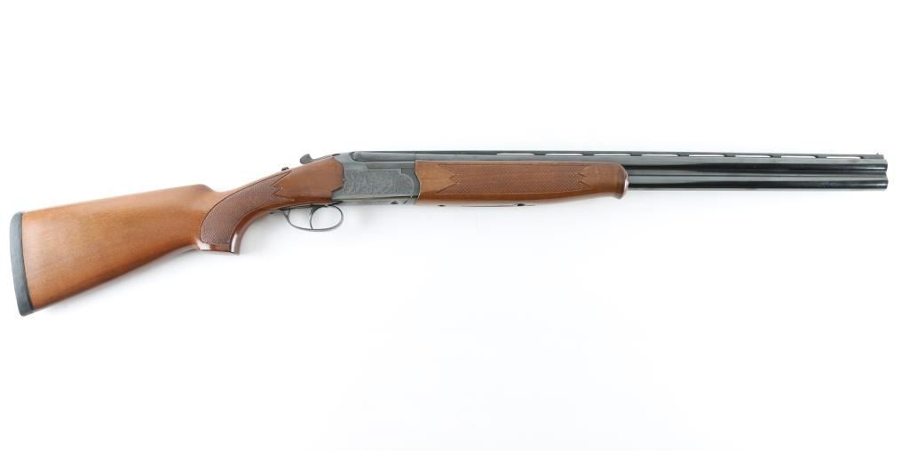 Sn: 267393 Spanish made O/U 12 Ga. Shotgun, 2 3/4" chambers. Imported by Arms of America. 26" barrels with vented sighting rib with brass bead. Top barrel has full choke, bottom has IC choke. Blued finish, checkered schnabel forearm, checkered grip with factory hard rubber recoil pad. Sides and bottom are engraved with birds in flight, and scroll designs. Action locks up tight. Bores are very good/bright. Wood is very good. Blue is about 90% with edge wear and spots of rust on the underside of receiver, and lower barrel. NRA Condition-Good. Modern firearm.