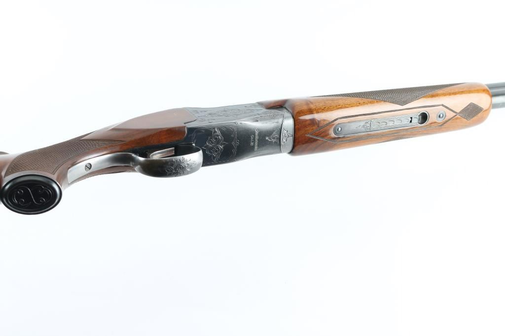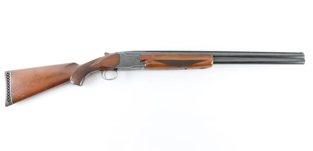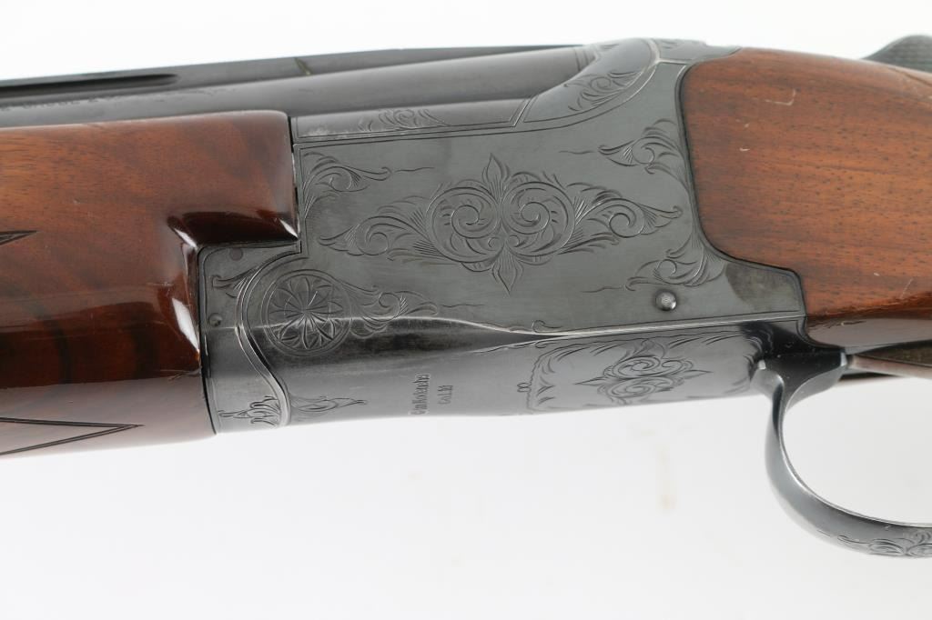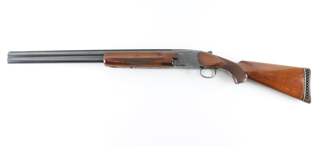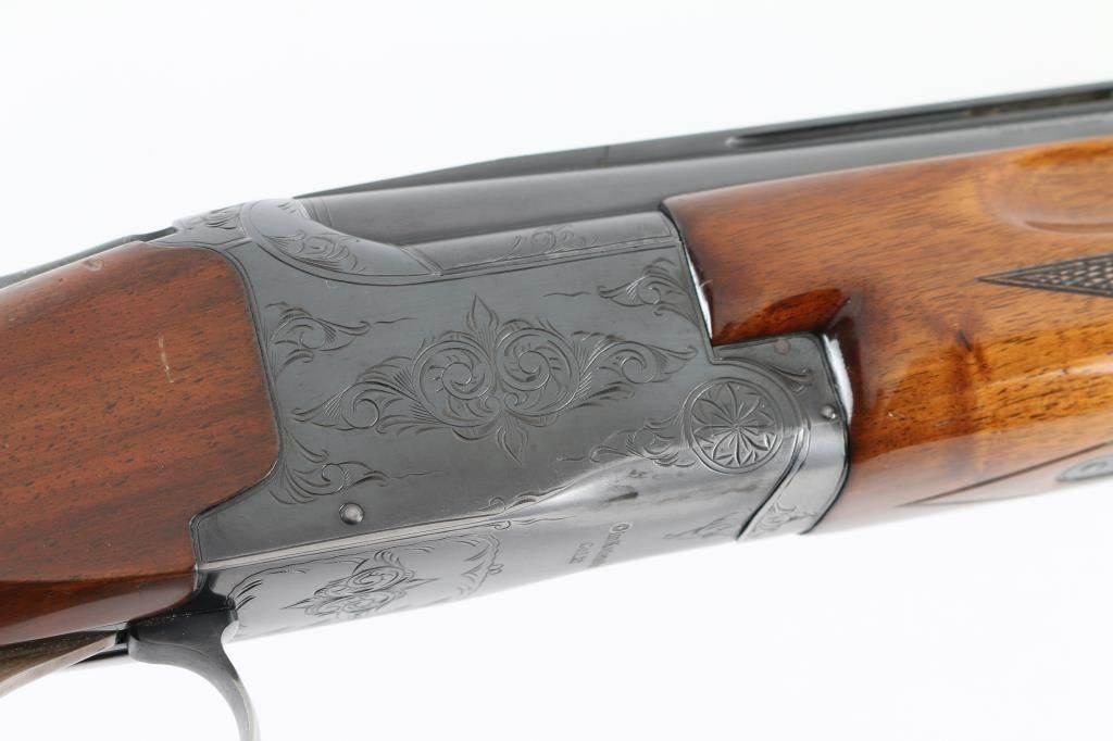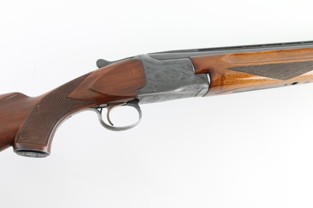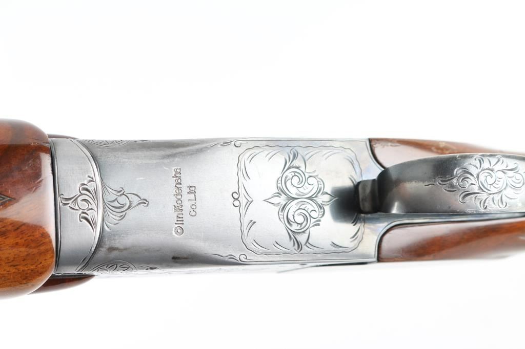 Shotgun. O/U. Break-top action. Made by Olin Kodensha Co. Ltd. in Japan for Winchester. 26" barrels with ventilated, checkered, full length sighting rib with two brass sighting beads. 2 3/4" chambers. Both barrels marked "Skeet" Fixed chokes,. Floral etched receiver. Blued finish. Combination thumb safety/barrel selector on tang. Checkered walnut, pistol-grip stock/forend. Pachmayr recoil pad with black/white spacers. Steel grip cap. Bores appear excellent/bright, chambers need cleaning. Barrels lock-up tight. Blued finish is about 85% with edge wear, and handling loss to the triggerguard, and underside of the receiver.. Wood is very good with minor scratches/dings. This shotgun has become a classic over the years. Produced 1963-1981. NRA Condition-Very Good. Modern firearm.