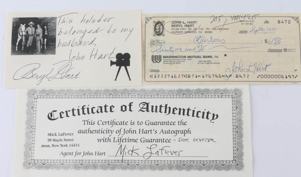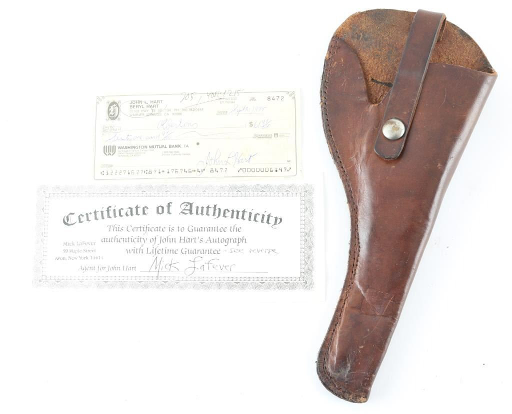 revolver holster owned by "John L Hart", marked Towson, includes certificate of authenticity and other documents. Famous movie star who was in the "Last of Mohicans", "Hawkeye" and also the famous "Lone Ranger".