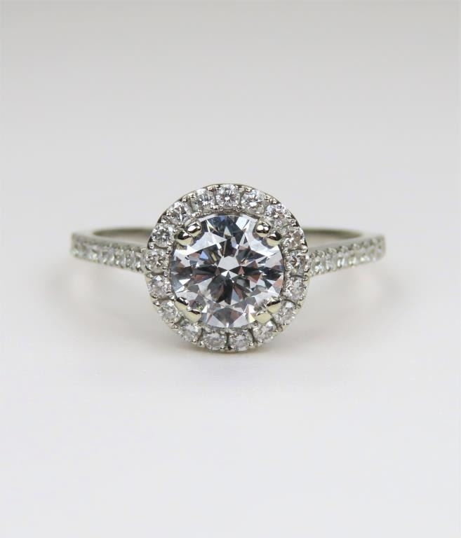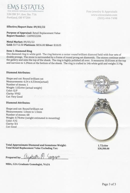 featuring a center ‘IDEAL’ cut Diamond weighing 1.02 carats with E-F color and VVS clarity accented with 68 Fine round cut micro set Diamonds weighing approx. 0.70 carats with F-G colors and VS/SI clarity set in a lovely Halo style setting crafted in 14 karat white gold. Full Appraised Value - $30,000.00