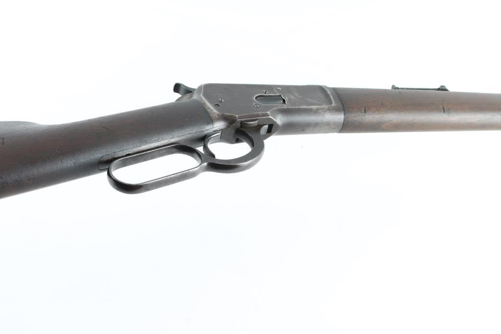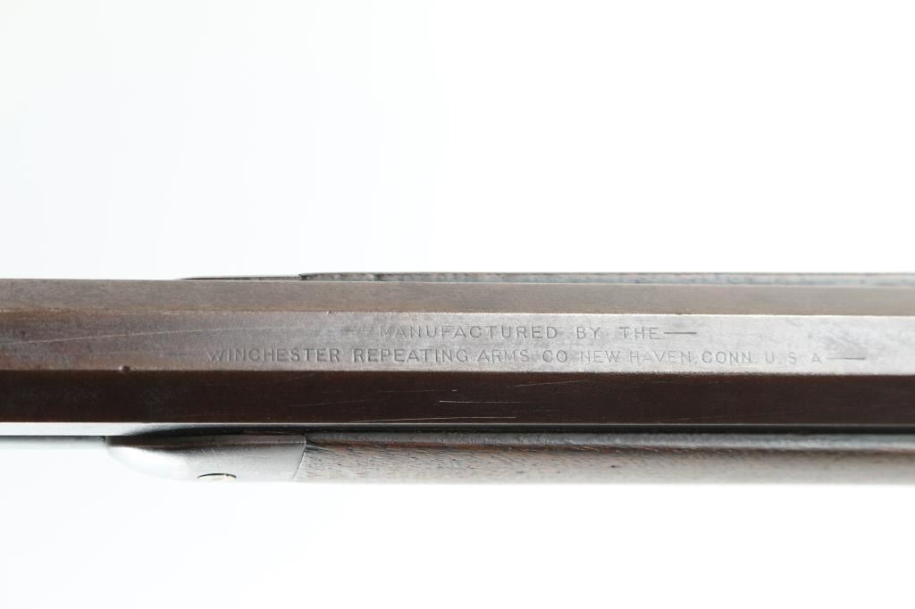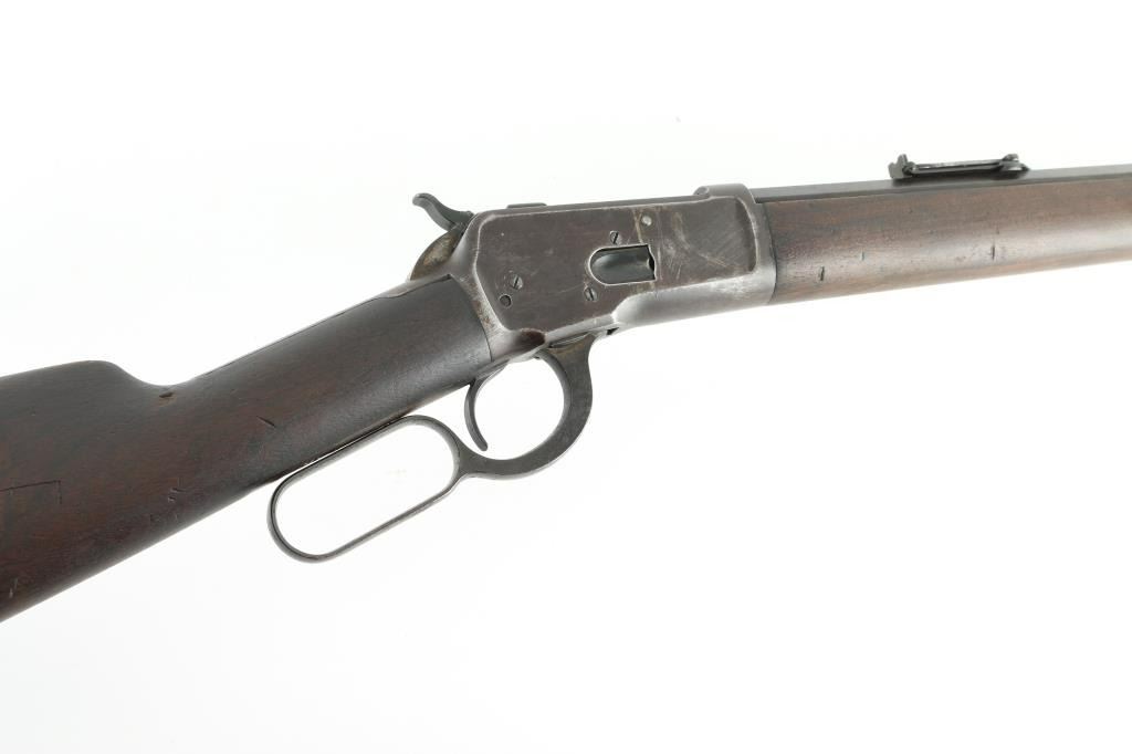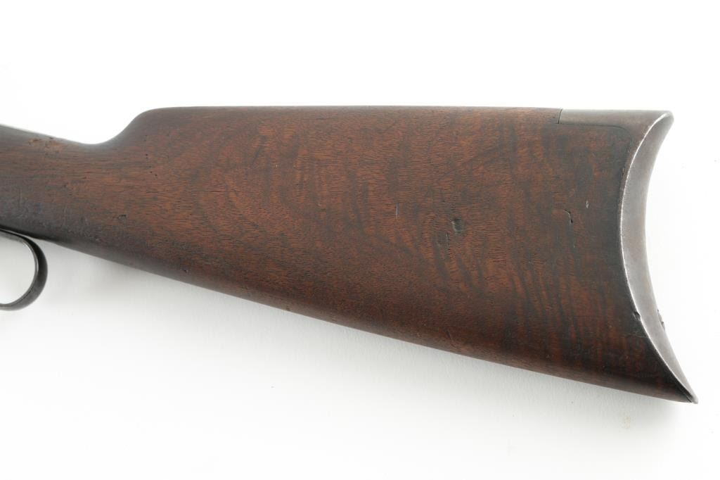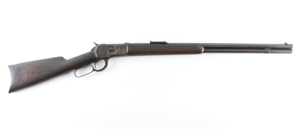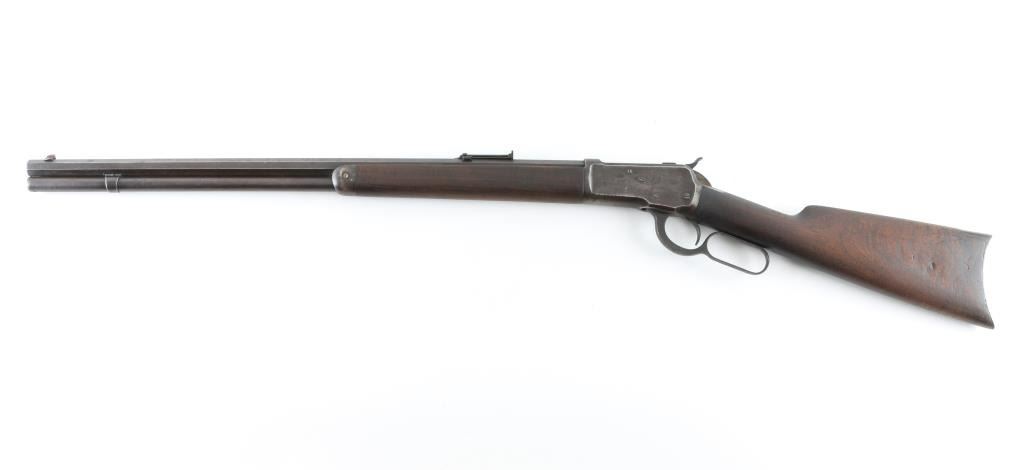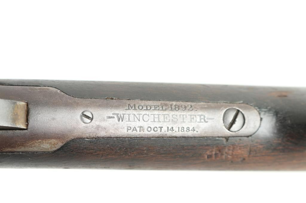 Lever action rifle manufactured circa 1892. Features smooth walnut stocks, 24" octagon barrel, full length magazine tube, blade front sight, folding ladder rear sight, semi-crescent buttplate. Small repair to hammer face shows brazing metal. Bore is fair to good condition overall, strong rifling, lightly pitted throughout. Metal surfaces are a dark brown patina color, thinning or showing bare metal on edges & corners, scratches & thicker patina on receiver. Wood is good condition, shows nice figure & feather grain in butt, with many dents & scratches, nice fit to metal. Condition is NRA Good++ (repaired hammer) *** Antique Firearm ***
