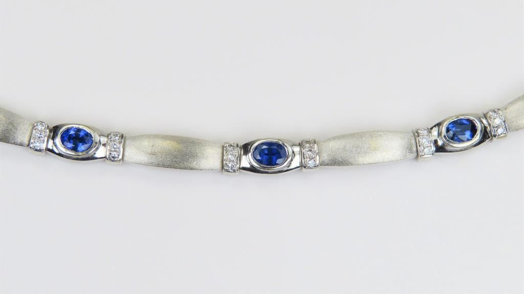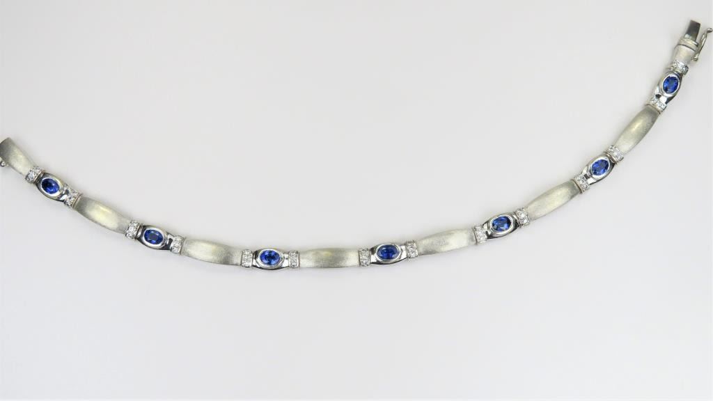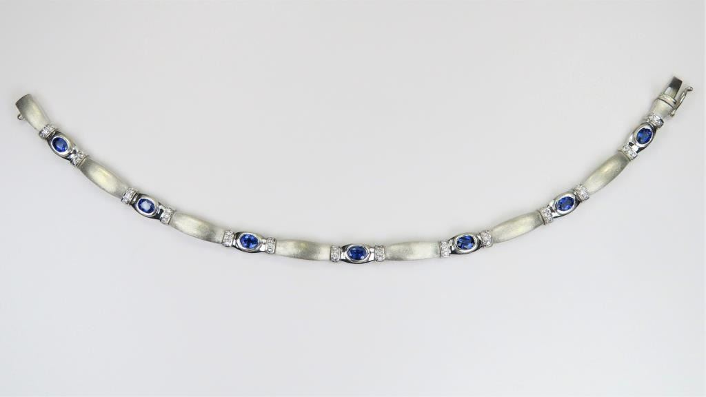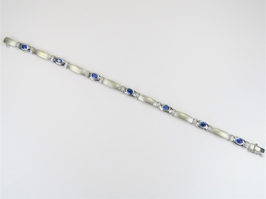 and Diamond Bracelet featuring 6 matching oval cut Sapphires with vibrant Blue color weighing approx. 3.00 carats accented with 42 round cut Diamonds set in a beautiful designer mounting crafted in 23 grams of 18 karat white gold. Retail $8,000-$10,000