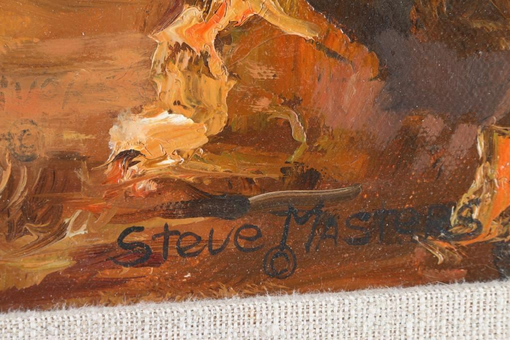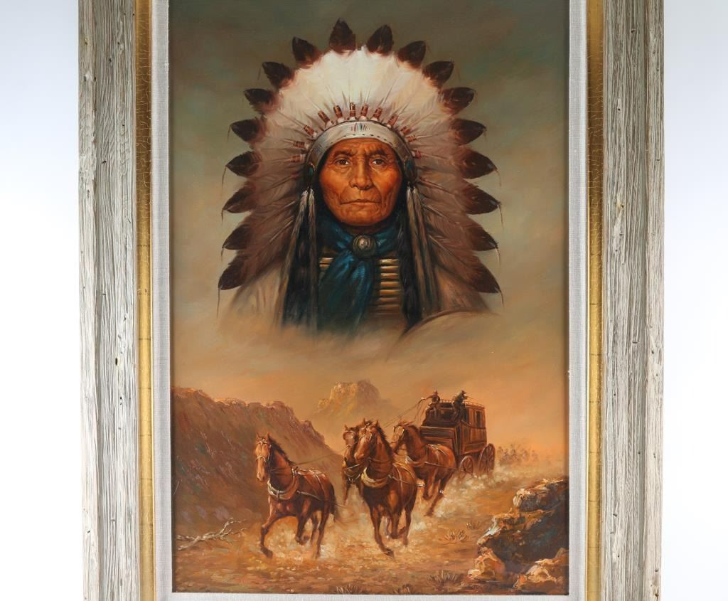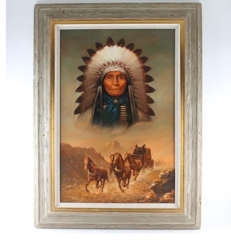 By Steve Masters, signed lower right, depicting Chief and stage coach, in beautifully matted and framed in barn wood. Measuring 36x23. Steve Masters (1925 - 1964) is known for Illustration.