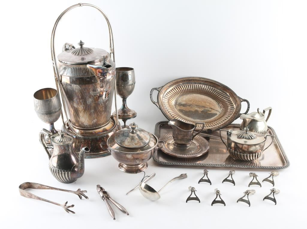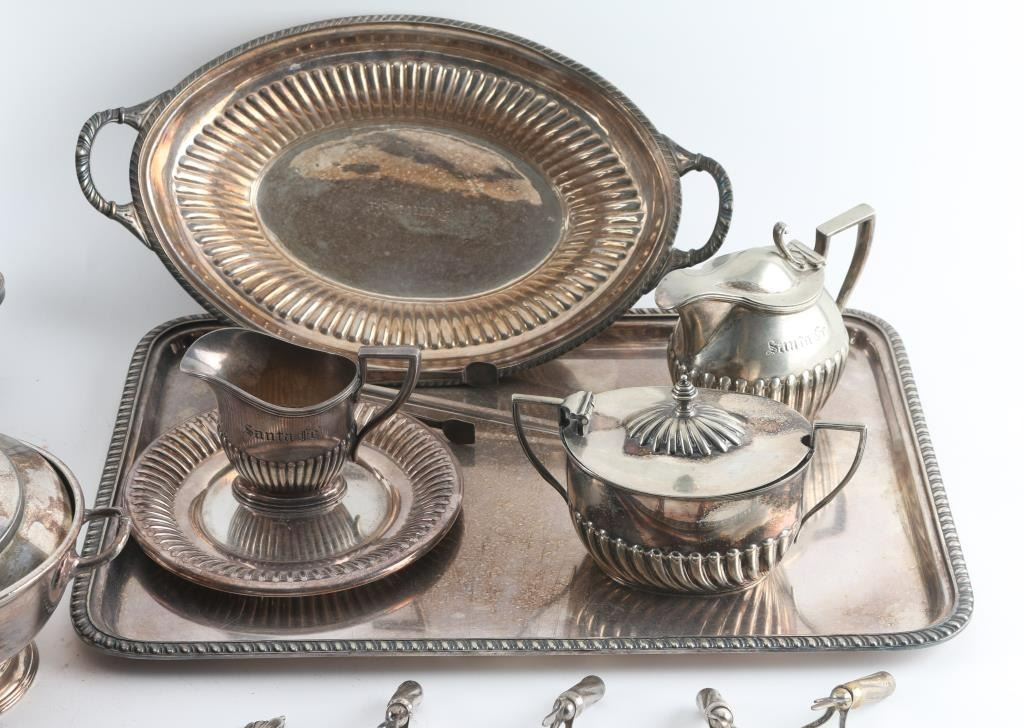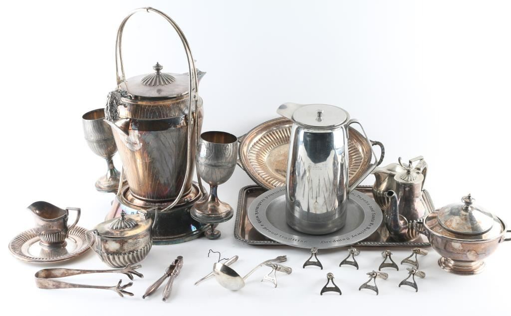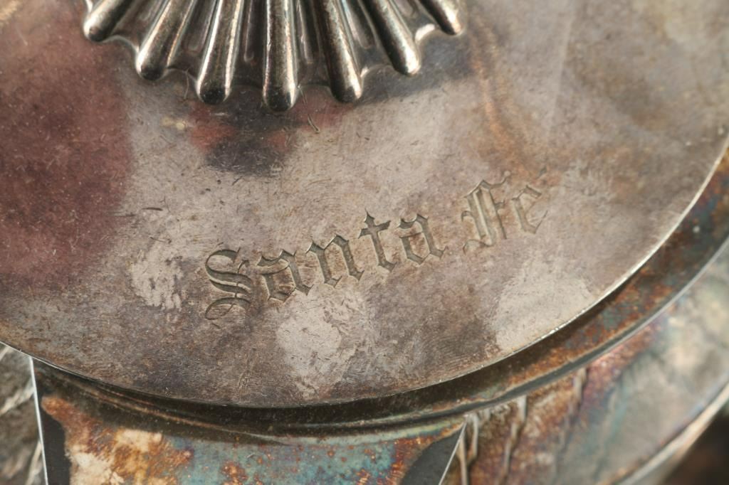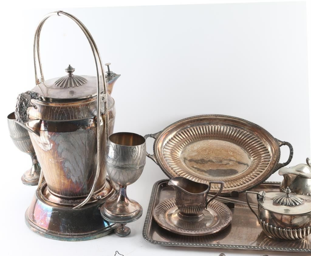 Sterling sliver plated done by "Harrison and Howson Brothers Company" each piece is engraved "Santa Fe". This set includes coffee pot, teapot, cream pot, sugar and several other pieces. Also a pewter tray not originally related to this set.