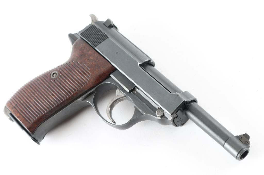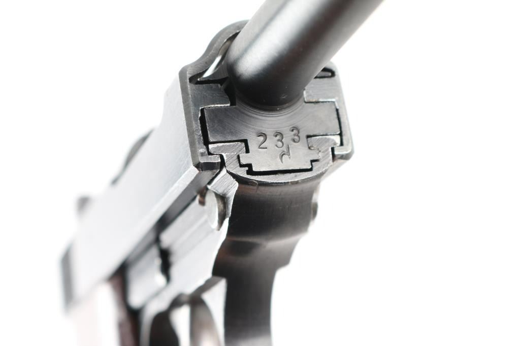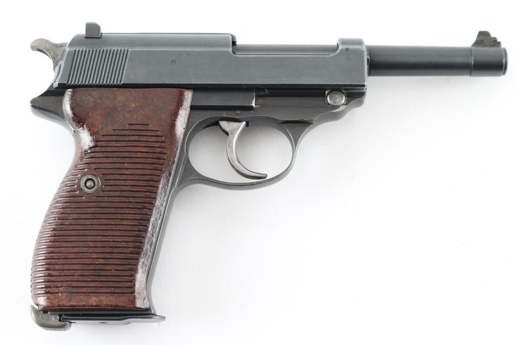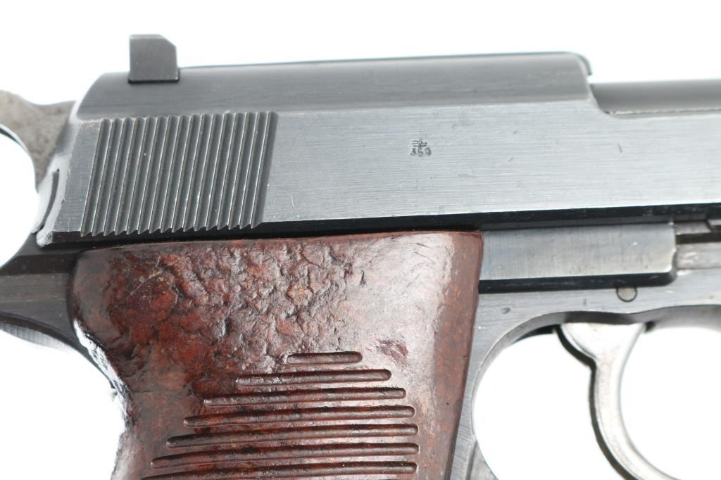 Pistol. Semi-Automatic. 8-rd magazine. Mismatched. Third Reich era Military issued sidearm. 4.9" barrel. Short recoil hinged locking piece assisted breechblock. Late war ac 45. Mismatched serial numbers (Usual) ,unmarked locking block. Waffenamts, Eagle/359. Two waffenamts on right slide. 9207c slide, 6857c frame, and 233d barrel. Bore is very good/bright, strong rifling. Bakelite grips are good. Blued finish is about 95% with minor scratches edge wear. Original magazine unmarked. NRA Condition-Good/Mismatched. C&R Firearm.