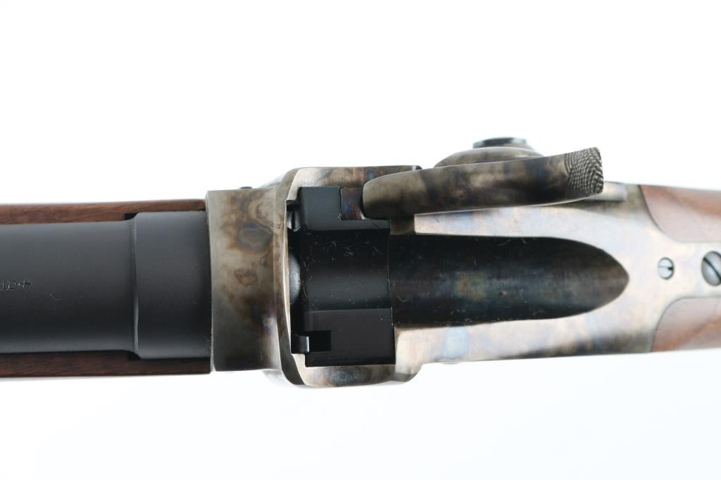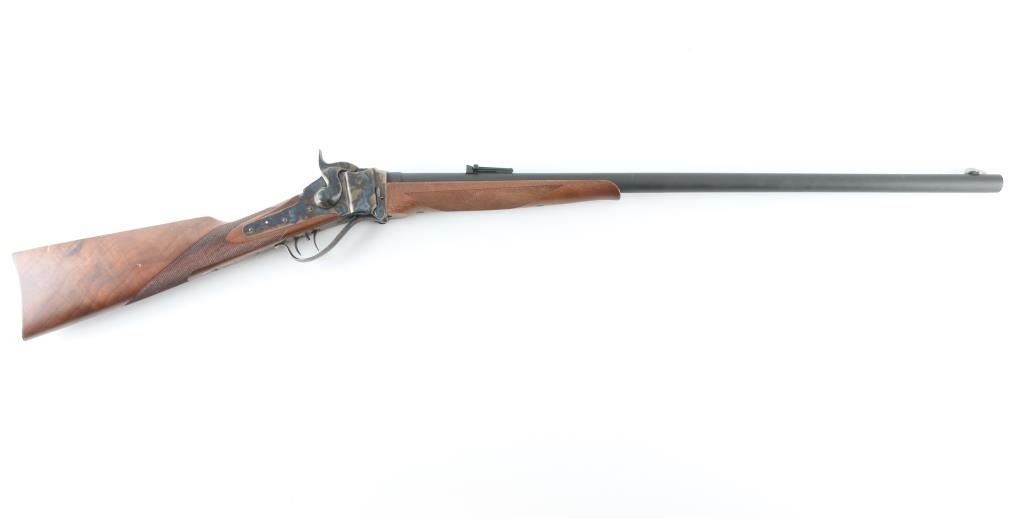Italian made reproduction of the Sharps Rifle Company Model 1874 falling block single shot sporting rifle, imported by Stoeger. Features a matte blued 30" heavy round profile barrel, dovetailed blade front sight, folding ladder rear sight, double set triggers, case hardened receiver, knurled hammer spur, checkered select walnut forend with semi-schnabel tip and straight gripped checkered wrist shoulder stock with case hardened steel buttplate. Rifle retains approximately 95% original finish with handling marks. Action is smooth, the bore is pristine and the wood stocks are fine with several small dents. Condition is NRA Excellent. *** Modern Firearm ***