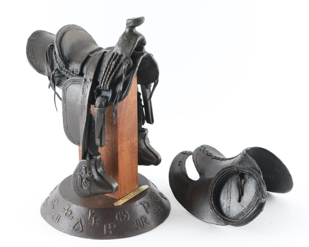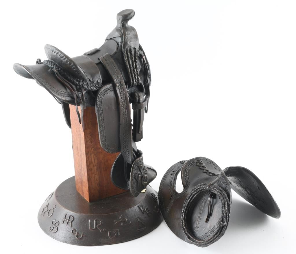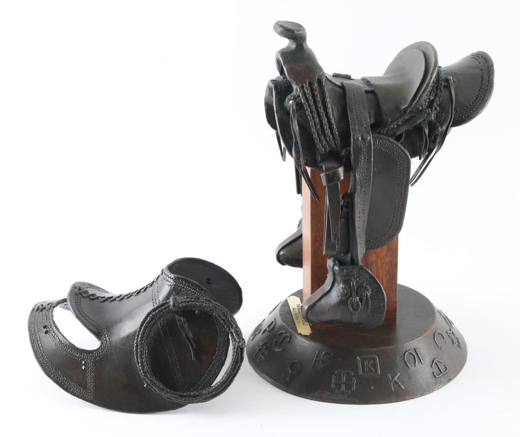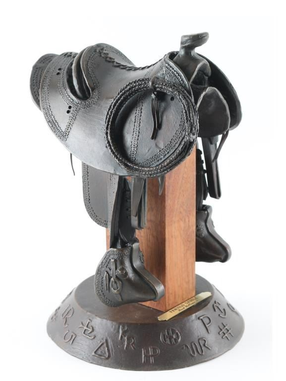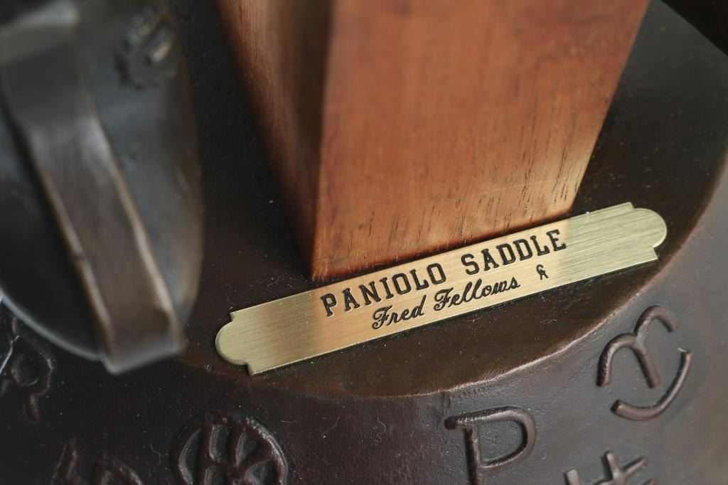 Entitled "Paniolo Saddle" numbered 25/50 an signed under top attachment piece by "Fred Fellows" with makers marked twice. Measuring 10x6", showing no signs of damage but missing saddle strings attached to back of top attachment, otherwise in near perfect condition.