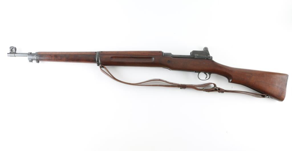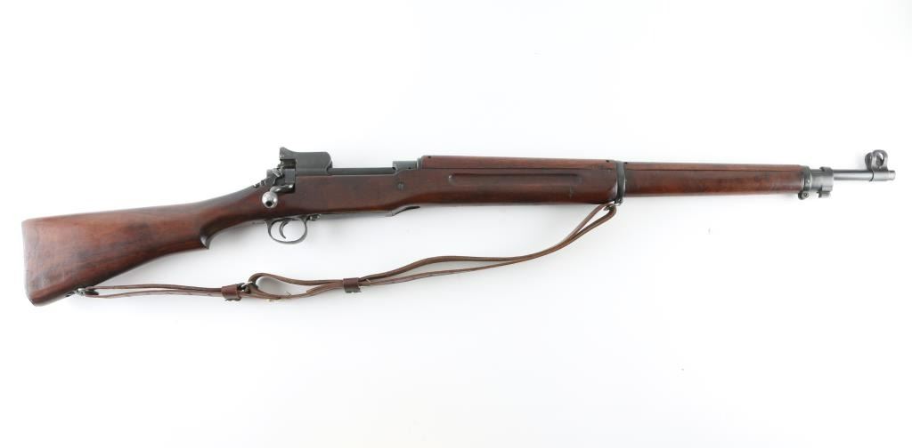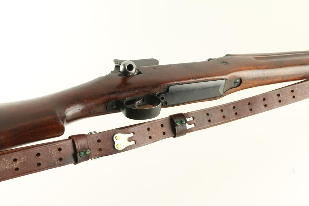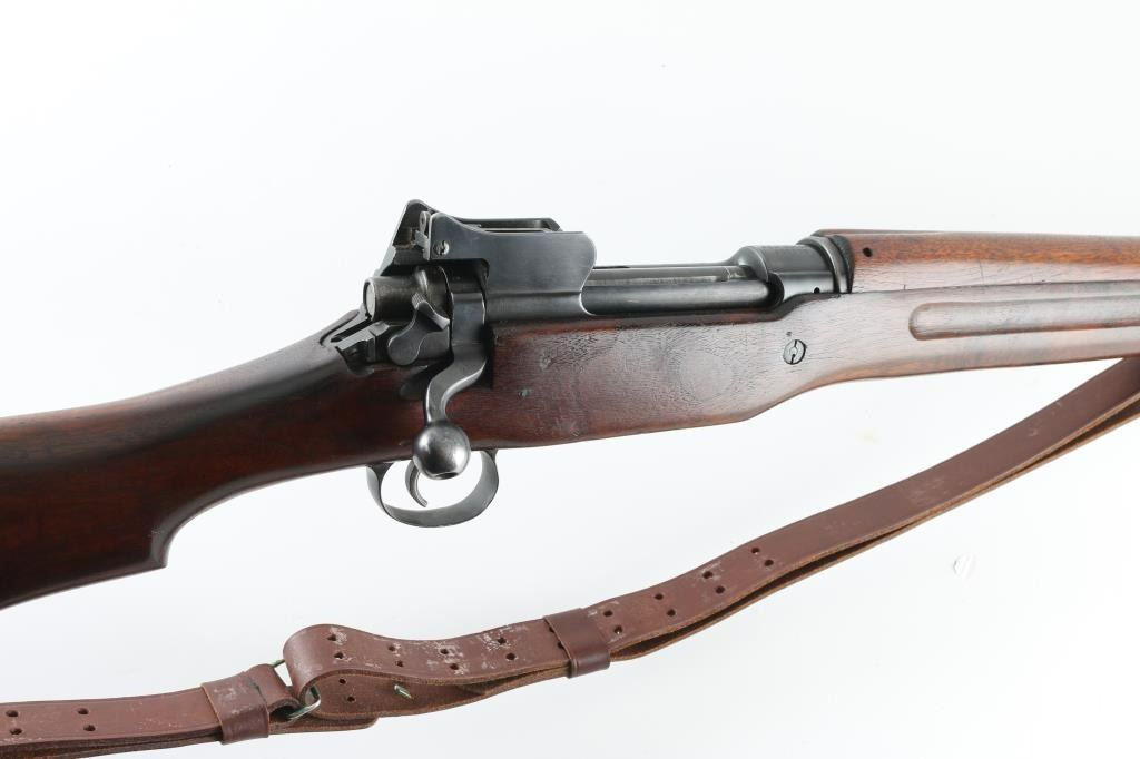 American military bolt action rifle manufactured for use in WWI. Features dog-leg bolt handle, protected blade front sight, folding ladder rear sight with peep apertures, approx 26 inch barrel, manual safety, sling swivels (missing stacking swivel), storage compartment in butt, blued finish on metal parts, walnut stock with finger grooves and handguard. Bore is very good condition, appears to be 5 groove left hand twist. Retains 80% finish on metal parts, showing bare metal on sharp edges, where handled, and where moving parts rub. Some color change towards brown, such as on rear band. Stock is in very good condition, some evidence of light sanding (loss of sharp edges at finger grasping grooves), maintains good fit to metal parts, scratched and lightly dented throughout. Barrel is marked "R" over flaming bomb, over "11-18". Flaming bomb stamps on left side of receiver & bolt handle. Left side of stock stamped "6E" below rear sight, and inspector mark (eagle head over "300") under wrist. Observed markings in stock and stamps in metal are crisp. Includes very good condition leather sling. Condition is NRA Very Good++ *** C&R Firearm ***