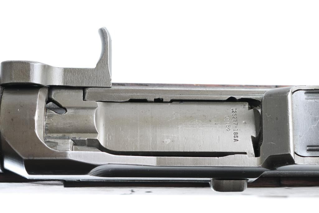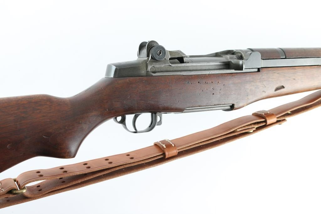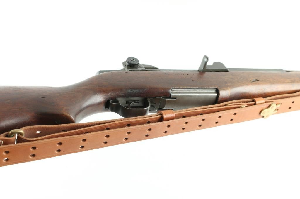 US military semiautomatic rifle, manufactured circa 1942. Features parkerized finish, wood stock & hand guards, 24" barrel (arsenal replacement dated 1952), adjustable sights with protected front blade & protected rear peep, fixed magazine for en-bloc clip, manual safety. Bore is good to very good condition, fairly bright with strong rifling. Metal parts retain 90% medium gray color finish, with slight differences to color for each component; receiver shows thinner looking smooth finish with darker color at rear of receiver. Bare metal is visible along sharp edges, and at scratches near muzzle. Early style triggerguard with machined hole at rear of bow. Later style sights without locking bar. Wood is good serviceable condition with dings & dents, overall solid and showing very good fit to metal, appears cleaned or thinning finish around forend. Two small holes drilled in left side of stock below action. Includes excellent condition leather sling. Condition is NRA Very Good+ (Arsenal Rebuilt) *** C&R Firearm ***