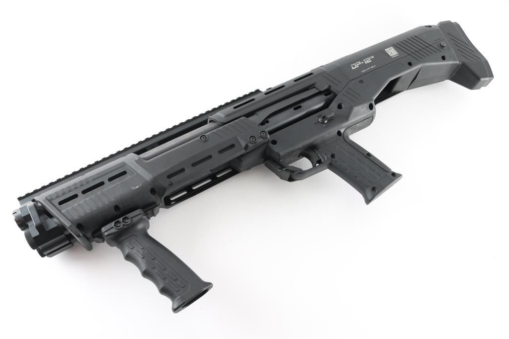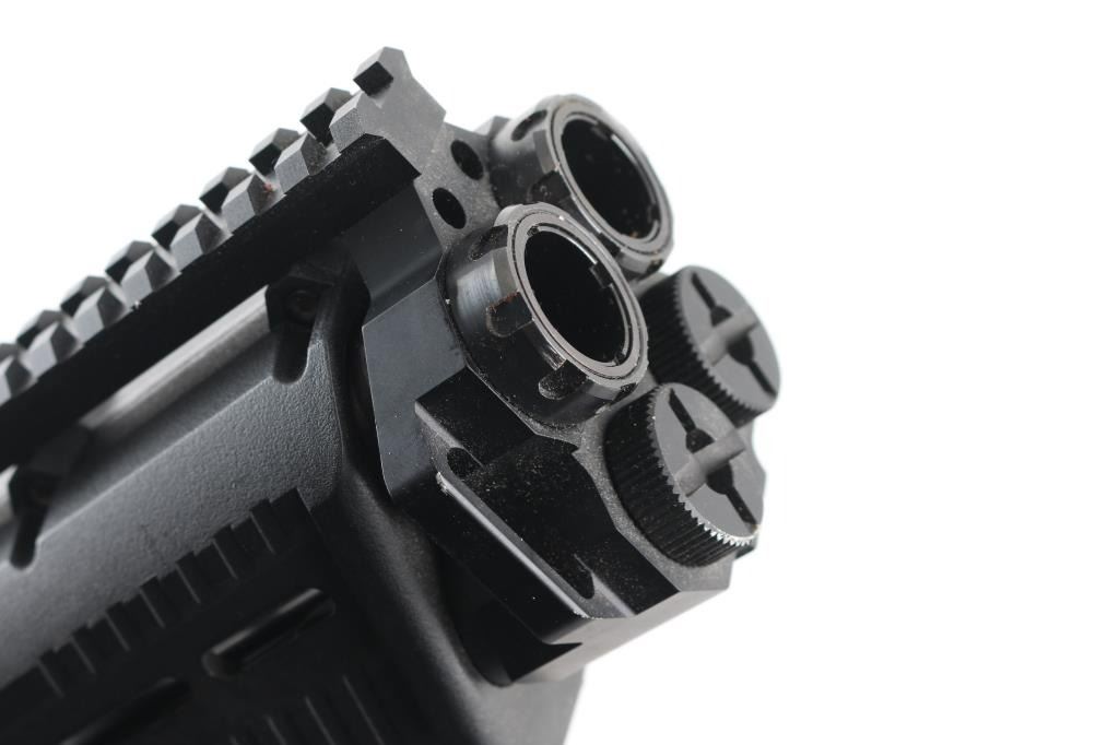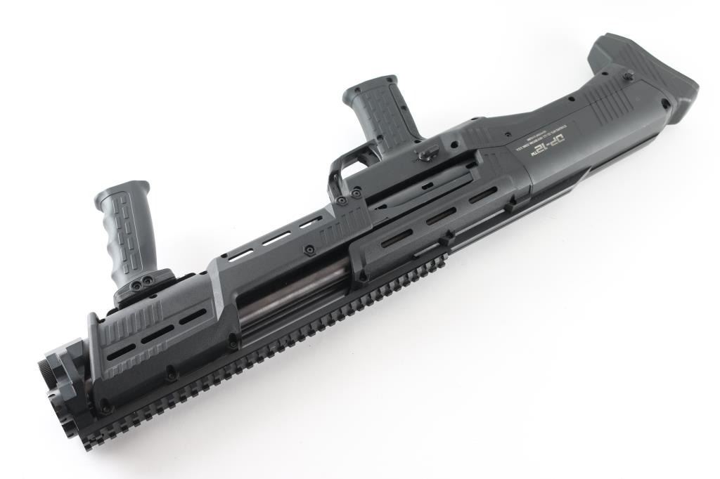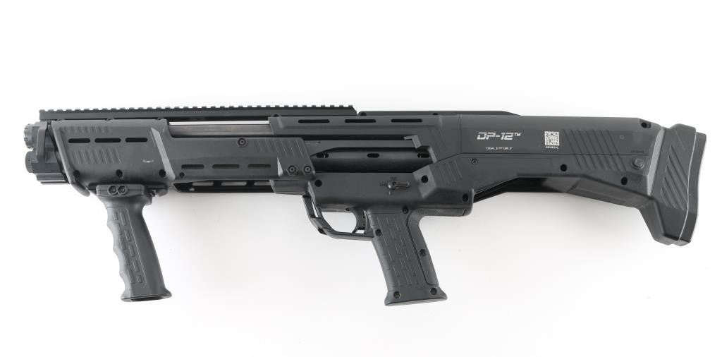 Double barrel pump bullpup shotgun. Single trigger fires each barrel in succession, after which a single pump cycle will reload both barrels. Accepts 2-3/4" or 3" shells. Features matte black finish, black polymer furniture with pistol grip, 18-7/8" barrels, 7 round mag tubes (16 total rounds can be loaded), screw-in chokes ("Spreader" chokes installed, uses Tru-Choke pattern tubes), forward sling slots, ambi manual safety, curved solid rubber buttpad, Picatinny rail section along top of receiver, and underside of pump handle. Forward pistol grip attached to pump handle. Bores are very good. Overall like new condition with handling marks. Condition is NRA Excellent *** Modern Firearm ***