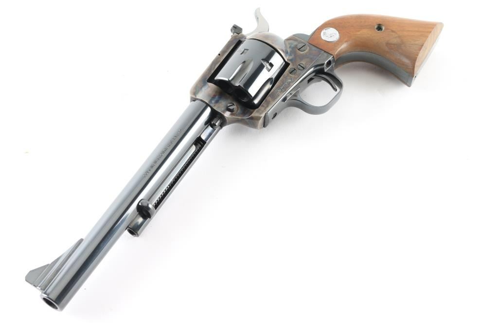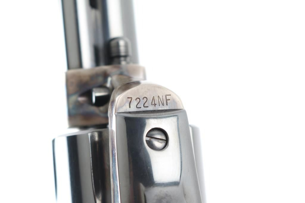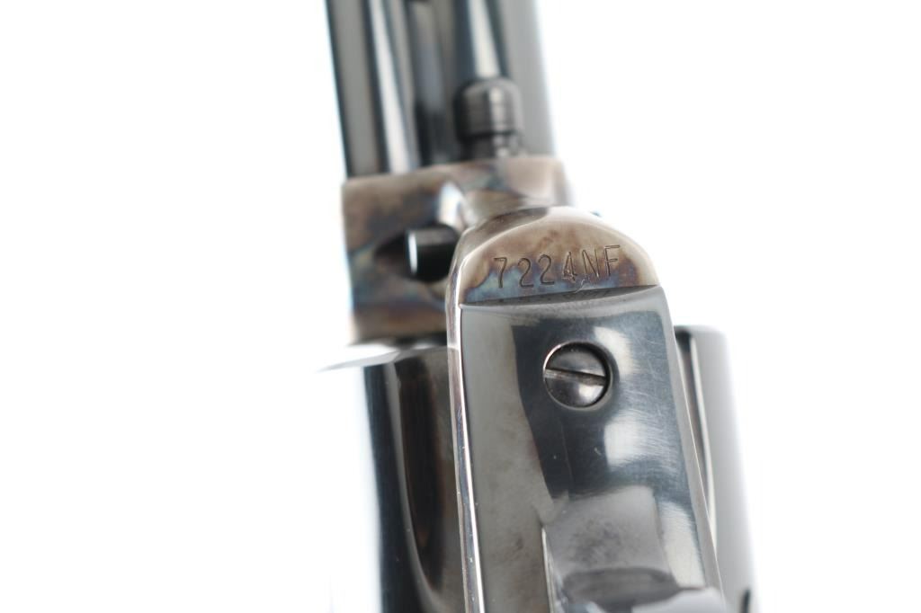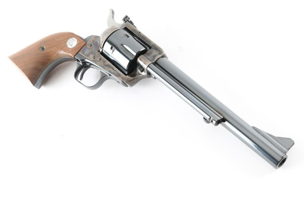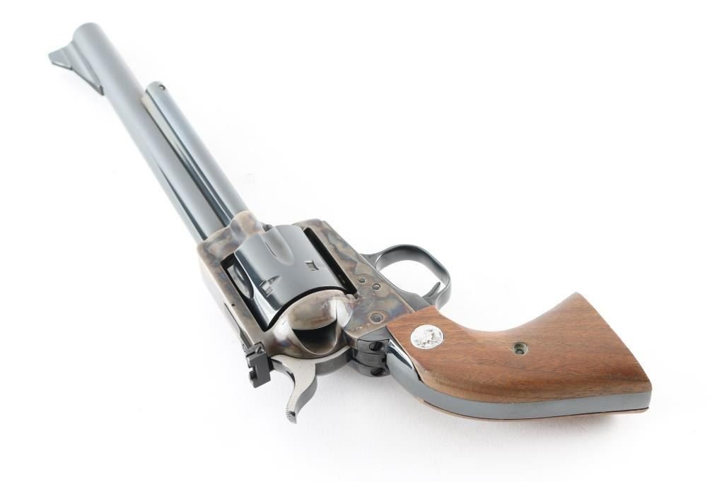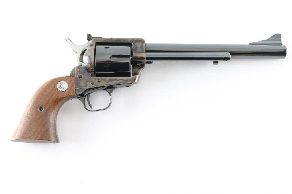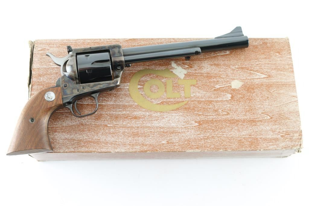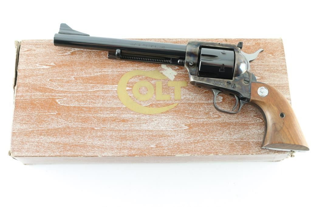 Single action revolver manufactured circa 1974. Features 7.5" barrel, blued/case colored finish, adjustable rear sight, smooth walnut grips with colt medallions. Retains over 98% finish, with no visible drag line. Cylinder not turned during inspection. Includes matching styrofoam & wood grained cardboard box. Condition is NRA Excellent - like new *** Modern Firearm ***