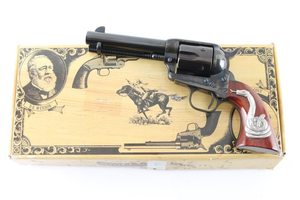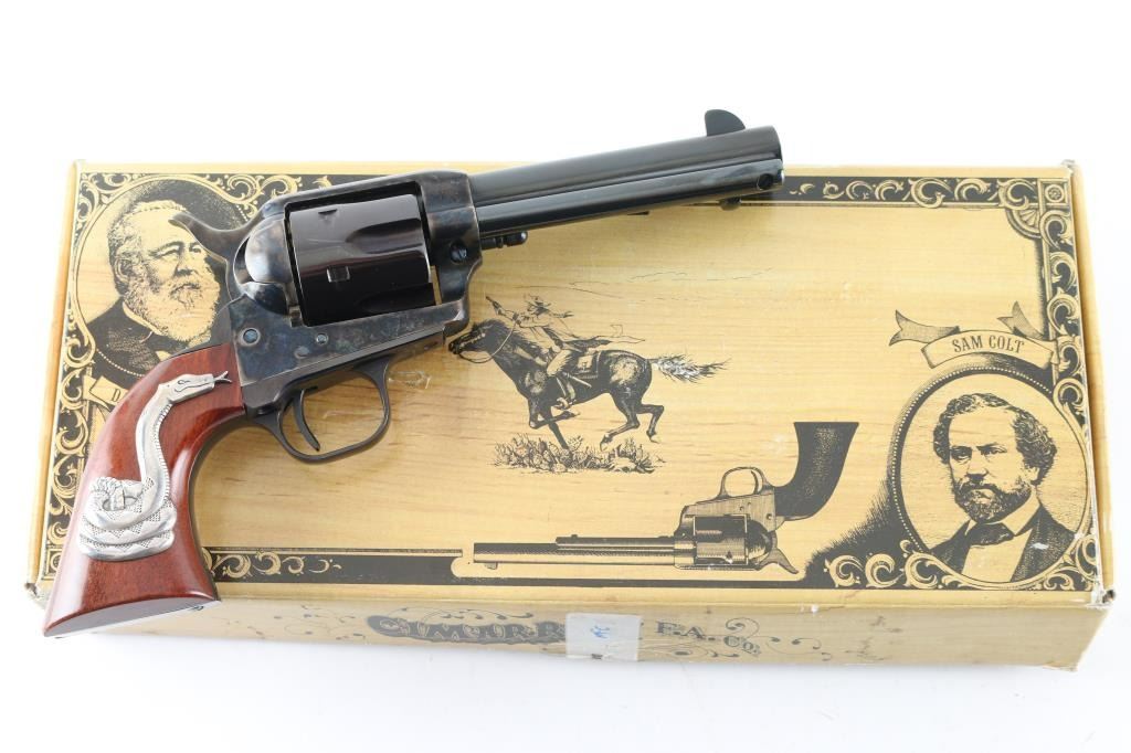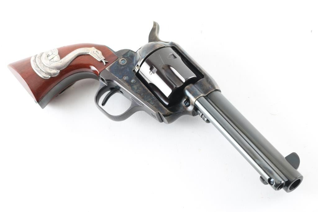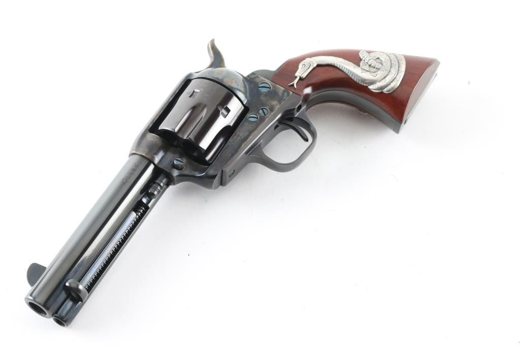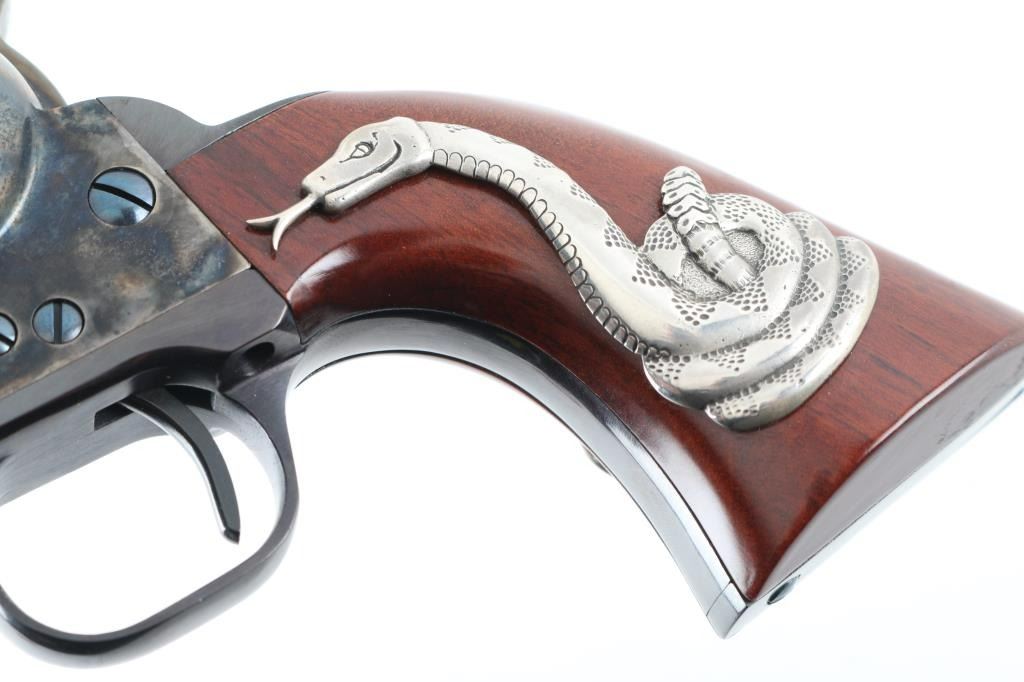 'Man With No Name' It doesn't matter if you're Good, Bad or Ugly, for "A Fist Full of Dollars" this gun can be yours. It's a tip of the ten gallon hat to Clint Eastwood's characters in Sergio Leone's trilogy. Made in Italy by Uberti for Cimarron Firearms out of Texas, it's a Single Action, 6 shot revolver chambered for .45 Colt cartridges. It features a 4.75" blued barrel, grip frame and fluted cylinder. The frame and hammer are case colored. It sports a blade front sight, integral rear sight, thin smooth trigger and knurled hammer spur. The reddish walnut grips with Snake inlay make this the "Man With No Name" gun. The metal finish looks great. Case color looks great. Grips look great. Bore looks very good, bright. Comes with original factory cardboard box and owners manual. Remember, no matter what the current bid is "For A Few Dollars More" it's yours! Condition is NRA Excellent *Modern Firearm*