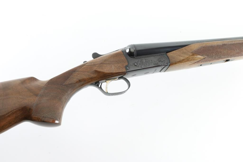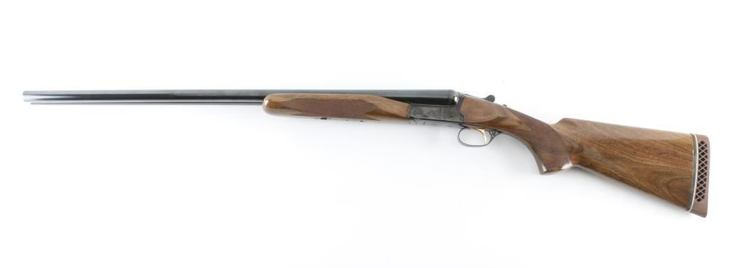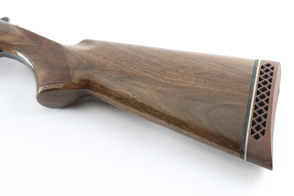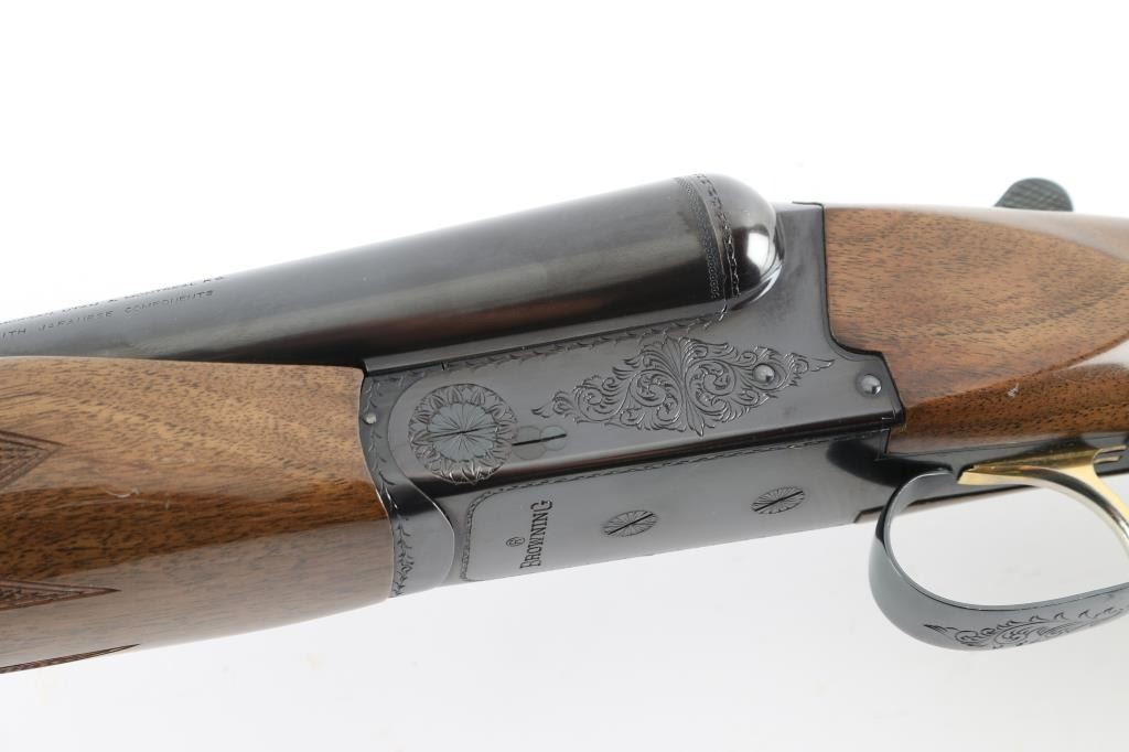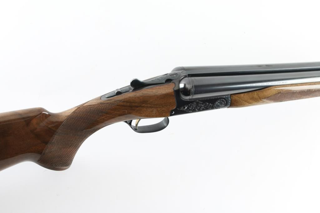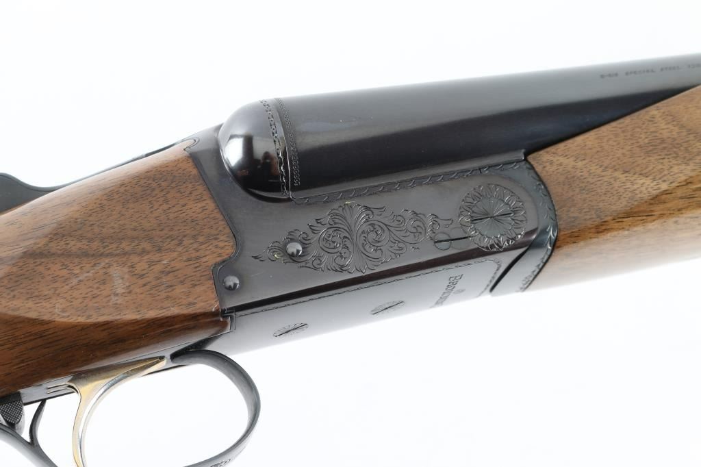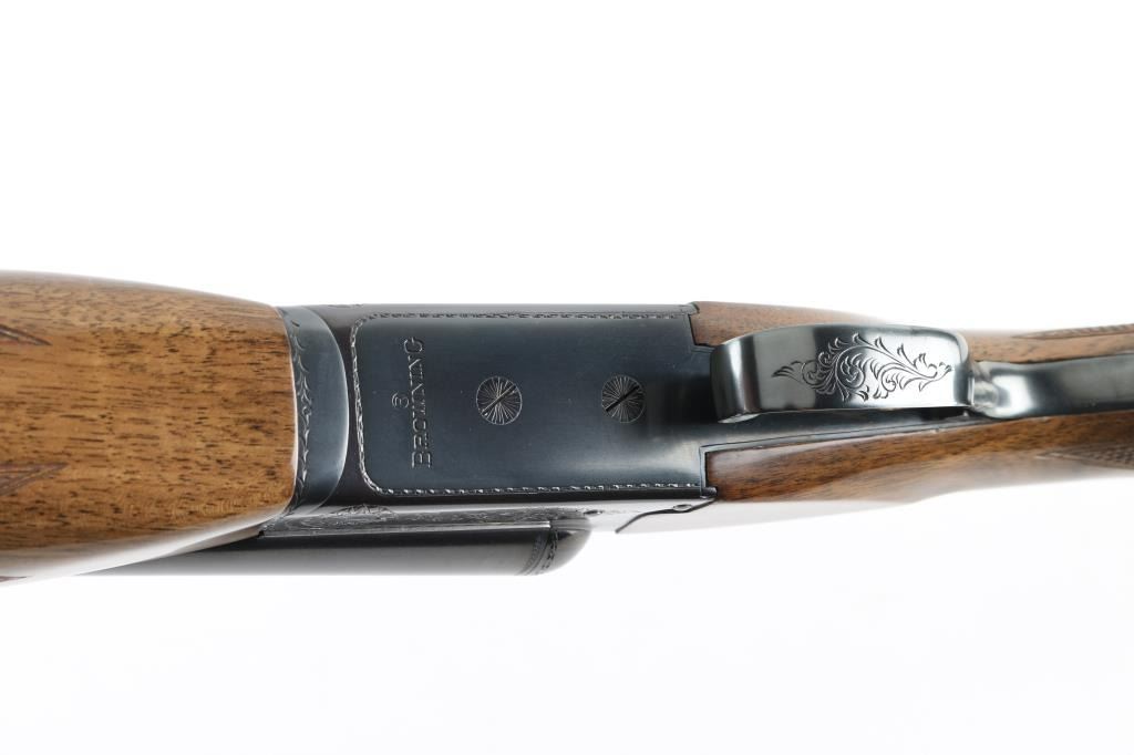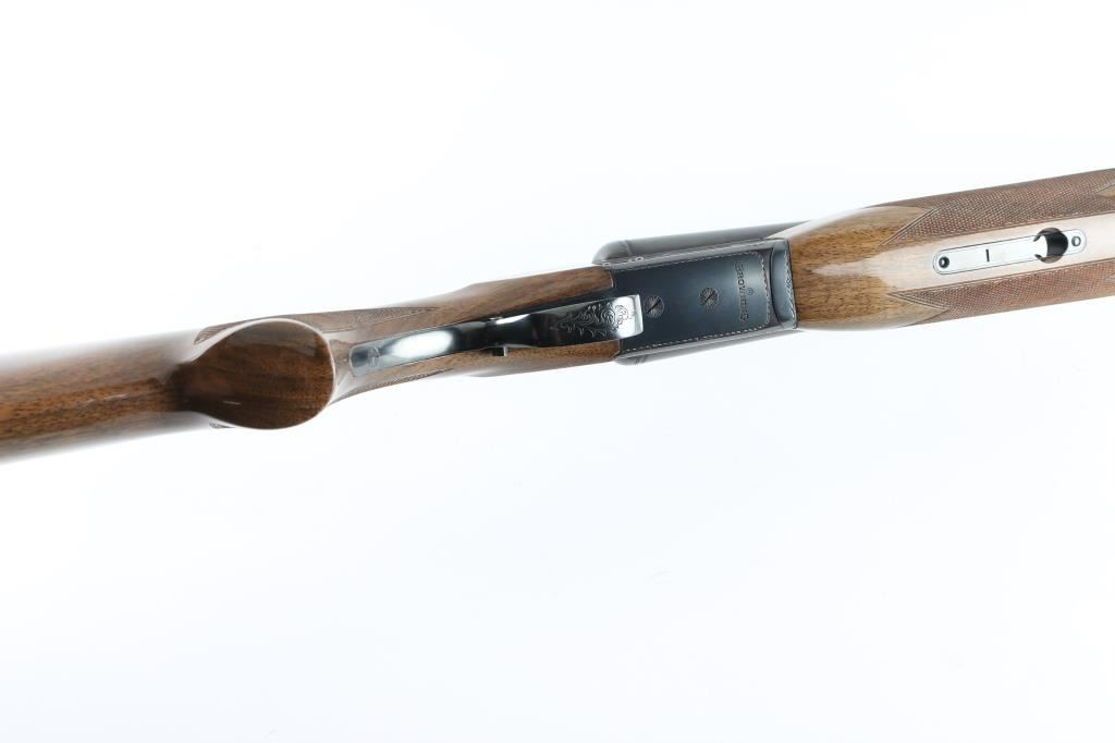 Assembled in Korea with Japanese parts circa 1978, imported by Browning Arms Co, Morgan UT. Double barrel side-by-side shotgun takes up to 3" shells. Features blued finish, engraved receiver, urethane finished wood, checkered wide beavertail forend, checkered pistol grip stock with ventilated rubber recoil pad, single trigger with gold color accent, barrel selector at rear of trigger, tang safety, selective ejection, steel bead front sight. Engraving consists of border pattern on forward edges of receiver, floral scroll pattern on receiver sides, top of lever and on triggerguard bottom. 28" Barrels. Bores are excellent, fixed chokes measure FULL left, MOD right. Overall appearance is excellent, retaining approx 98% finish, few signs of handling and use, some creases to right drop point. Approx stock measurements: 14-1/4" Length of Pull, 1-5/8" Drop at Comb, 2-1/2" Drop at Heel. Condition is NRA Excellent *** Modern Firearm ***