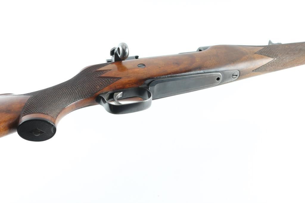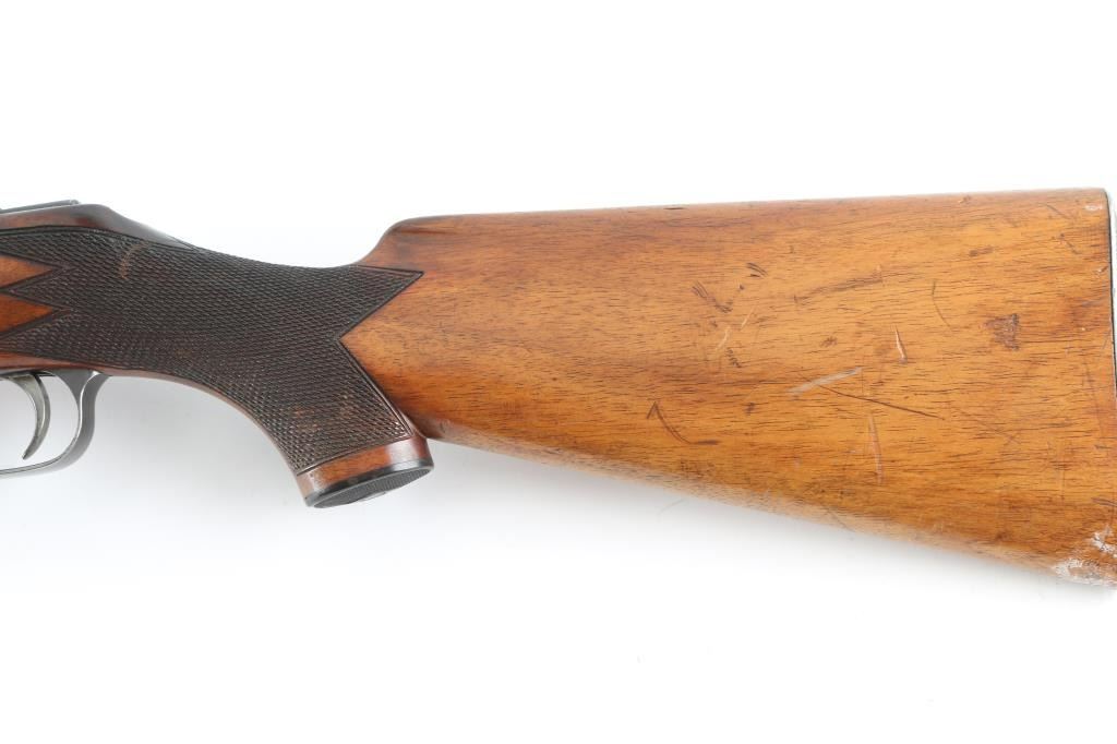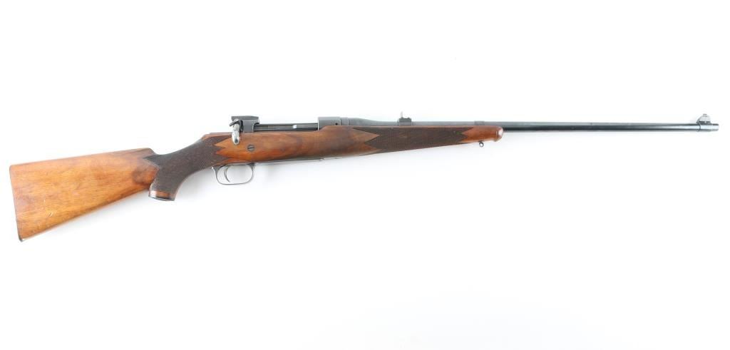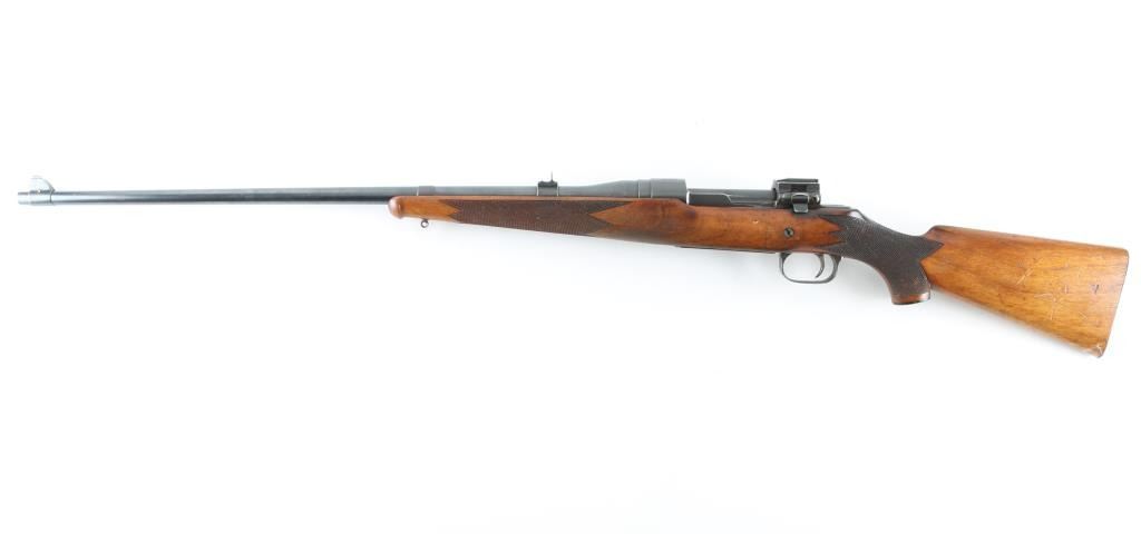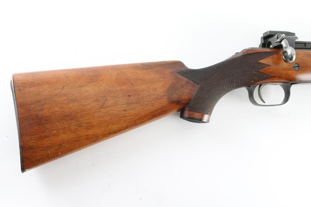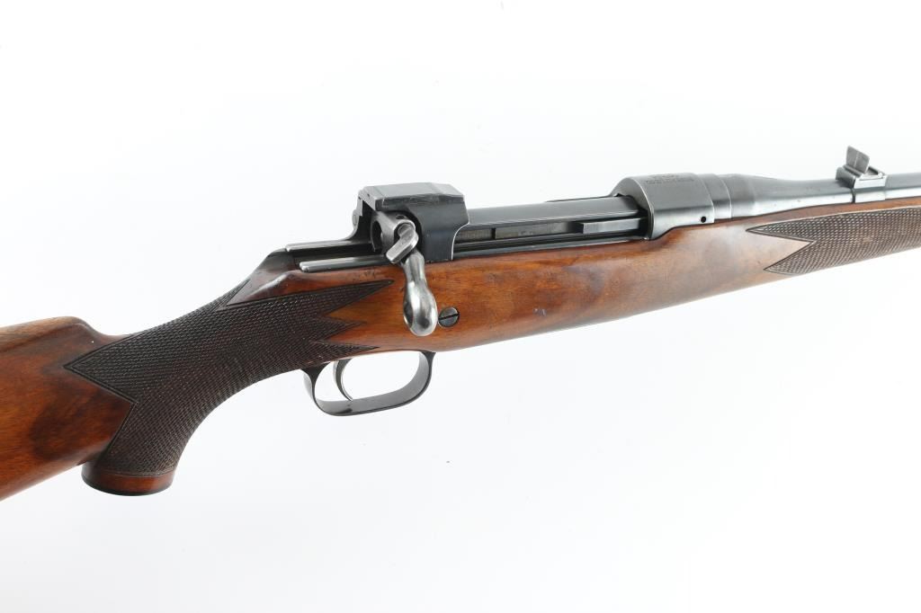 Canadian sporting rifle features straight pull bolt action, blued finish, checkered walnut stock with schnabel forend, checkered steel buttplate, approx 26" barrel, blade front sight, folding rear sight, manual safety. Forward eyelet for sling hook under forend, no rear eyelet. Bore is good to very good, bright with some light frosting. Retains 85% finish with scratches & scuffs, edge losses, thinning to gray on bottom metal. Wood is good or better, possibly lightly sanded and refinished, overall good+ with scratches and dents. Checkering is deep and even. Buttplate slightly proud of wood. Action operates smoothly. Condition is NRA Good++ *** C&R Firearm ***
