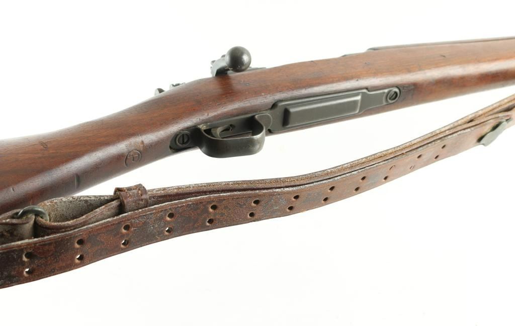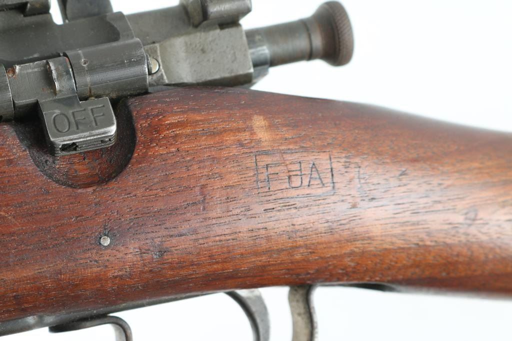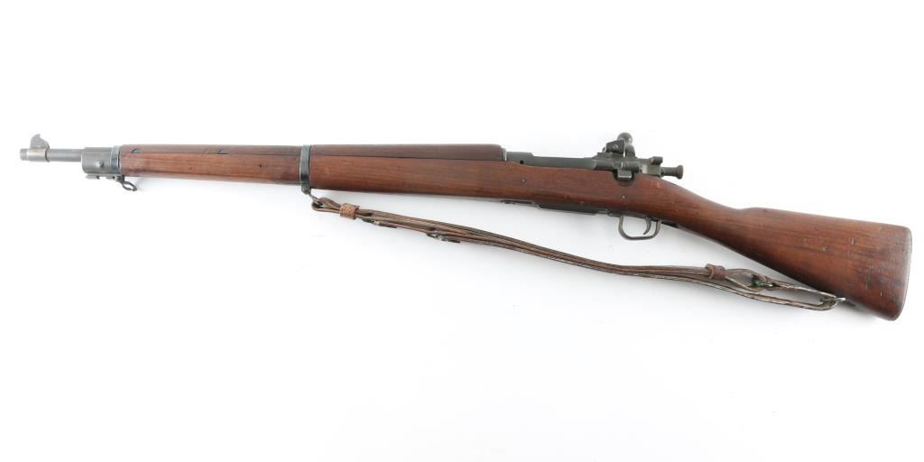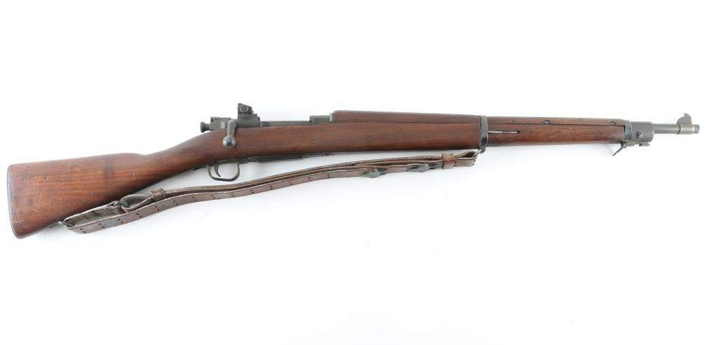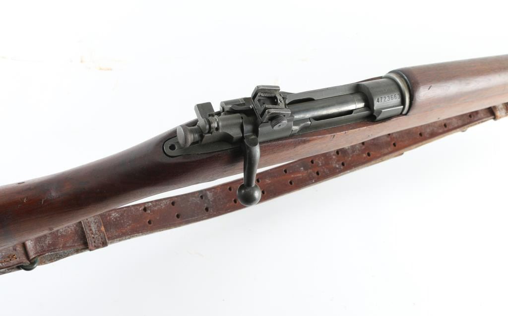 US Military WWII era bolt action rifle features parkerized arsenal re-finish, wood handguard & straight grip stock, blade front sight with protector installed, peep rear sight, bayonet lug, 24" barrel, three position safety, magazine cut-off, sling swivels, stacking swivel Bore is very good condition. Retains 90% of the parkerized finish. Barrel marked "SC 7-43" under flaming bomb. Wood is very good condition, with small dents and other evidence of service used. Visible stock cartouches include: "FJA", "P" proof. Includes good condition leather sling. Condition is NRA Very Good (arsenal rebuilt) C&R firearm.