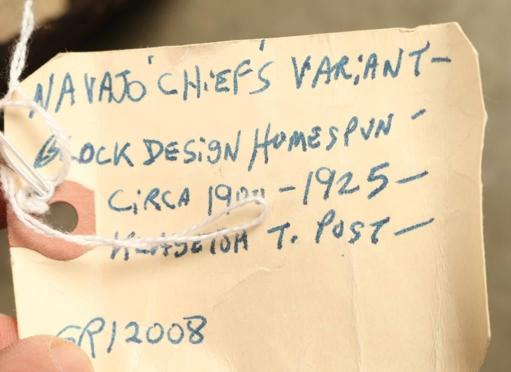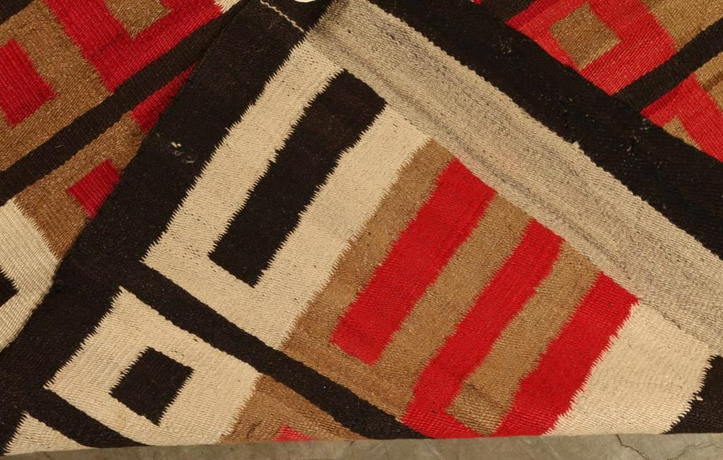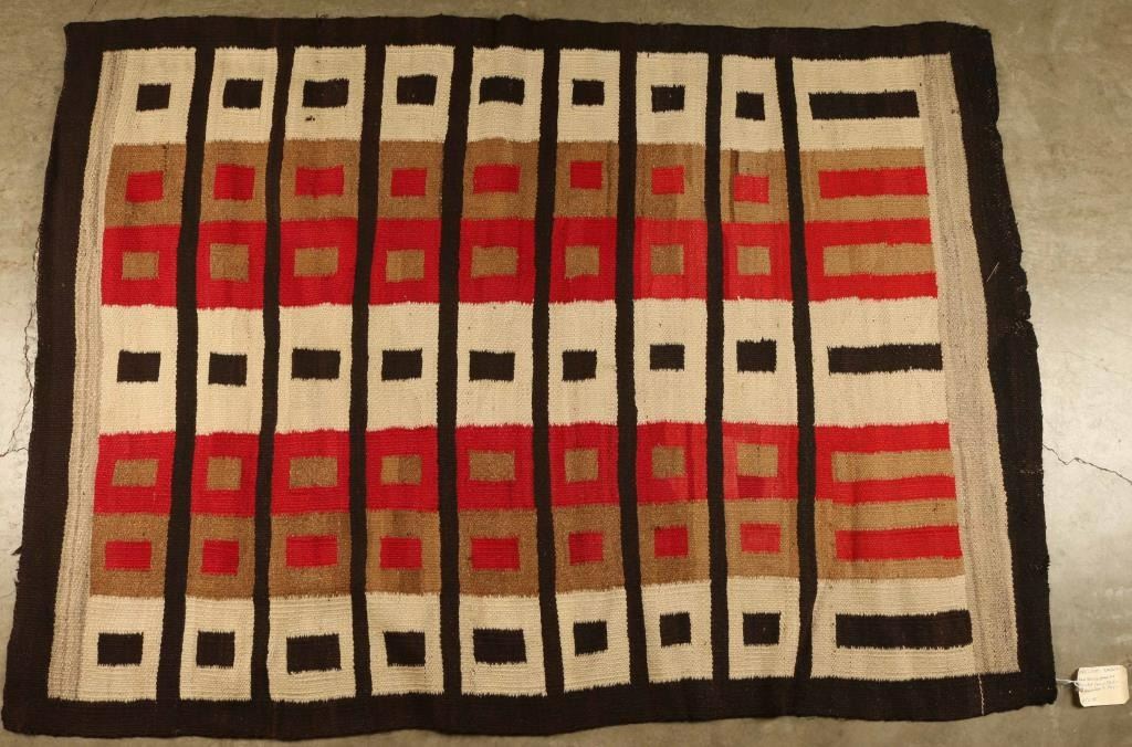 with geometric block design in red, black, white, and grey. Measures 65" x 48". Circa 1900-25. In overall good condition but is slightly misshapen, from the Klagetoh Trading Post.