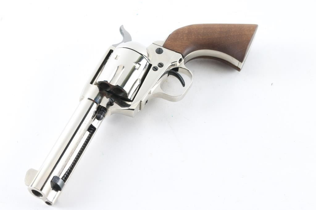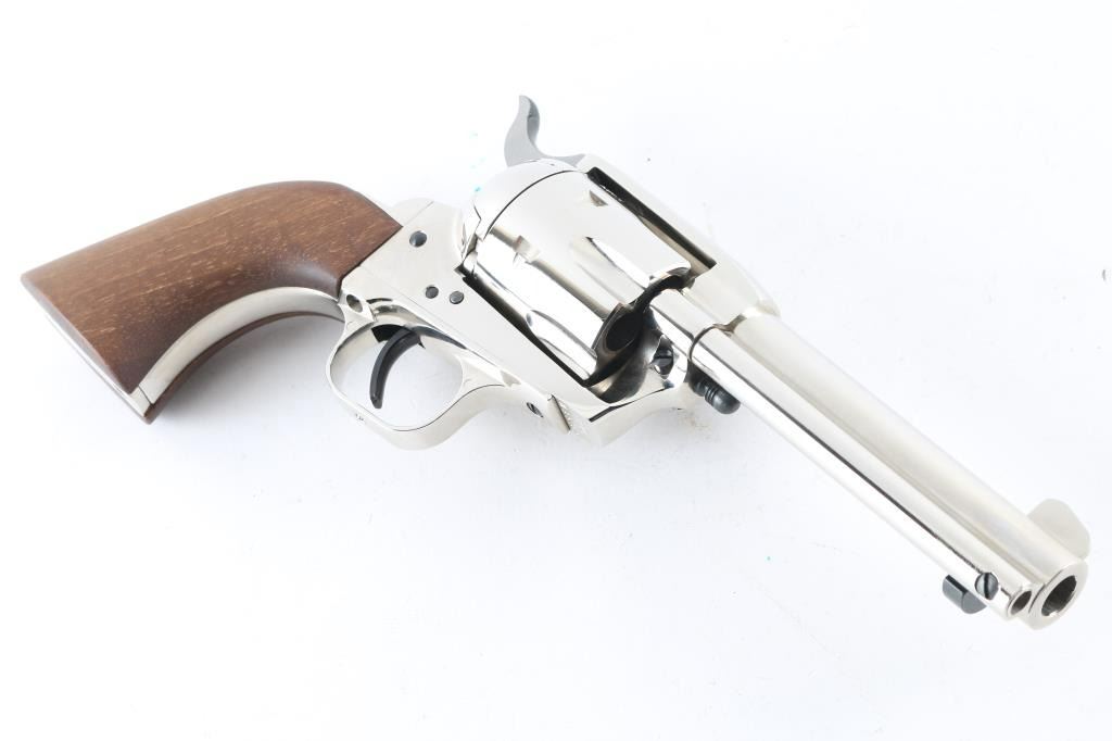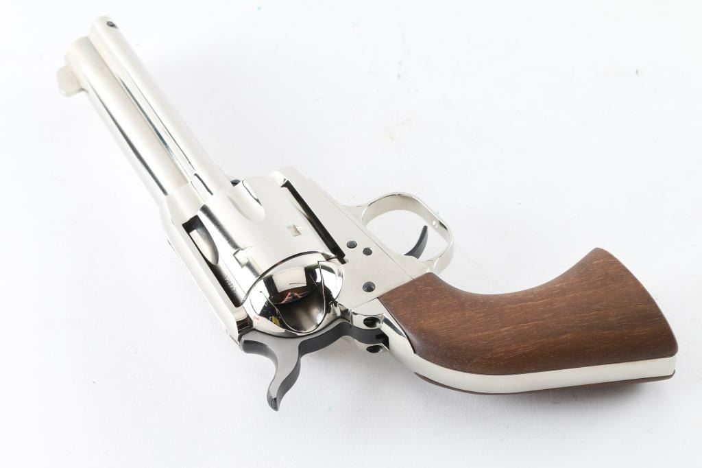 Made in Germany by HWM today’s EAA Big Bore Bounty Hunters are the descendants of the old Hawes Western Marshal. The German firm of J.P. Sauer made the Western Marshal. Sauer sold their revolver operation and tooling to HWM. The Bounty Hunter is a nickel plated, 6 shot Single Action revolver chambered for .44 Magnum cartridges. It has 4.5" barrel, a blade front sight, integral rear sight, fluted cylinder, thin smooth trigger, knurled hammer spur and smooth walnut grips. The ejection rod, trigger and top of hammer are blued. Nickel finish looks very good with some minor signs of use or handling. The wood grips are fine. The bore looks good, a little dusty but bright. Comes with the original factory cardboard box and owners manual. Condition is NRA Very Good+ *Modern Firearm*