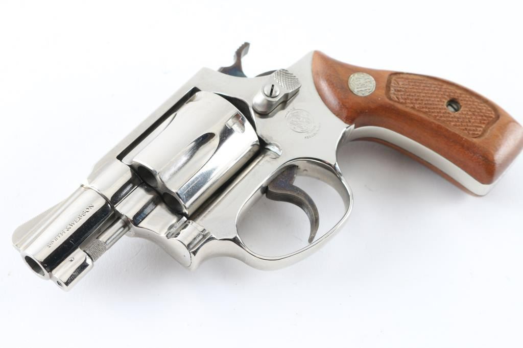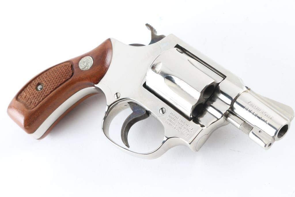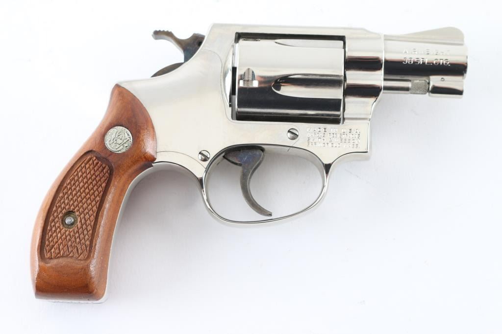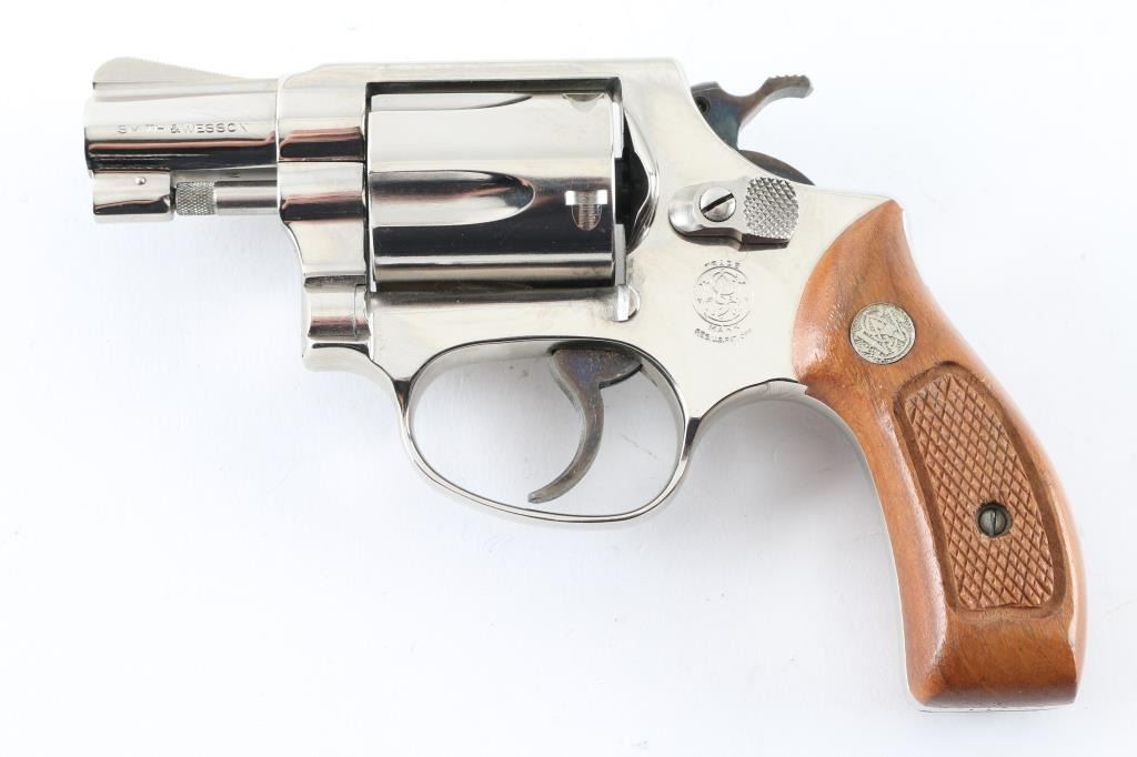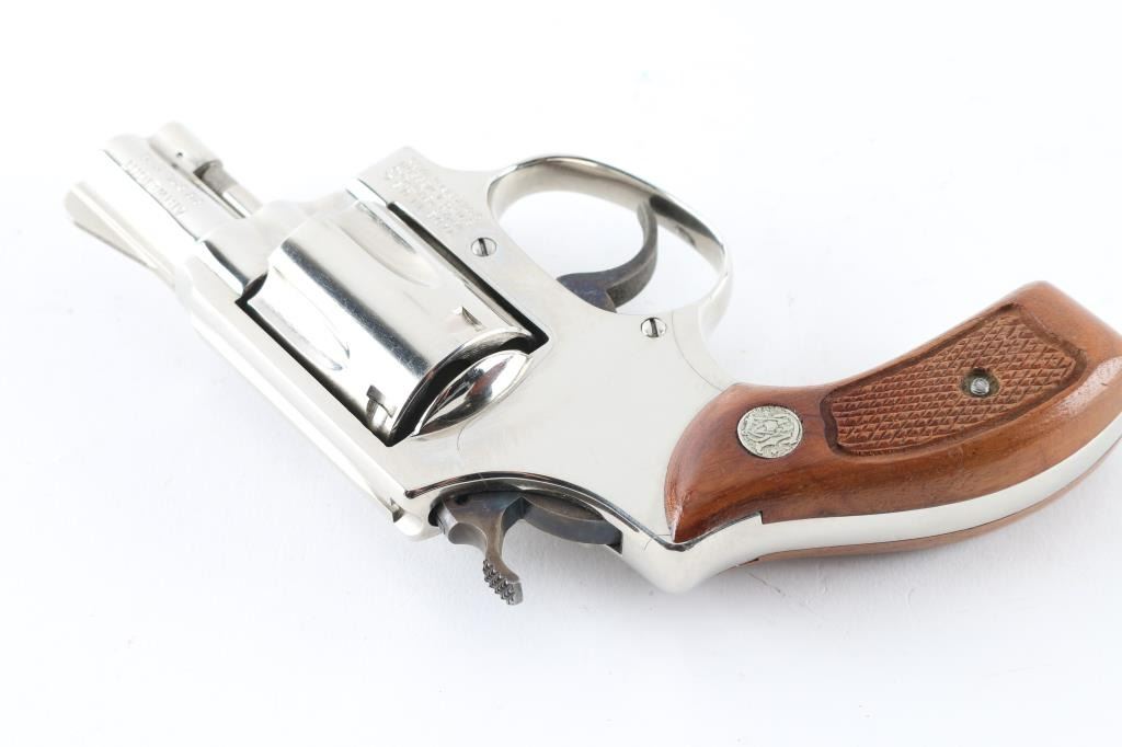 'No Dash - Airweight' Compact double action revolver circa 1981. Features factory nickel finish, 1-7/8" barrel, fixed sights, fluted 5 shot cylinder, case color grooved narrow trigger & knurled narrow hammer, round butt lightweight alloy frame, checkered wood Magna grips with S&W medallions. Bore is very good condition. Finish is excellent with tiny scratches, light drag line. Grips are very good. Action is smooth with tight lock-up. Condition is NRA Excellent *** Modern Firearm ***