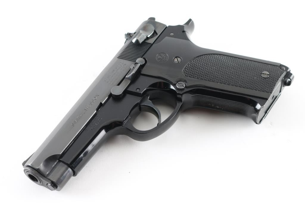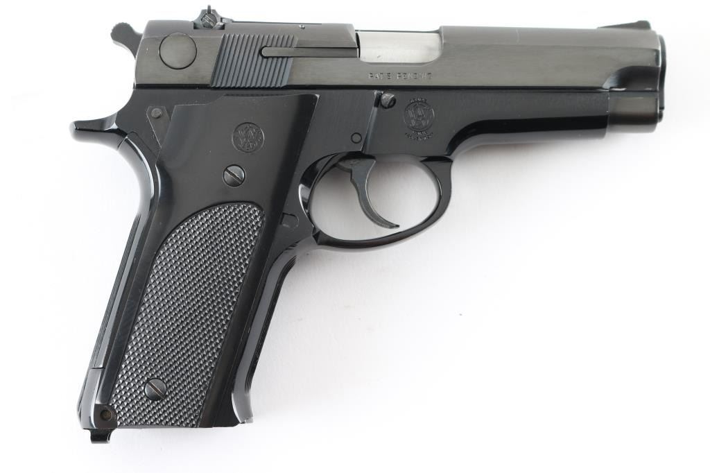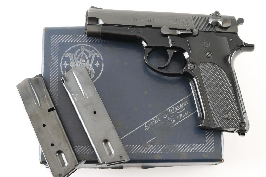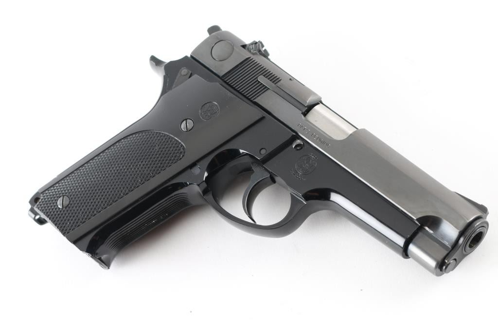American made DA/SA semi-auto pistol chambered in 9mm Parabellum circa 1977-1978. This is known in some circles as the first "Wonder Nine". It features a blued steel slide and alloy frame, 4" barrel, serrated ramp front sight and micro click square-notch rear sights. It sports a manual thumb safety/decocker, a magazine disconnect, serrated fore strap and backstrap and checkered black plastic grips with S&W logos. Metal finish is very good with almost no signs of handling, same with the grips. The bore looks very good, just dusty. There is a small bright scuff on the front strap other than that this gun looks great. Comes with original S&W blue cardboard box, owners manual and three S&W factory magazines. Condition is NRA Very Good+ *Modern Firearm*