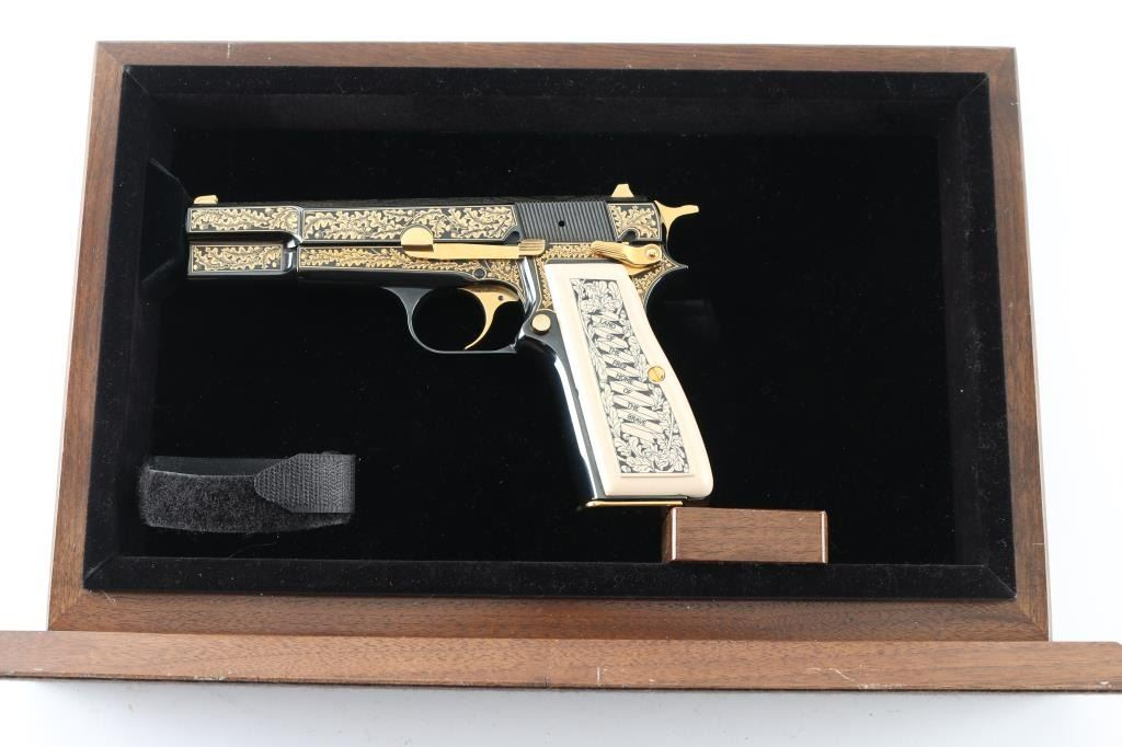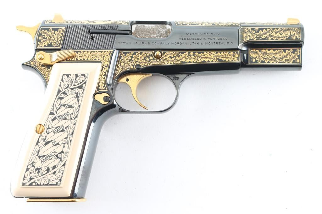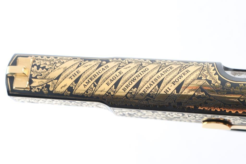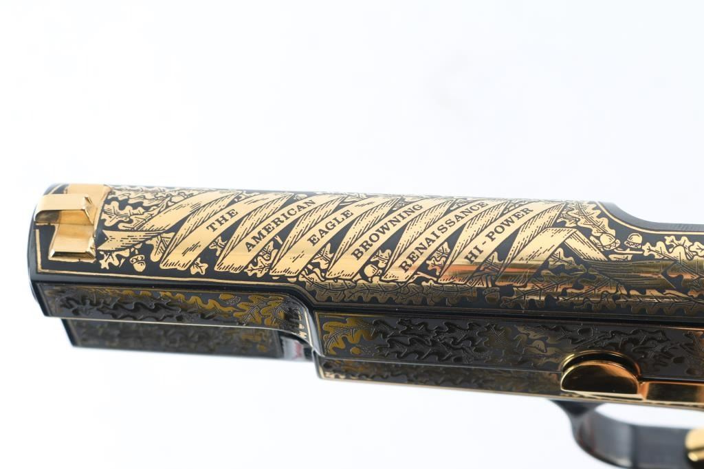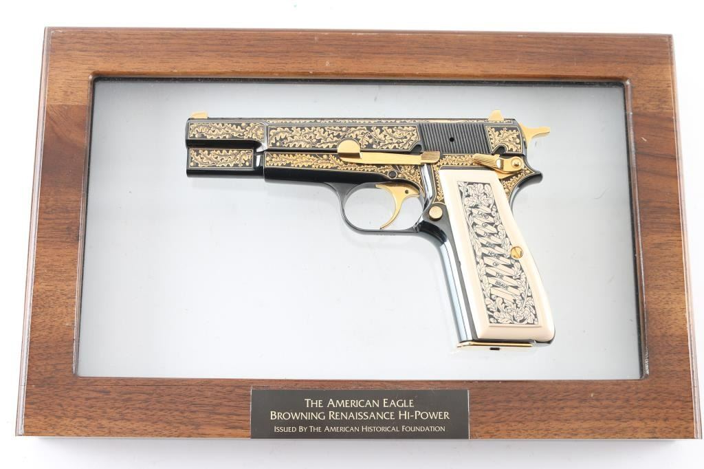 Made in Belgium and assembled in Portugal, this Special Edition Browning Renaissance Hi-Power circa 1993-1994 is a very desirable addition to any collection. Only 750 were made and comes with a wooden, glass top, felt lined display case. The display case has a name plate that reads in three lines "The American Eagle"/"Browning Renaissance Hi-Power"/"Issued By The American Historical Foundation". The gun itself features a high polished blued slide and frame that is highly etched in 24kt gold including The Great Seal of the United States of America on the top of the slide as well as 24kt gold plated sights, hammer, trigger, safety, slide release, magazine release, magazine floor plate and grip screws. Ivory polymer plastic grips are engraved "The United States of America" on the right and "Land Of The Free Home Of The Brave" on the left. The bottom of the trigger guard reads "AEO45". Overall the gun looks great with two exceptions. There is some light surface rust on the right side of the barrel at the ejection port which covers the caliber and serial number engraving. There is also some surface rust on the frame at the muzzle. The grips look great. Bore looks good but needs cleaned. Condition is NRA Very Good with the two exceptions noted above. *Modern Firearm*