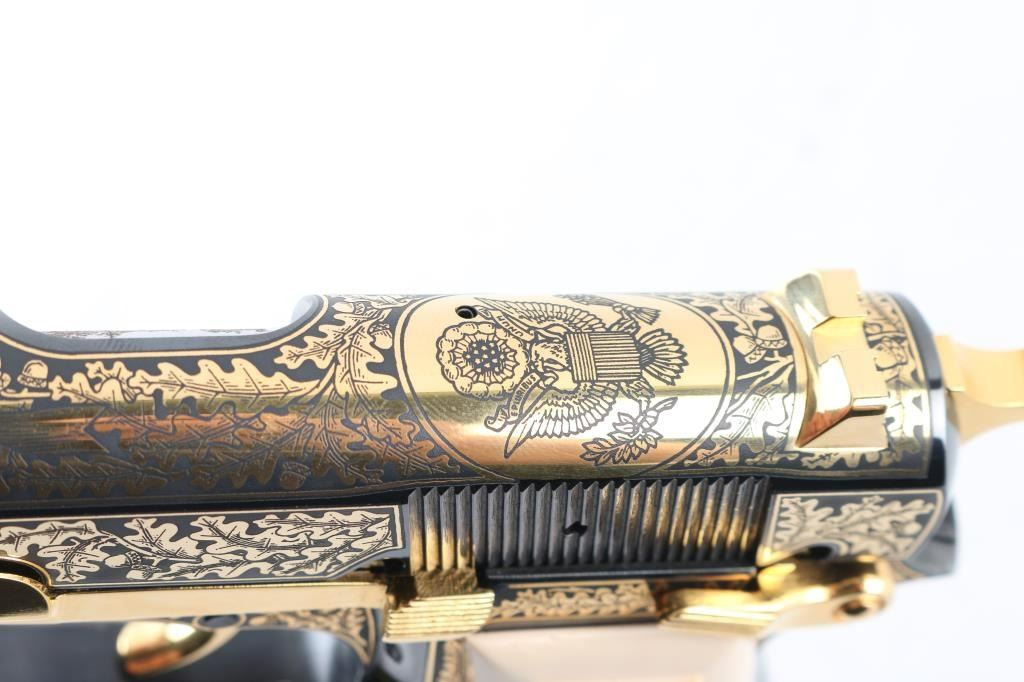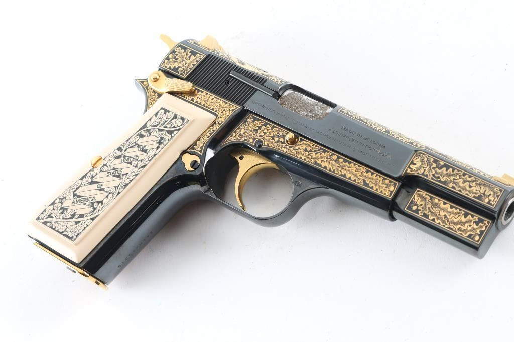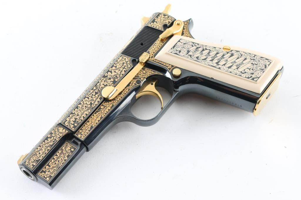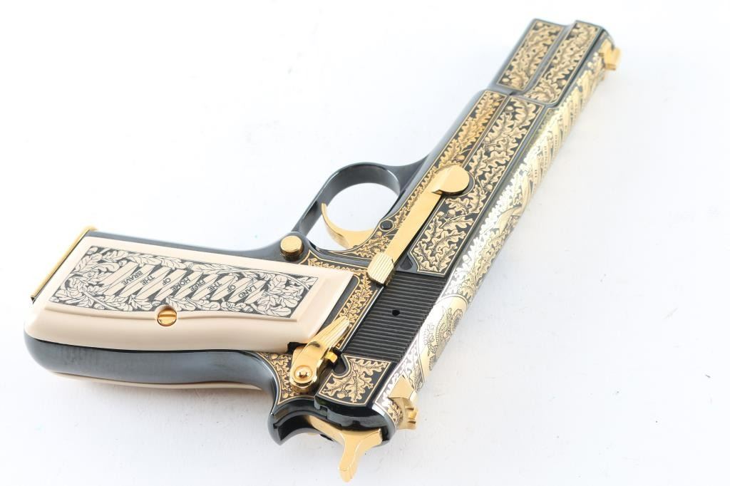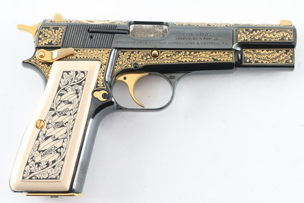 Made in Belgium and assembled in Portugal, this Special Edition Browning Renaissance Hi-Power circa 1993-1994 is a very desirable addition to any collection. Only 750 were made and comes with a wooden, glass top, felt lined display case. The display case has a name plate that reads in three lines "The American Eagle"/"Browning Renaissance Hi-Power"/"Issued By The American Historical Foundation". The gun itself features a high polished blued slide and frame that is highly etched in 24kt gold including The Great Seal of the United States of America on the top of the slide as well as 24kt gold plated sights, hammer, trigger, safety, slide release, magazine release, magazine floor plate and grip screws. Ivory polymer plastic grips are engraved "The United States of America" on the right and "Land Of The Free Home Of The Brave" on the left. The bottom of the trigger guard reads "AEO45". Overall the gun looks great with two exceptions. There is some light surface rust on the right side of the barrel at the ejection port which covers the caliber and serial number engraving. There is also some surface rust on the frame at the muzzle. The grips look great. Bore looks good but needs cleaned. Condition is NRA Very Good with the two exceptions noted above. *Modern Firearm*