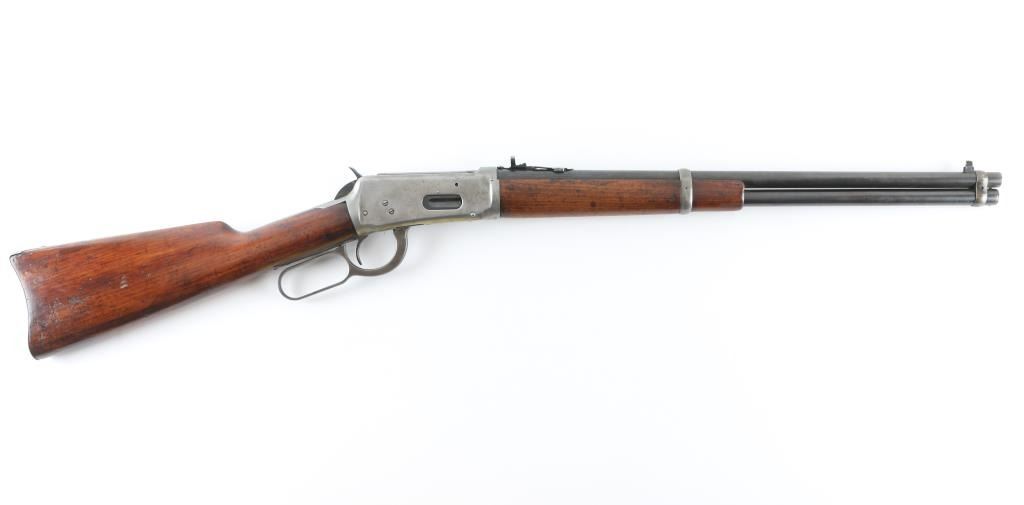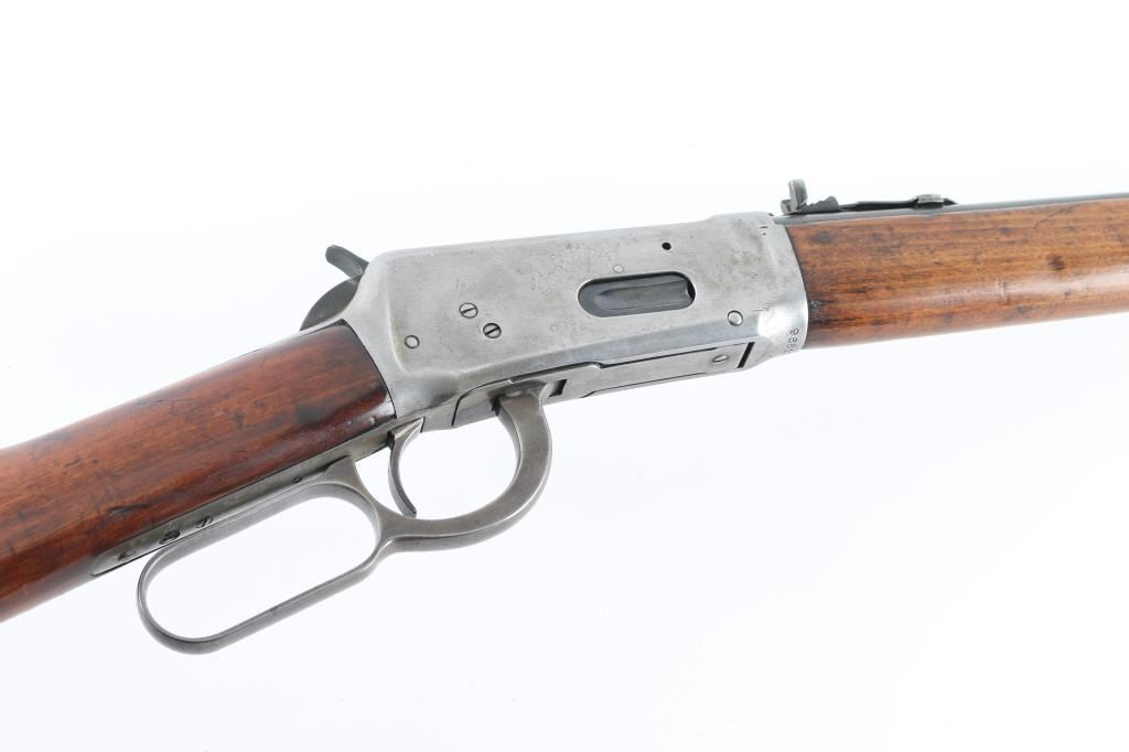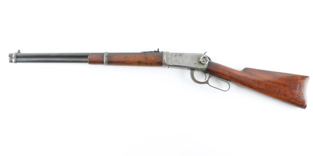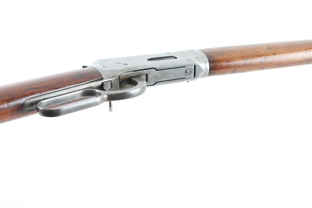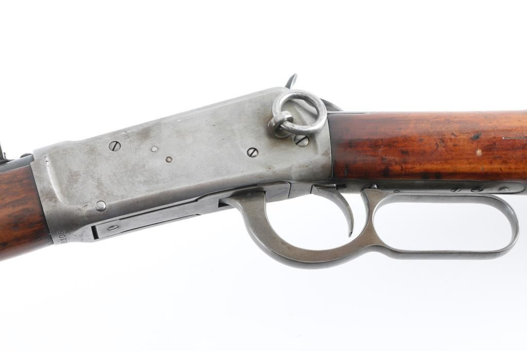 'Saddle Ring Carbine (SRC)' Lever action rifle manufactured circa 1925. Features saddle ring on left side of receiver, 20" round barrel, full length magazine tube, pinned blade front sight, buckhorn rear sight, smooth walnut forend & straight wristed buttstock, steel carbine buttplate. Bore is good condition, a bit dull and frosted with strong rifling. Barrel & magazine tube are blued, good coverage, showing a brownish color. Bands are a mix of bare metal and thin brown color. Receiver is a dull grayish silver bare metal. Wood is good condition, varnished, light shrinkage or erosion at tang and buttplate, oil stained where wood touches metal, dented throughout. Handguard appears lightly sanded. Condition is NRA Good+ *** C&R Firearm ***