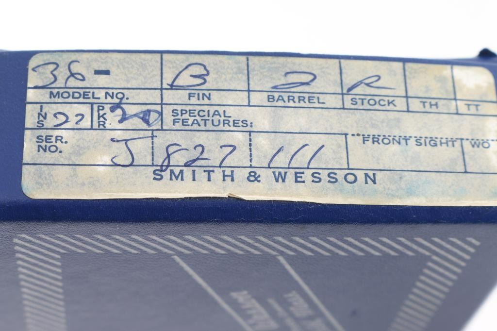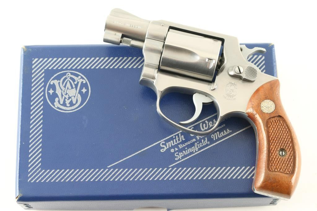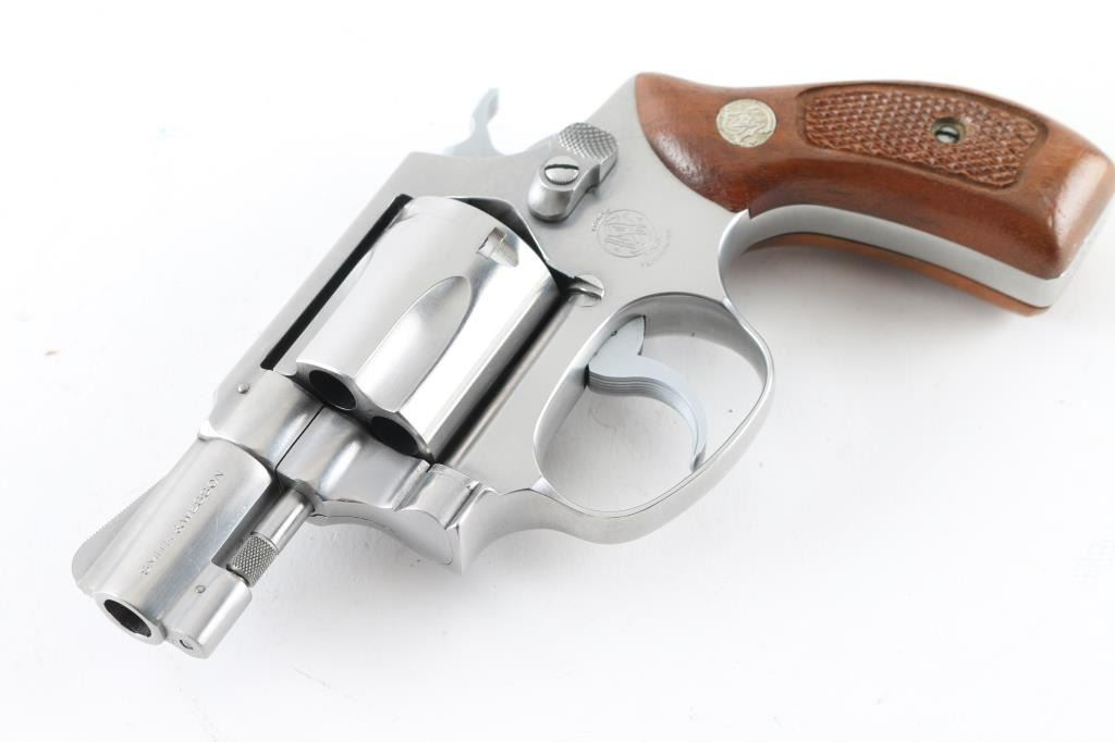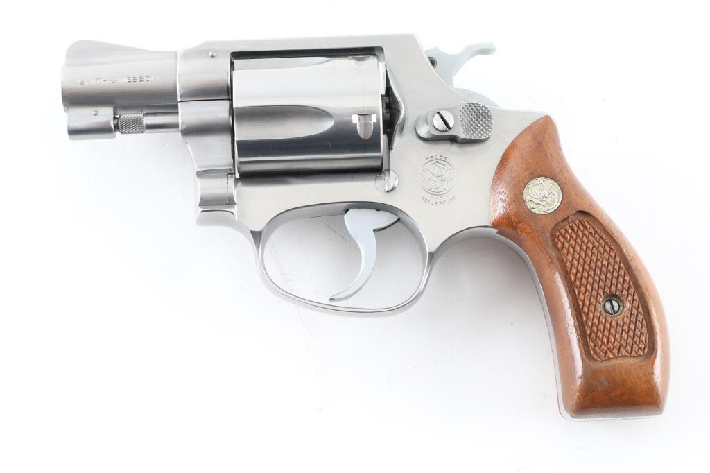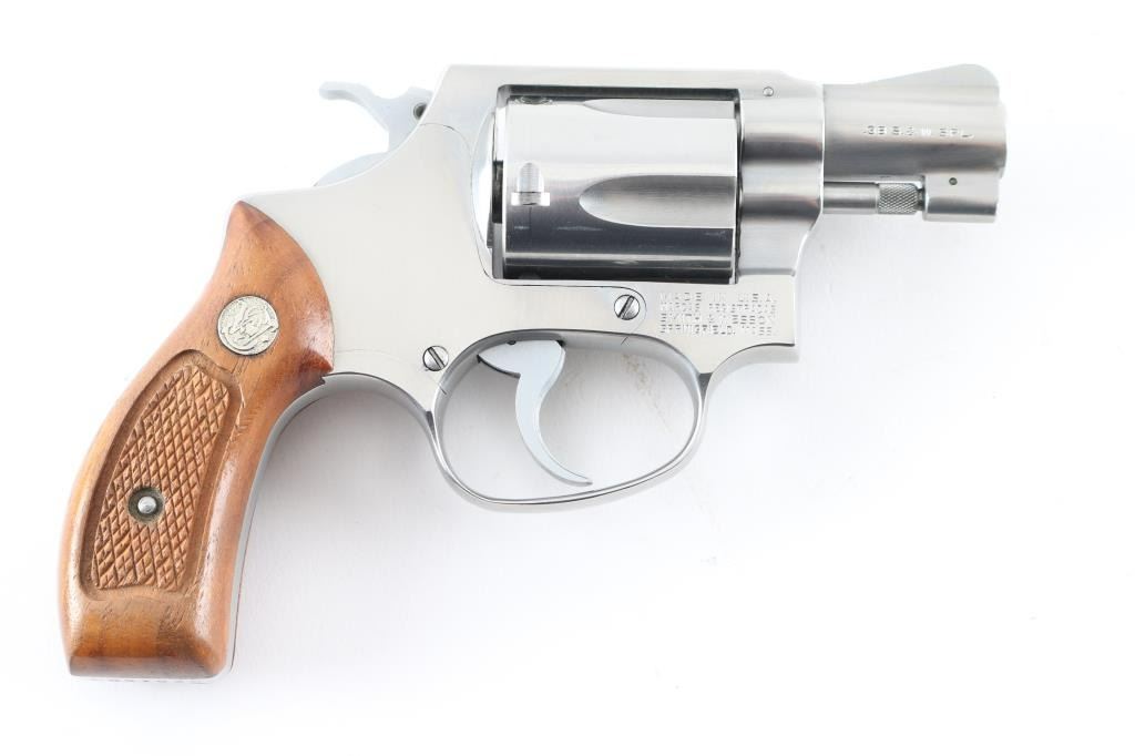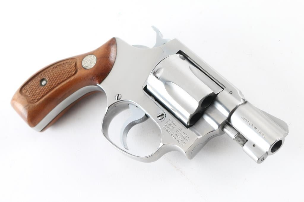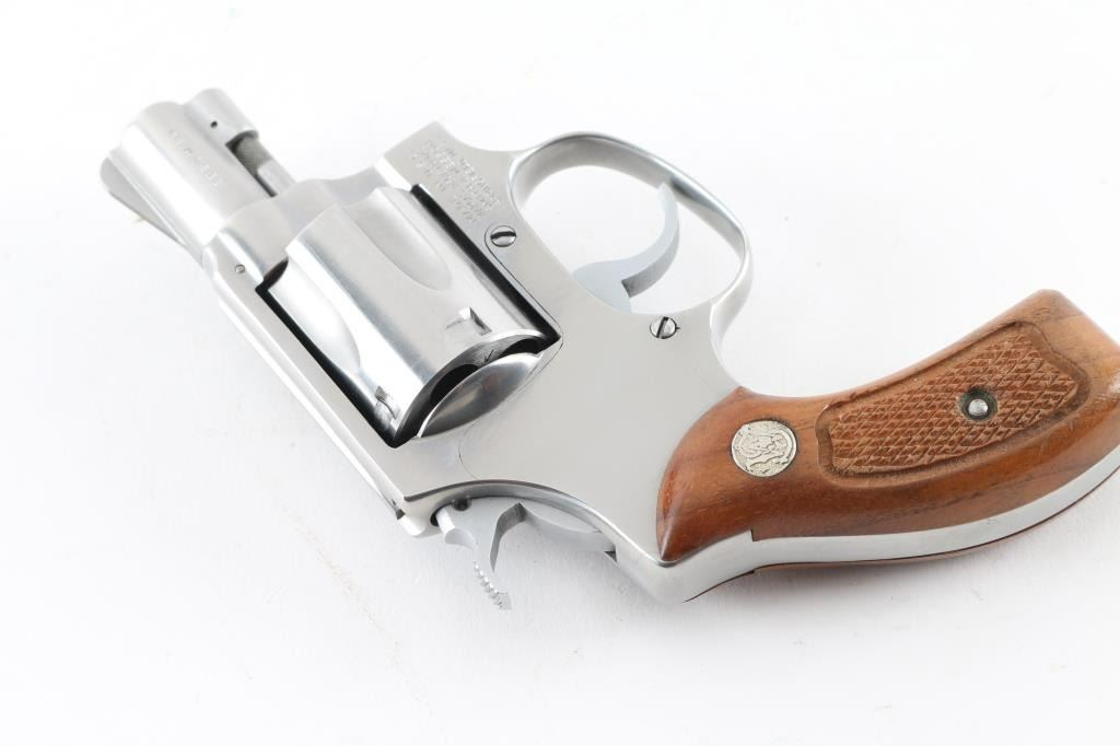Pinned - No Dash. Compact double action revolver manufactured circa 1981. Features stainless steel construction, checkered wood Magna grips with S&W medallions, 1-7/8" barrel, fixed sights, round butt, "J" frame, 5 shot fluted cylinder. Overall condition is like new with smooth operation and tight lock-up, few minor signs of handling. Grips are very good. Includes factory cardboard box (serial number on box does not match this gun) with paperwork & cleaning gear Condition is NRA Excellent - like new *** Modern Firearm ***