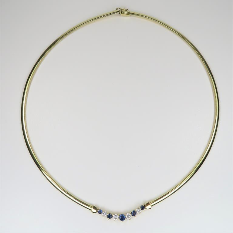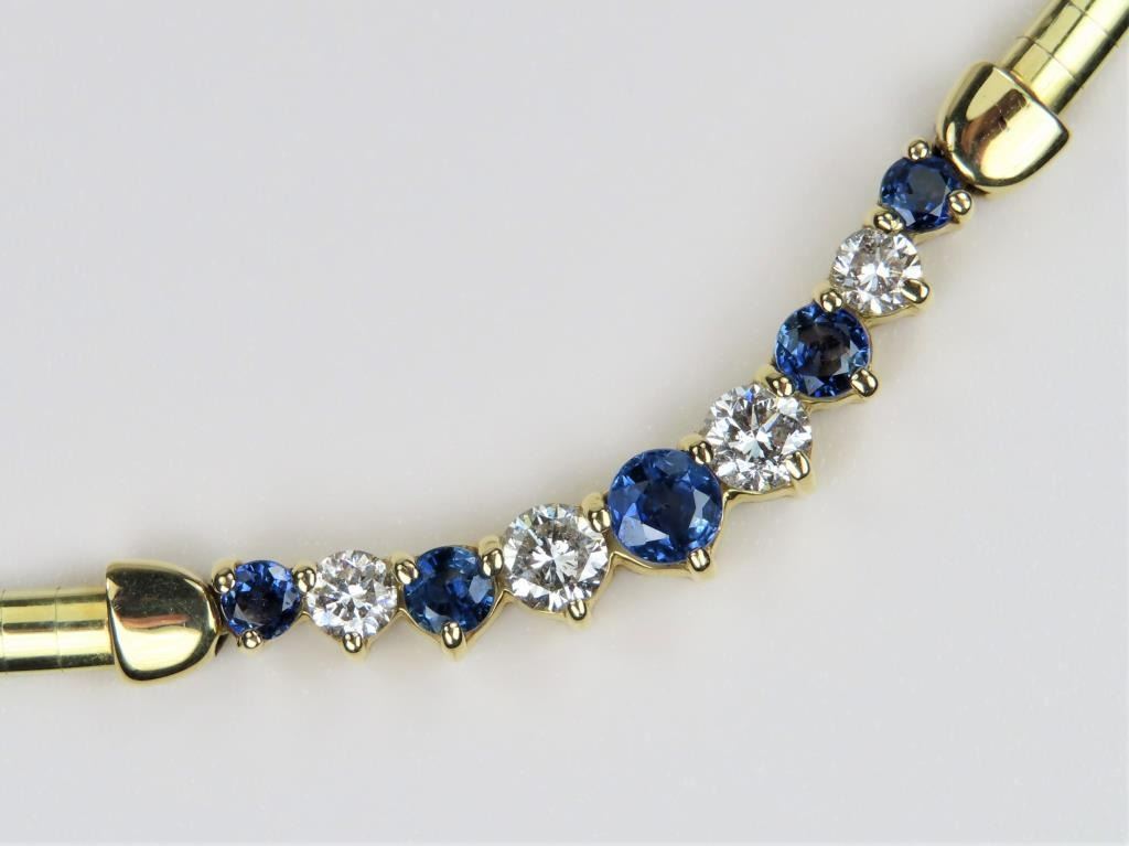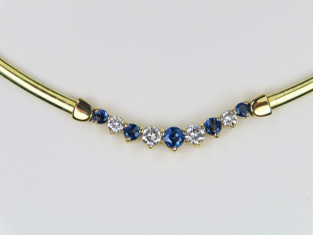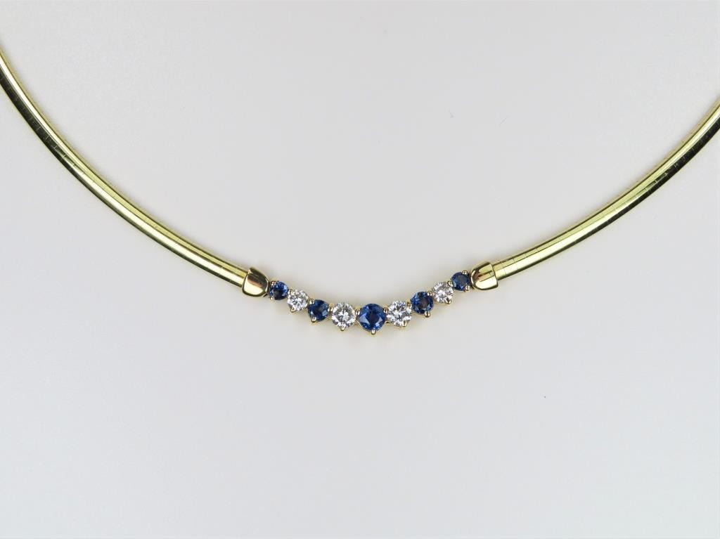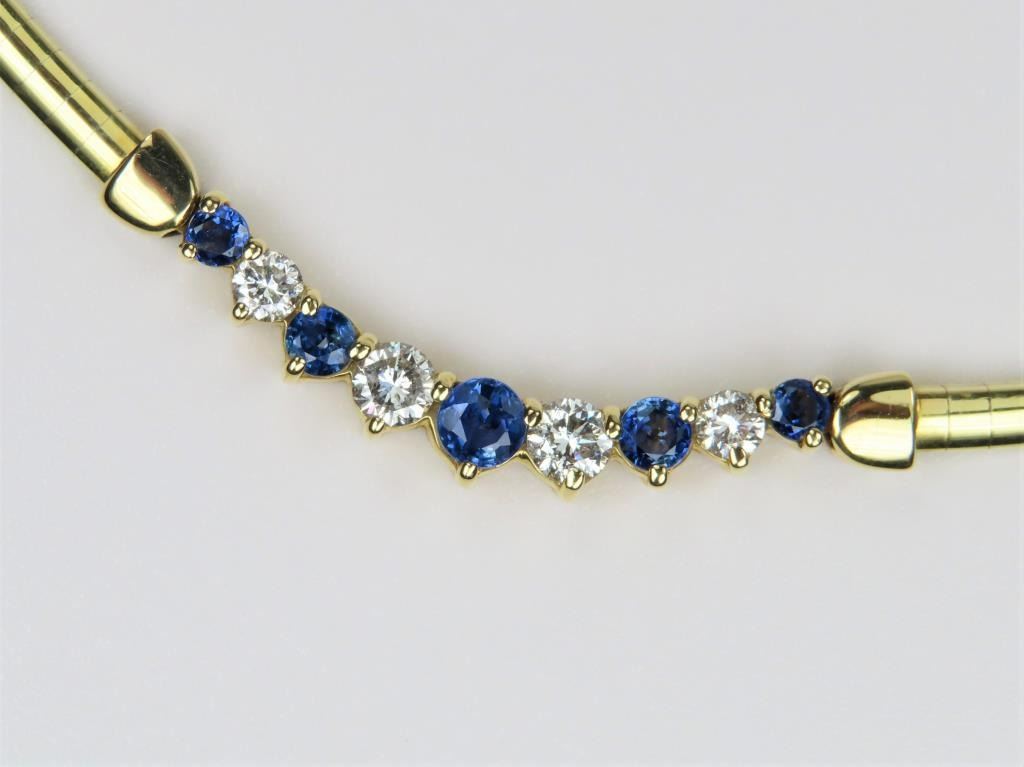 Necklace featuring 9 round cut Ceylon Sapphires and Diamonds with an approx. combined gem weight of 2.00 carats, Diamonds have G-H colors and VS clarity set in 14 karat yellow gold setting with a heavy 14 karat yellow gold OMEGA style chain with safety latch. Retail $5,000-$7,000
