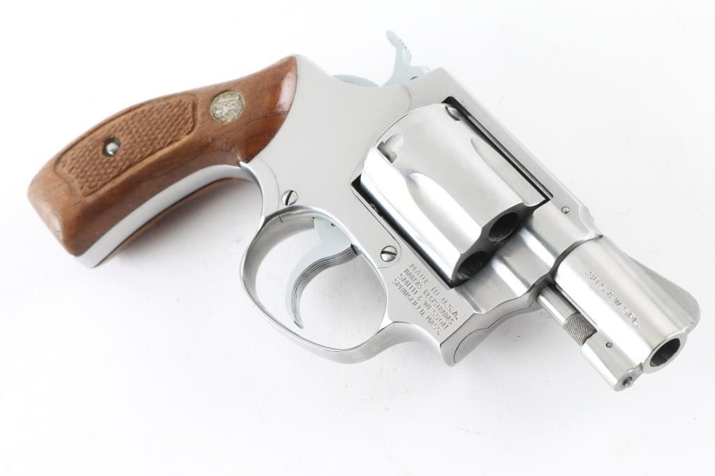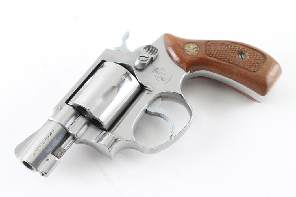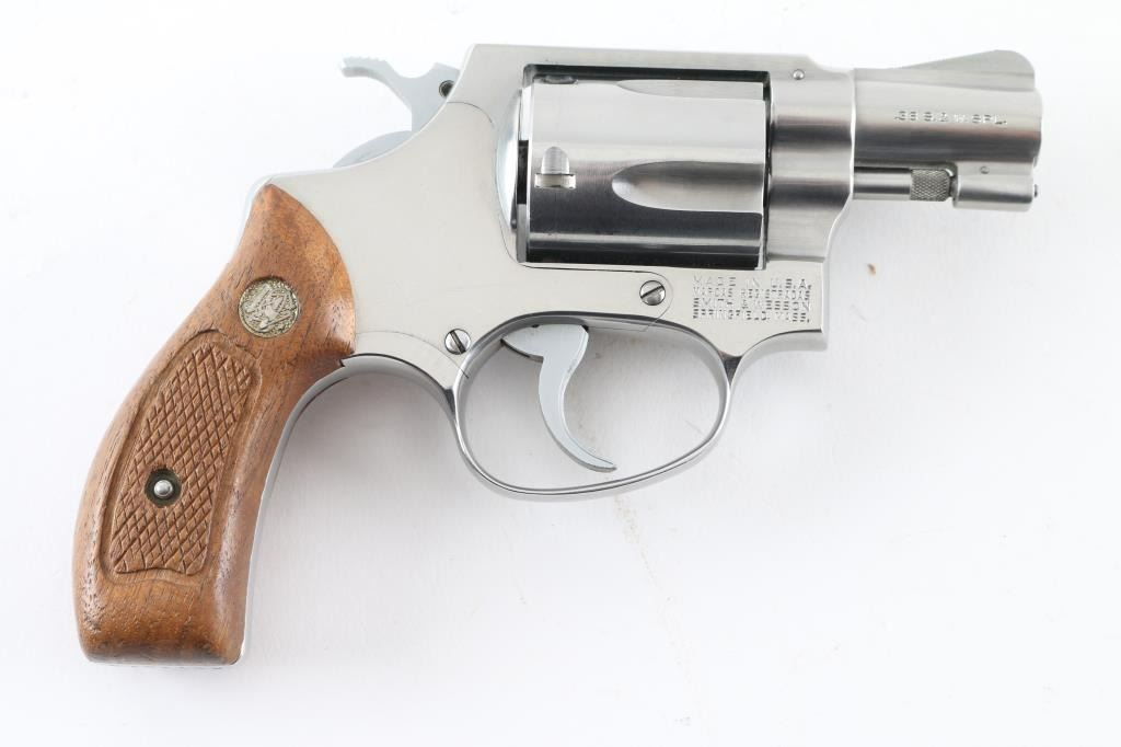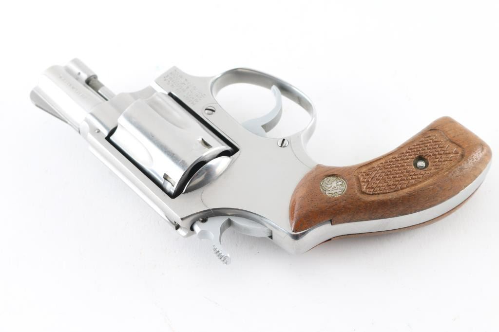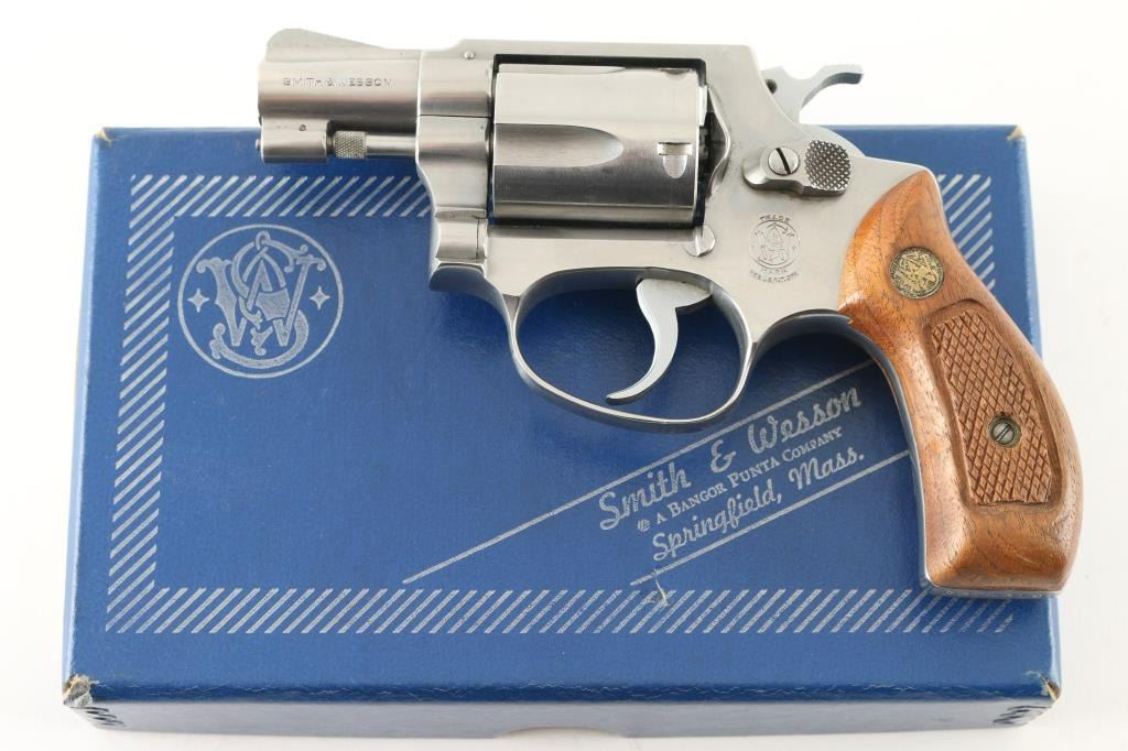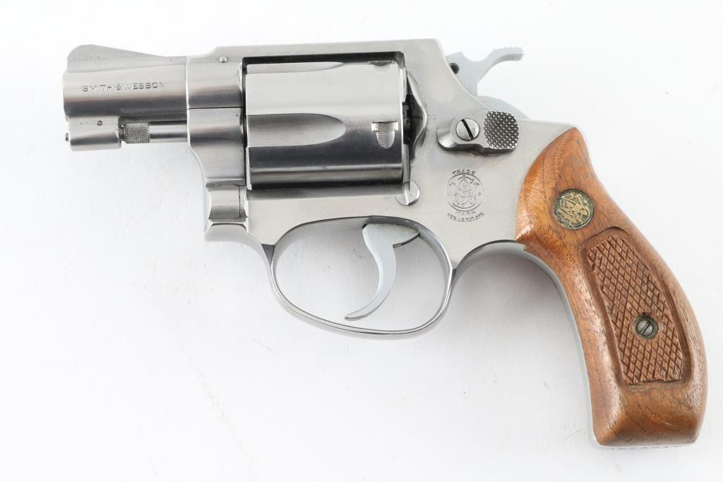 Pinned - No Dash. Compact double action revolver manufactured circa 1980. Features stainless steel construction, checkered wood Magna grips with S&W medallions, 1-7/8" barrel, fixed sights, round butt, "J" frame, 5 shot fluted cylinder. Overall condition is excellent with smooth operation and tight lock-up, few minor signs of handling. Grips are good condition with small dents, smoothing of checkering points. Includes factory cardboard box with paperwork & cleaning gear. Condition is near NRA Excellent *** Modern Firearm ***