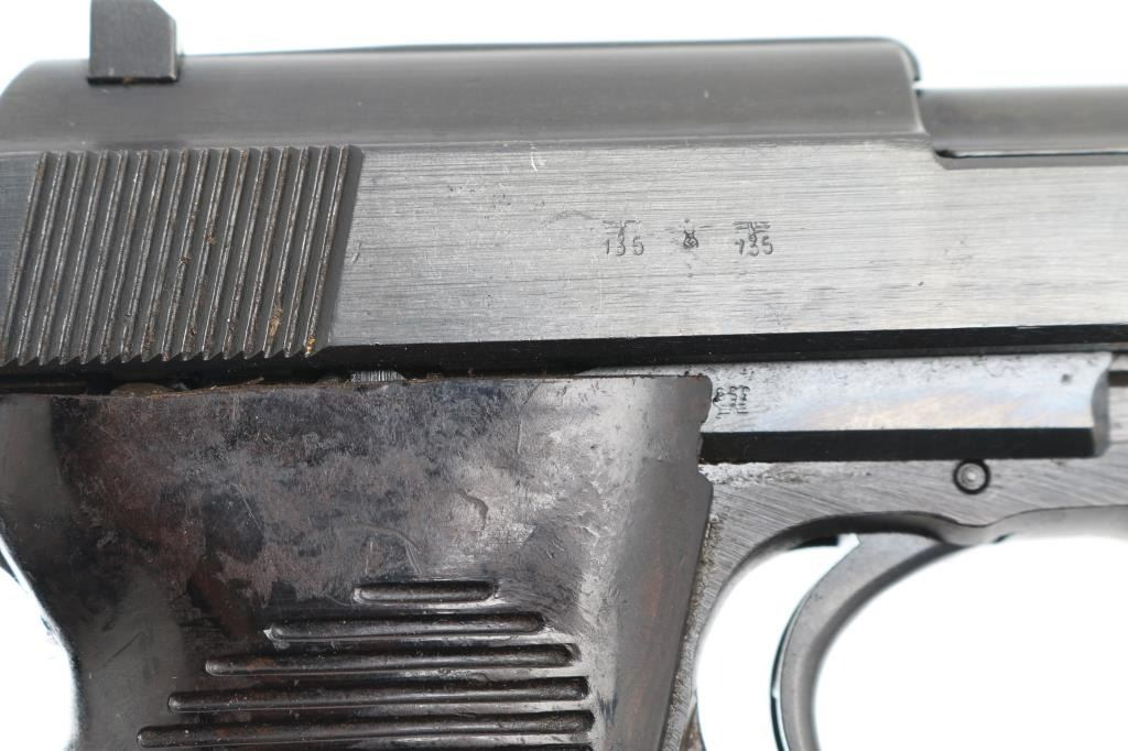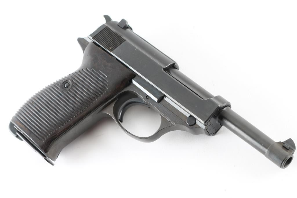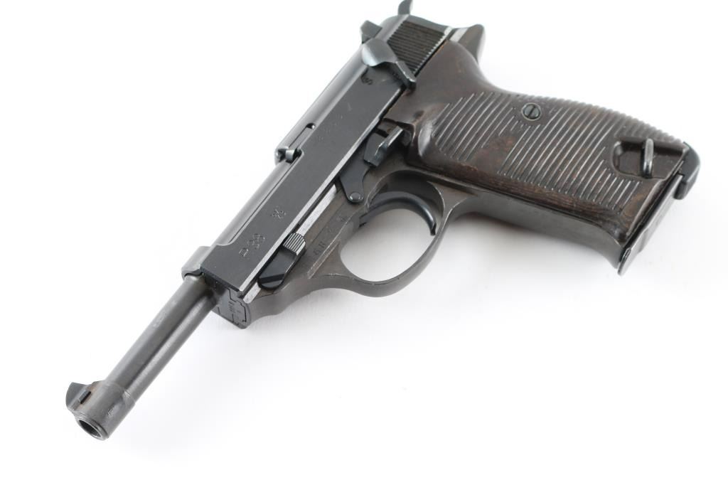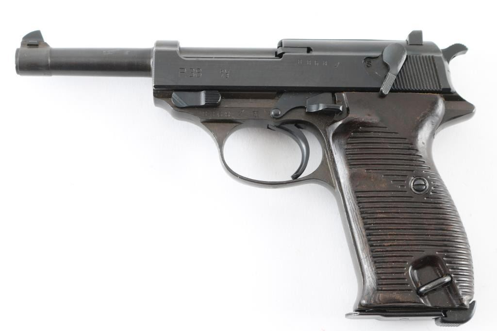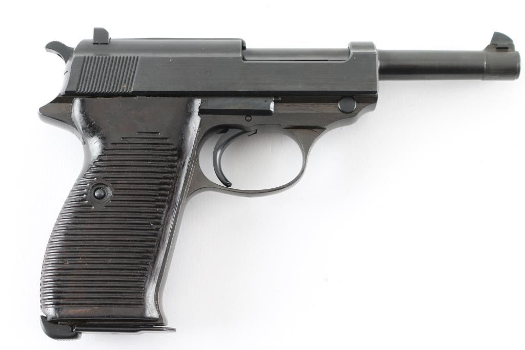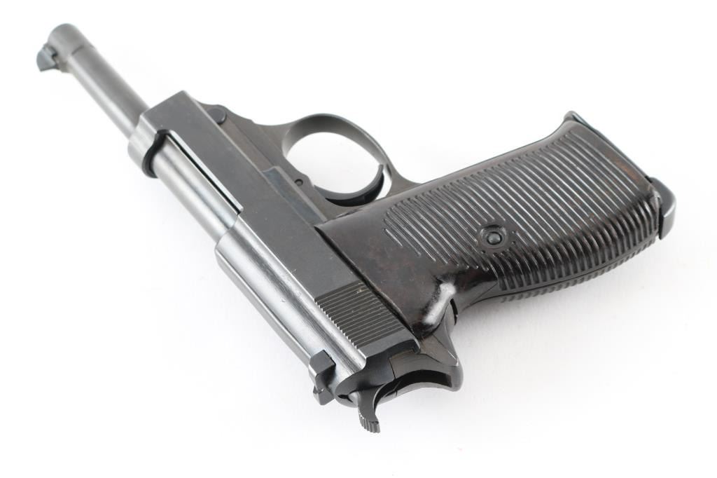 Pistol. Semi-Automatic. 8 rd Magazine. Third Reich era military issued sidearm. 4.9" barrel. Short recoil, hinged locking piece assisted breechblock. Has been dip-blued, possibly a Russian capture. byf 43. Matching serial numbers including the locking block. Correct Eagle/135 waffenamts. Bore is fair with rifling, but areas of pitting. Bakelite grips are good. Dip-blued finish is about 98%, some minor scratches. Original magazine stamped P.38 NRA Condition-Good./Dip-Blued C&R Firearm.