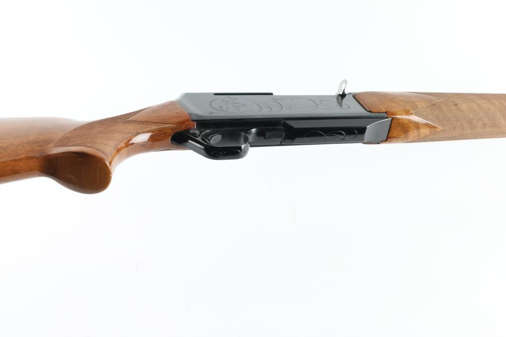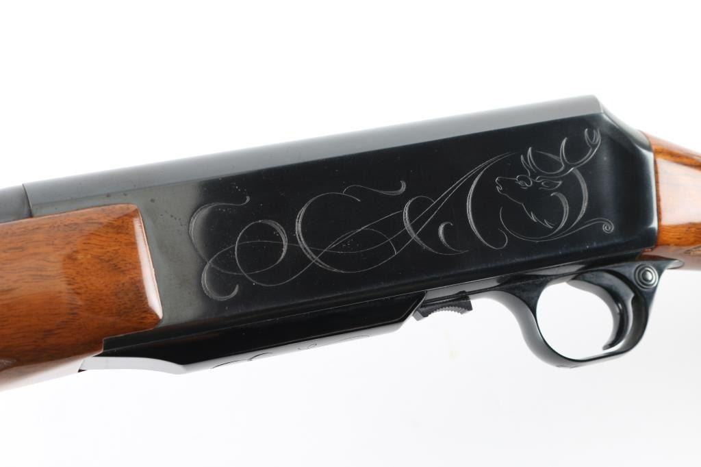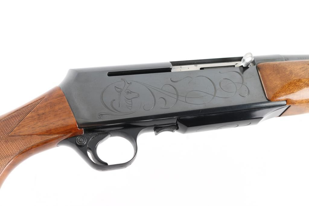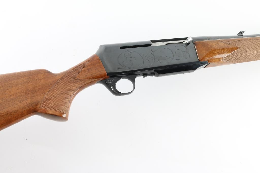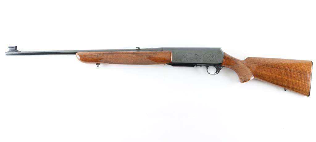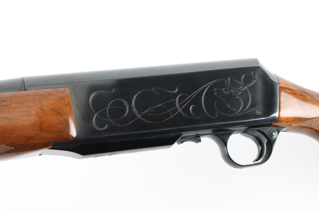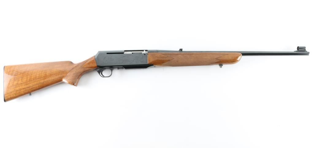 Gas operated semi-automatic sporting rifle chambered in .30-06 Springfield, manufactured in Belgium by Fabrique Nationale circa 1967 (first year production). Features a lustrous blued finish, 22" tapered round barrel, ramped & hooded blade front sight with brass bead, adjustable folding leaf rear sight, smooth trigger, alloy trigger guard with cross-bolt safety, hinged floorplate with removable 3 round magazine, factory drilled & tapped steel receiver with light coverage engraving, installed swivel studs, point checkered walnut forend with high gloss finish and semi-pistol grip shoulder stock with factory buttplate & 13 3/4” LOP. Rifle retains approximately 95% of its original blued finish showing light muzzle wear, some minor handling marks and a small amount of scattered light surface rust. Action is smooth with a crisp trigger pull, the bore is excellent, and the wood stocks are very good with scuffs, scratches & minor losses.
