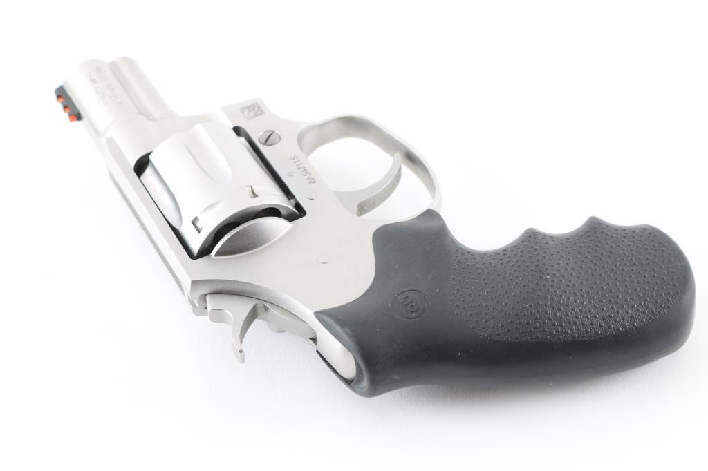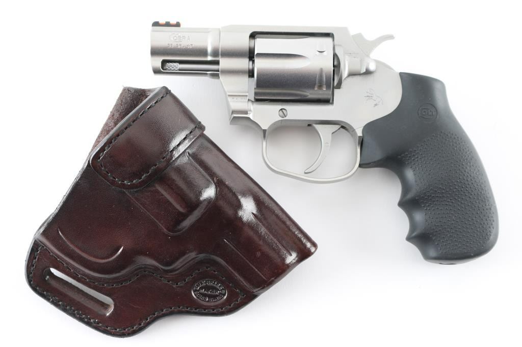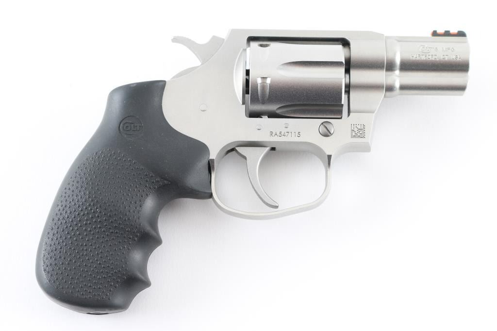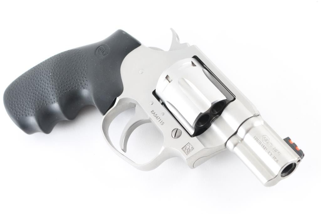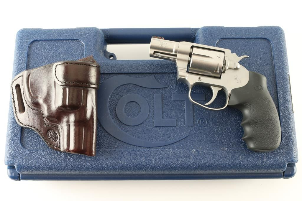 Double action revolver features a matte stainless steel construction, black rubber finger groove factory grip, 2" barrel with ejector rod shroud, front sight with red fiber optic insert, fixed rear sight channel in top strap, fluted 6 shot cylinder. Bore is excellent/bright. Appears near unfired, new condition with few handling marks. Smooth action with tight lock-up. Includes blue plastic Colt case with manual, lock. and brown leather belt holster. Condition is NRA Excellent - like new Modern Firearm