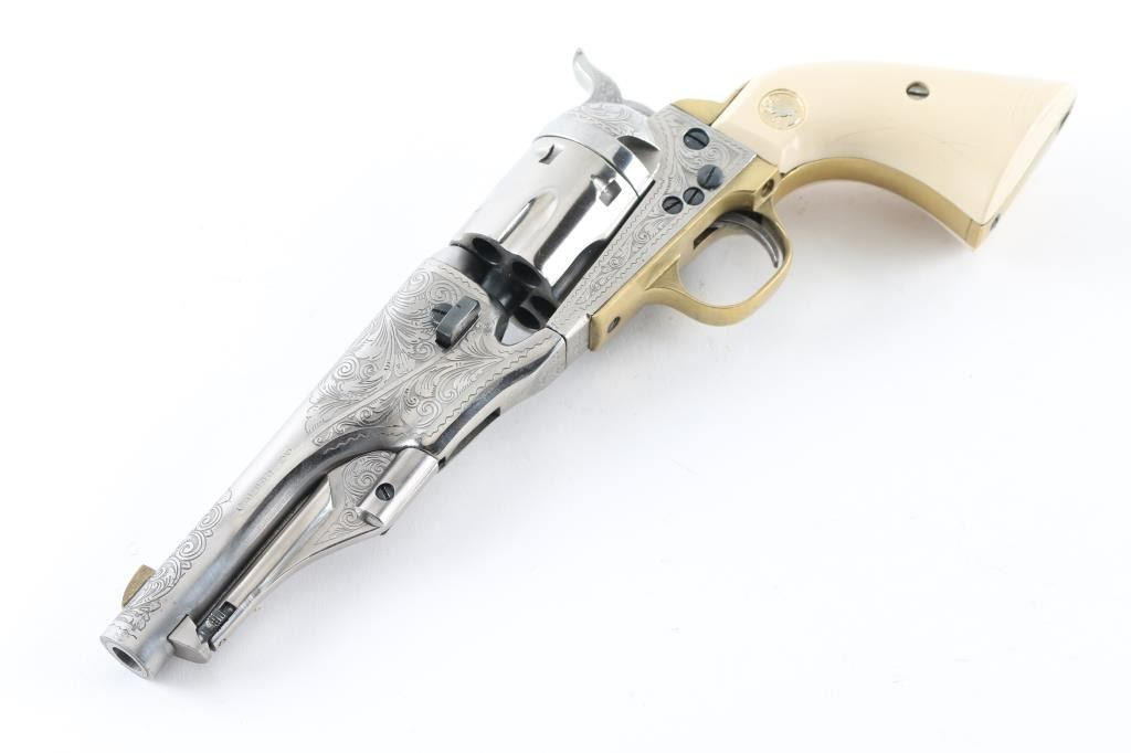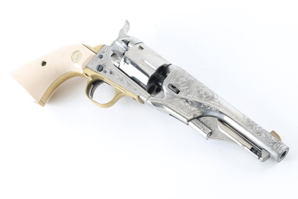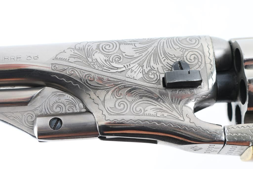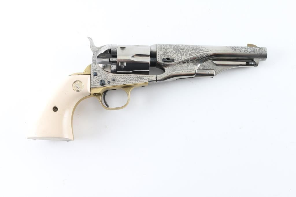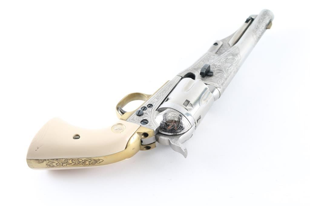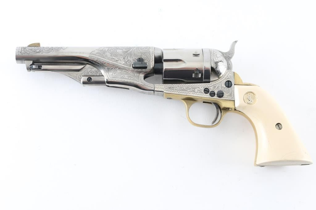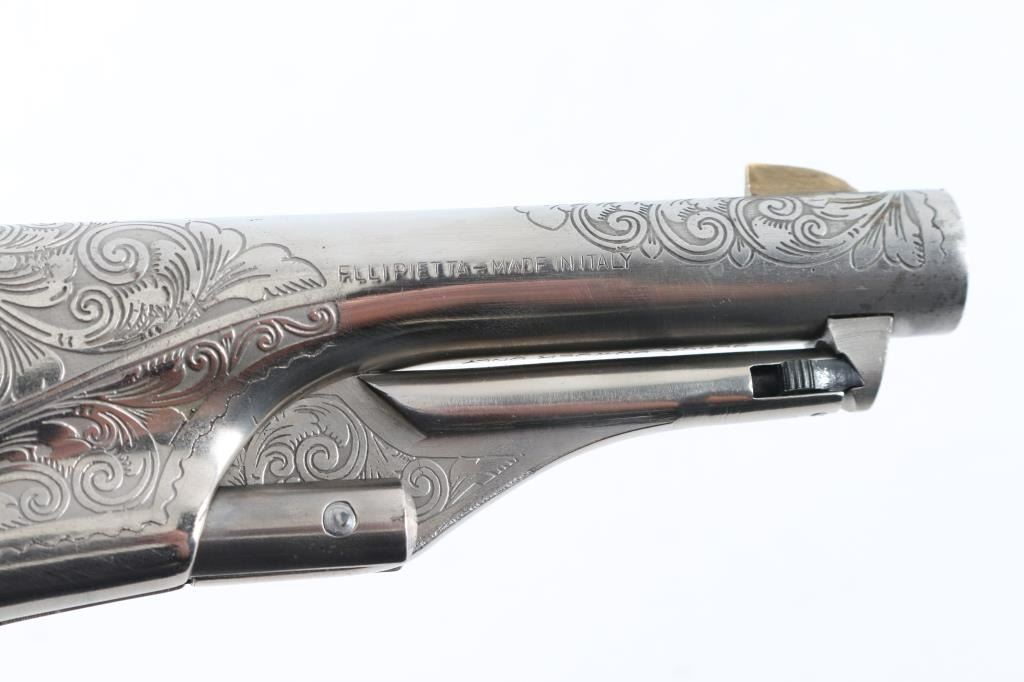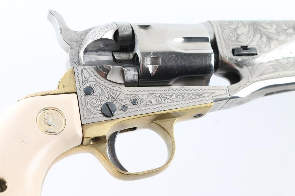Italian single action revolver chambered for 38 Special. Features 5.5" barrel, loading lever, blade front sight, "V" notch rear sight in hammer nose, brass triggerguard & back trap, nickel finish, smooth off-white polymer "faux ivory" two-piece grips with Colt medallions. Original black powder barrel marked "calibre 36" has a liner installed. Fluted 6 shot cylinder appears manufactured for cartridges, not a modified black powder part. Breech ring allows side loading, does not include a gate. Floral scroll engraving covers 75% of visible surfaces, no engraving on cylinder. Bore and charge holes are very good condition. Exterior appears like new with minor handling marks, some scratches or light crazing on grips. Condition is near NRA Excellent *** Modern Firearm ***