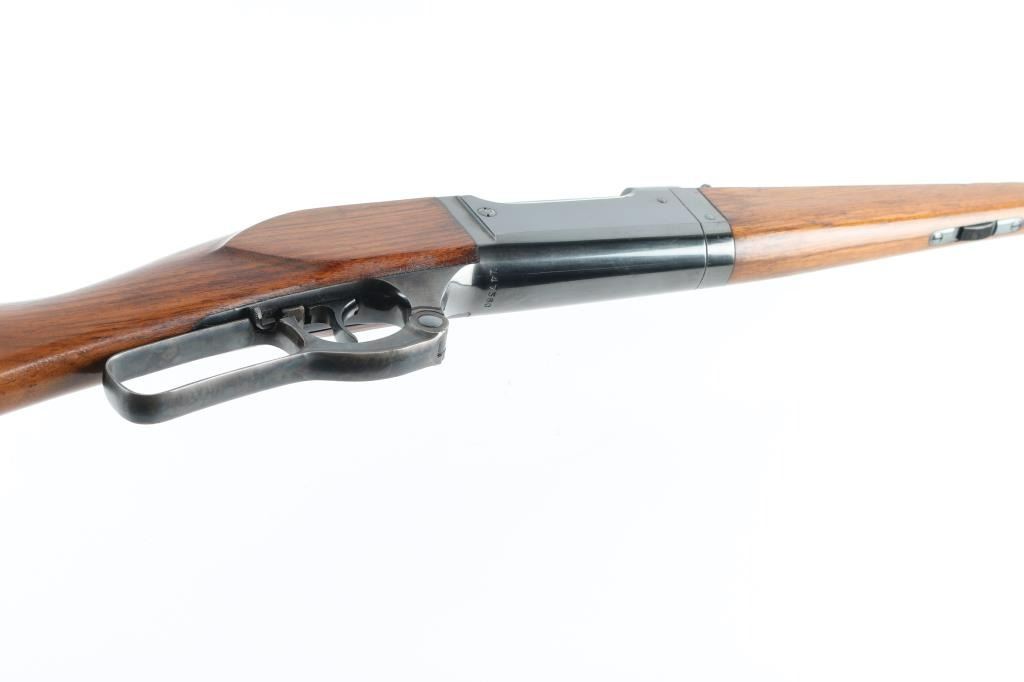 Take down lever action rifle manufactured circa 1913. Features blued finish, case color finger lever, smooth wood forend with schnabel tip, smooth wood shoulder stock with straight wrist, factory hard rubber buttplate, 20" barrel, blade front sight, sporting rear sight, fixed rotary magazine with brass cartridge counter, safety/lever lock behind trigger, cocking indicator. Forend has sliding release, and has metal lined socket to allow use as barrel removal tool. Bore is very good condition. Appears reblued, with slight dishing around screw holes, deep shiny black color on receiver, barrel a bit brown toned, overall 98% coverage. Finger lever retains very good case color. Wood is very good, varnished, with minor blemishes, light oil staining at wrist and next to receiver. Condition is NRA Excellent (as refinished) *** C&R Firearm ***