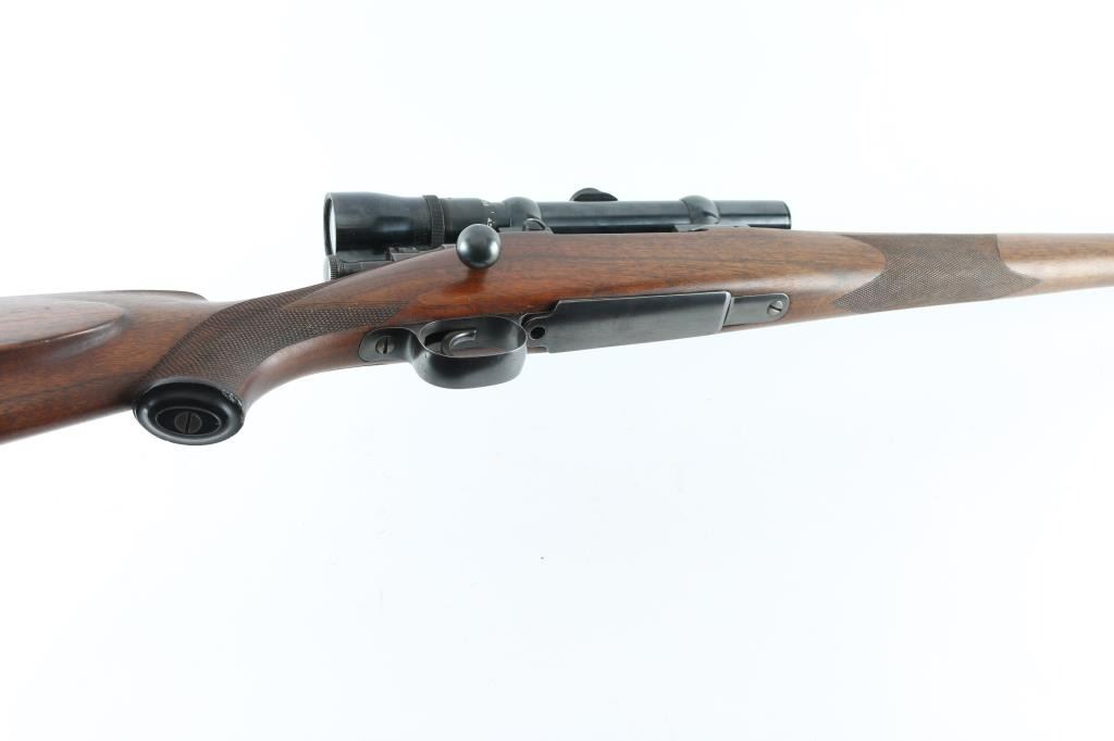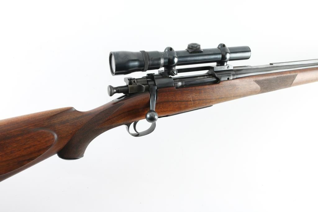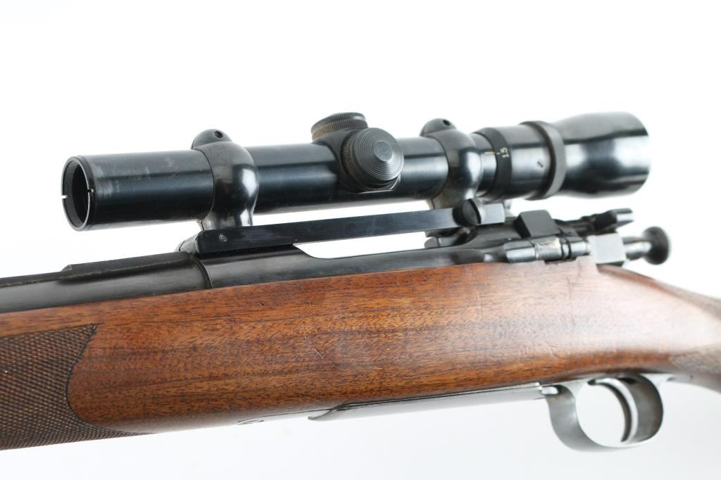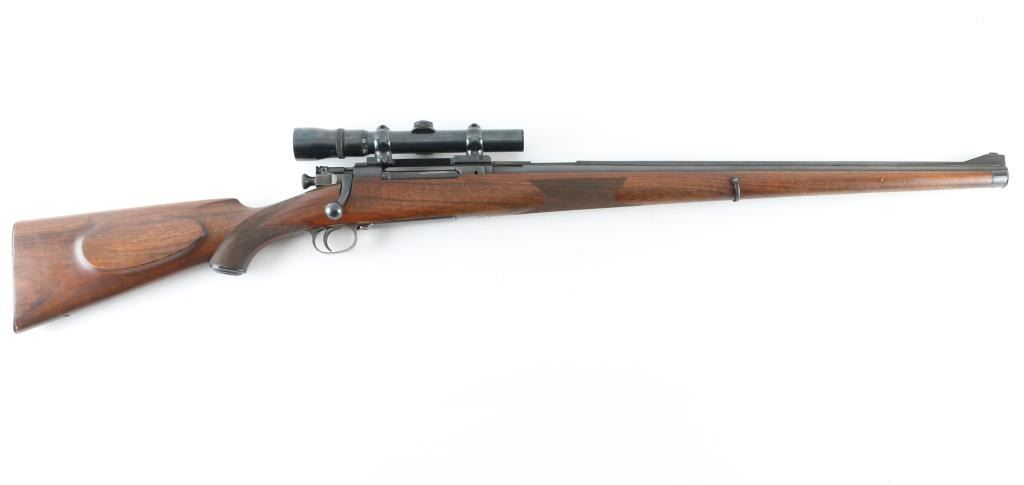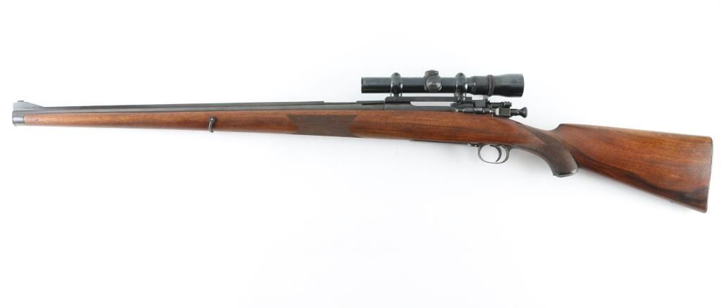 Custom U,S, bolt action rifle . Features blued finish, full length Mannlicher fancy figured walnut stock with left handed cheekpiece, steel forend cap at muzzle, checkering at wrist & forend, black plastic recoil pad, 24" barrel, with sighting rib ramped post/bead front sight, no rear sight, hinged floorplate, narrow flat steel sling swivels, manual safety. Hole for sling swivel in buttstock. Mounted with a vintage Weaver V4.5 scope with Buehler base and rings. Clear optics, Bore is excellent. Overall condition is near excellent, with few handling marks. No visible markings. A really nice job. Condition is NRA Excellent C&R Firearm