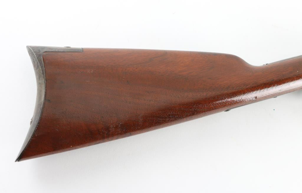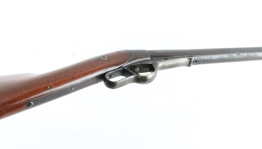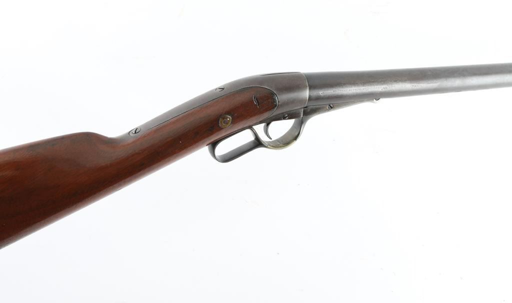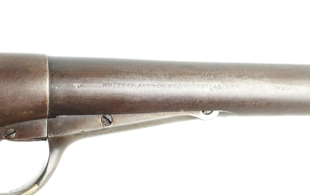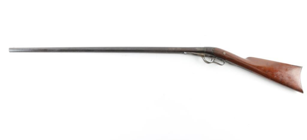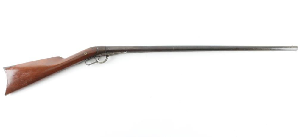 Scarce Whitney-Howard "Thunderbolt" single barrel lever-action shotgun, circa 1866-68. Unusual action that slides the bolt back on the bottom of the frame for loading a single shell. Working the lever also cocks the action, and closing it readies for fire. Ultimately, the action proved not to be strong enough, and production ceased with only about 200 shotguns being produced. One source states only 11 known examples exist. Marked on the right side of barrel, " Whitney Arms Co, Whitneyville, Conn", and left side, "Charles Howard Patents of Sept 26 and Oct. 10 1865 and May 15 1866" 30" barrel, Bead sight. Crescent buttplate. smoothbore appears very good/bright. Blued finish is turning A gray/brown patina. Traces of blue remain of the buttstock. Barrel markings are faint, but readable. Wood is very good, and has been re-finished. Action works well. There is an old braise repair to the triggerguard. A very scarce American made firearm. NRA Condition-Near very Good. Antique Firearm.