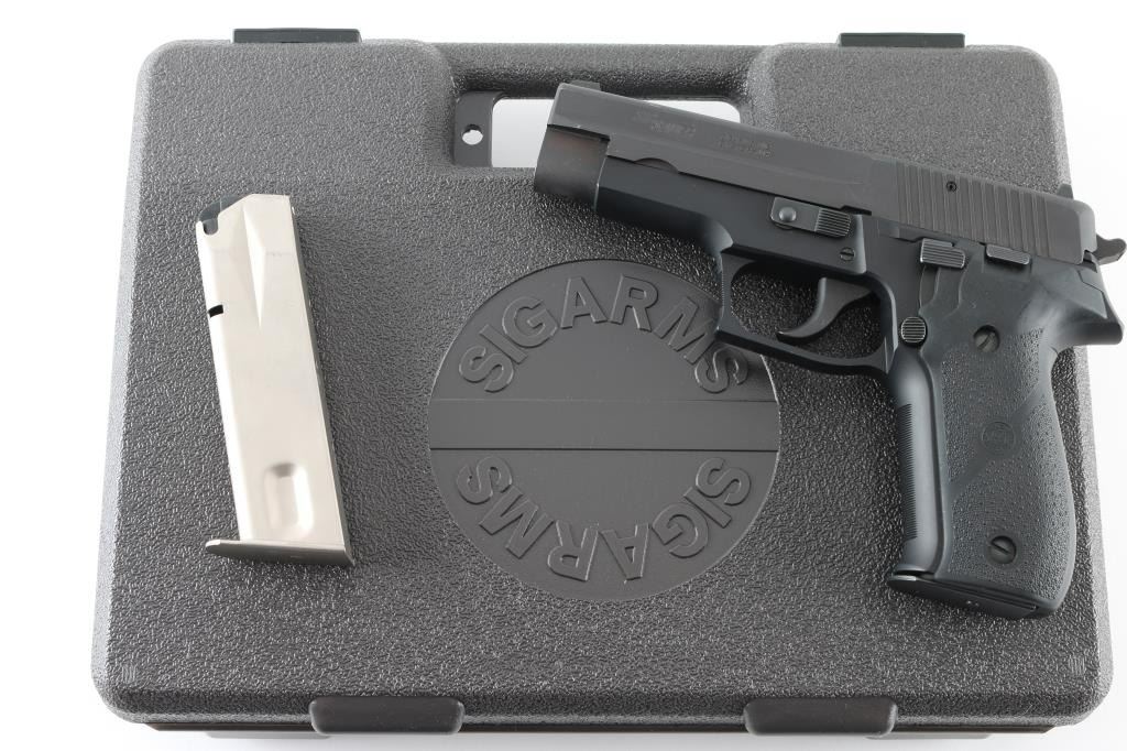 'Made in W Germany' Semiautomatic pistol, imported by SIGARMS, Exeter NH. Features matte black alloy frame, matte dark gray slide, 4.25" barrel, white dot front & white bar rear sights in dovetails, frame mounted decocking lever, double/single action, pushbutton magazine release, Hogue black pebble grained rubber grips. Bore is very good. Retains 95% finish with some scuffs, bare metal showing on a few sharp edges and on barrel hood. Grips are very good. Includes factory hard case, manual, spare magazine (2 total). Condition is NRA Very Good++ *** Modern Firearm ***