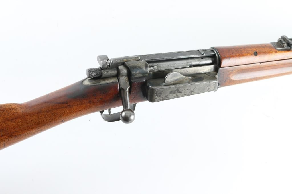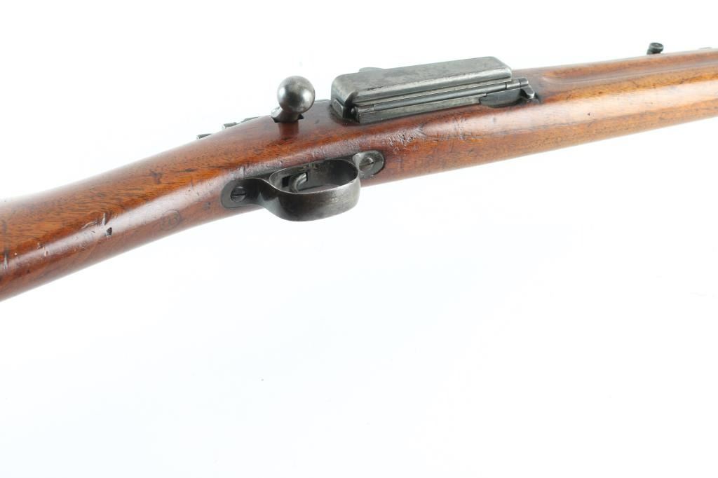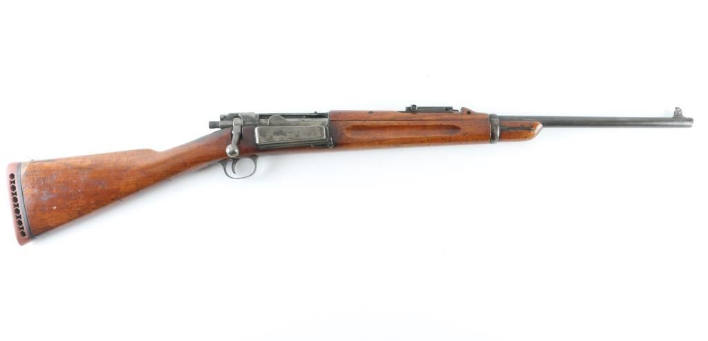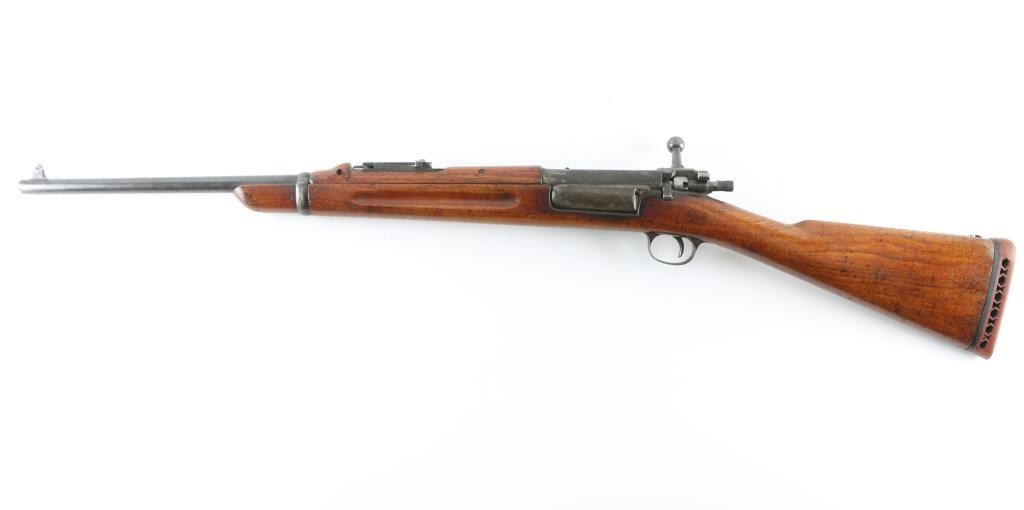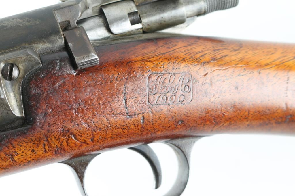 SN: 287406 US military bolt action rifle. Appears to be an actual carbine not a cut-down rifle. Features blued or blackened finish, 22" barrel, pinned blade front sight, model 1901 rear sight (marked "C" in three places), proper carbine handguard and barrel band, manual safety, magazine cut-off. Stock appears to be an original carbine stock, has had holes drilled front & back (appears to have previously had screw-in swivels). Cocking piece is cylindrical with knurled surface. Butt has a recoil pad installed, with top portion of steel buttplate retained, might possibly be restore-able. Bore is good condition, lightly frosted and slightly dull, strong rifling. Retains 40% finish, bluing on barrel turning gray, other parts showing much bare metal or a dull medium gray color, with traces of old finish. Wood is good condition, many dings and scuffs, lightly sanded, light coat of varnish. 1900 dated cartouche present, also "P" in circle stamp under wrist. Recoil pad is hard. Condition is NRA Good+ (as modified) *** C&R Firearm ***